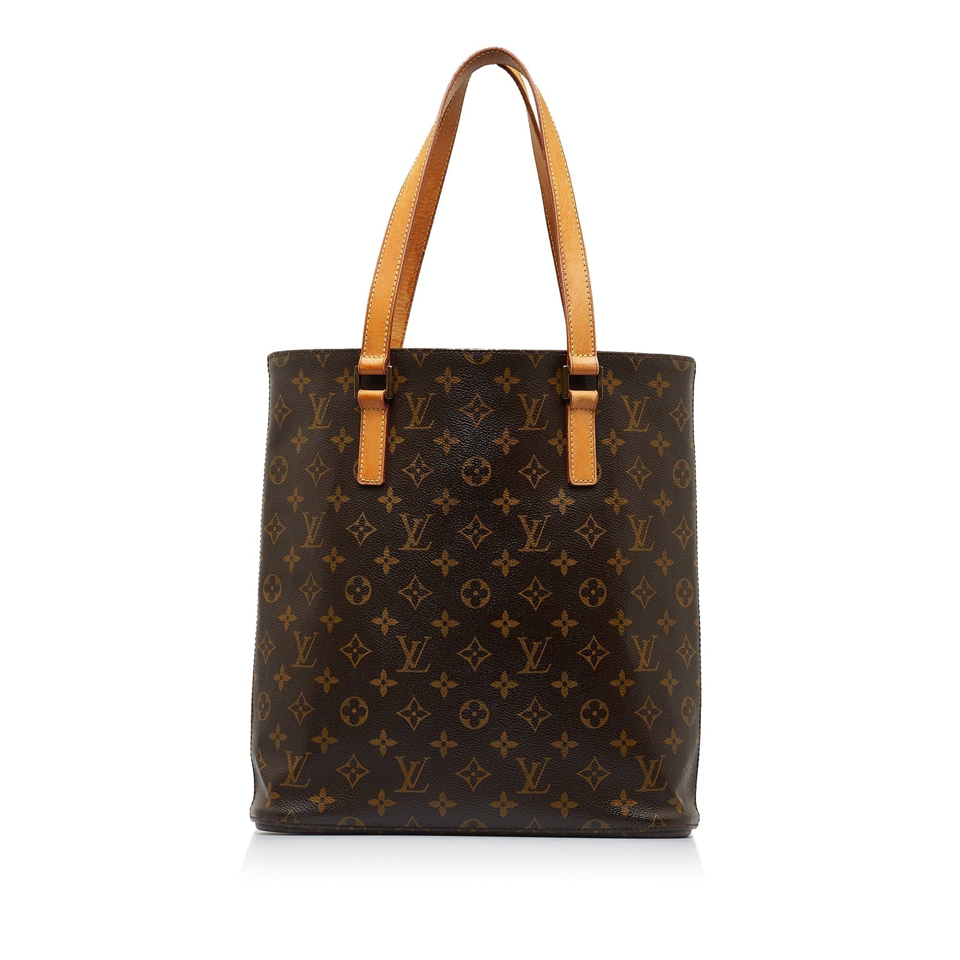 The Vavin GM features a monogram canvas body, flat vachetta leather straps, interior compartments, and an interior zip closure.