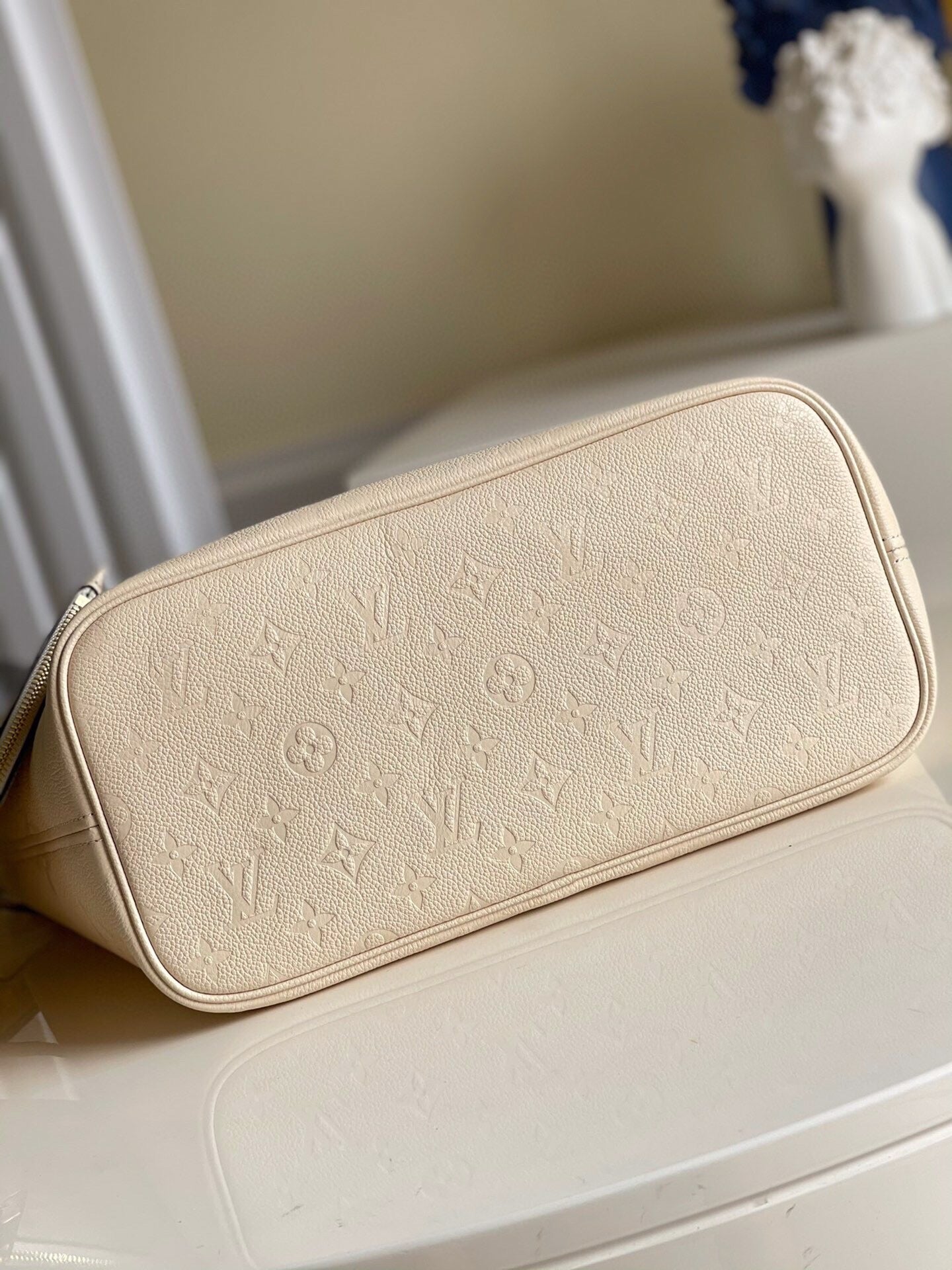 The essential Neverfull MM tote now comes in embossed Monogram Empreinte leather. Its generous dimensions make this bag ideal for everyday use while the long shoulder handles and supple leather mean it’s comfortable to carry. With the side laces cinched, this roomy carryall becomes a stylish city bag. It can be over the shoulder or on the elbow.
