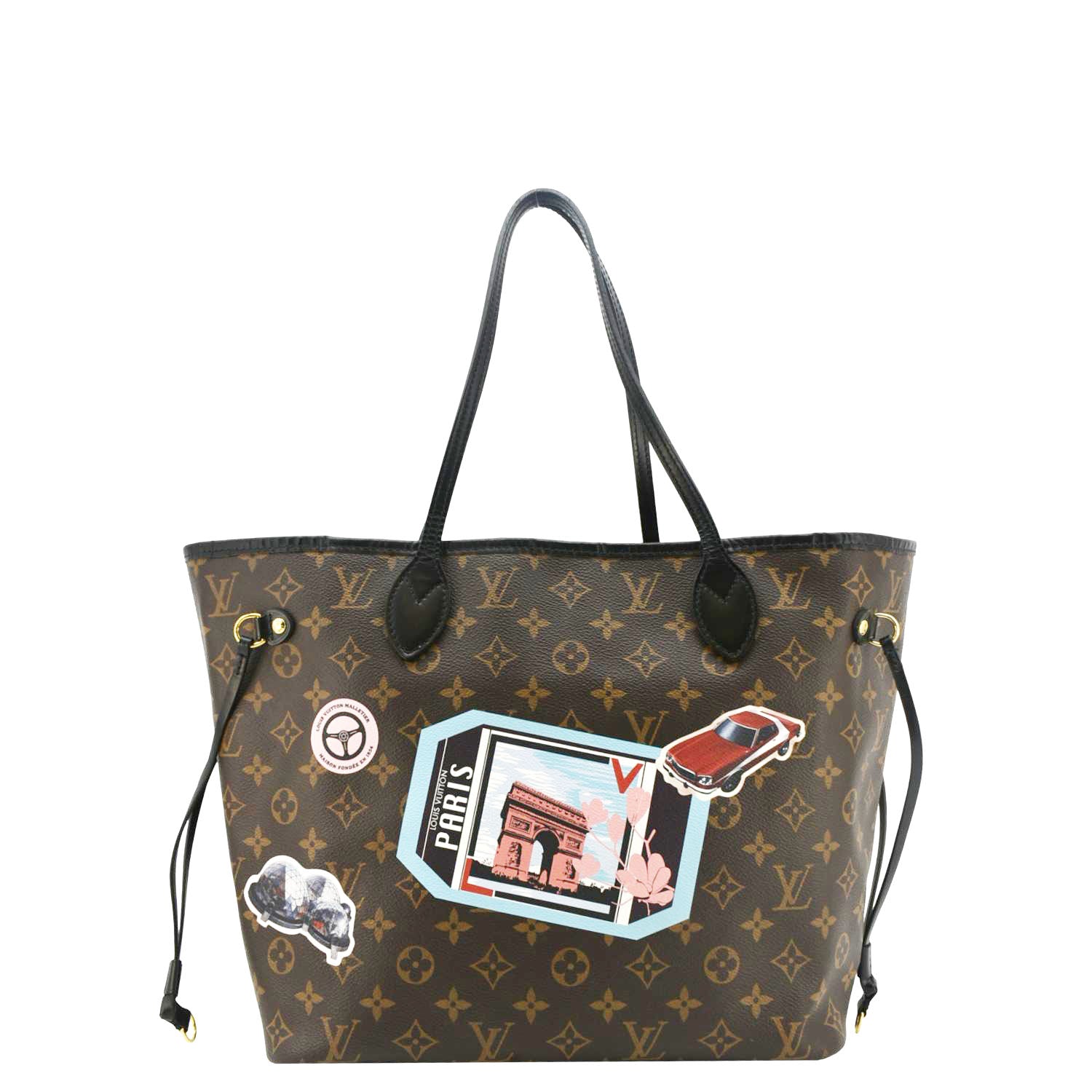 The Louis Vuitton World Tour Neverfull MM Monogram Canvas Tote in brown features the iconic LV monogram with playful, travel-themed patches. This versatile and spacious shoulder bag combines functionality with a touch of global charm.