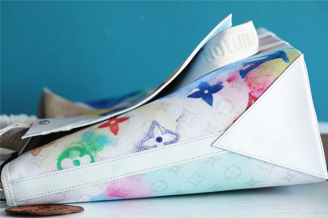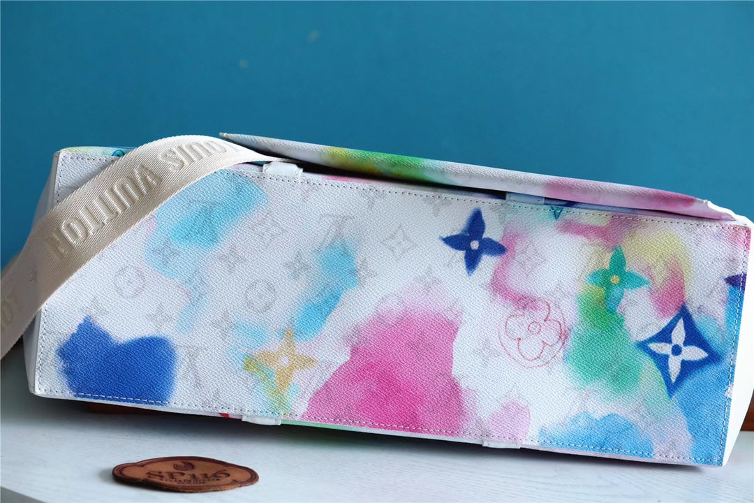 Inspired by the House’s Week-End city bag from 1974, Virgil Abloh created the New Tote GM in Monogram Watercolor Multico canvas, on which the iconic Monogram pattern is rendered in a colorful pastel watercolor treatment. A roomy bag, it features flat handles for hand and shoulder carry as well as a removable strap signed Louis Vuitton.