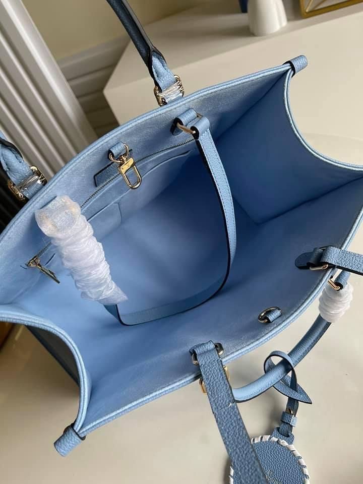 Made from a Monogram Empreinte leather with a subtle colour gradient on the embossed Monogram pattern, the emblematic OnTheGo MM tote bag is part of the By The Pool capsule collection. It has two sets of handles, long and short, for hand and shoulder carry and a spacious interior, which easily fits essentials such as a laptop. A leather charm gives a playful spirit and highlights the LV craftsmanship.