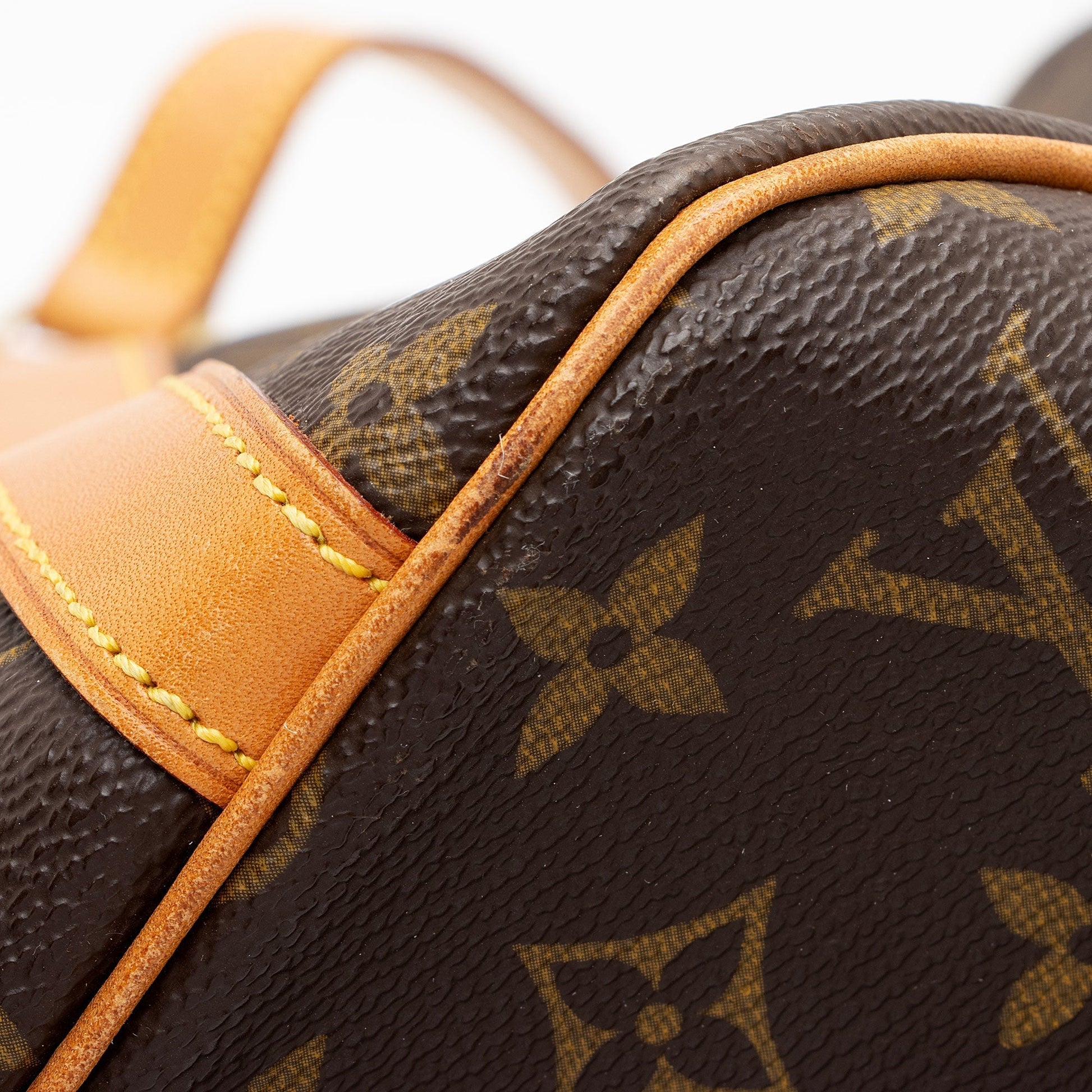 Condition Notes: Marks, scuffs, darkening, and light creasing throughout exterior leather trim and shoulder straps. Light wear throughout shoulder strap casing. Light scuffs and wear to exterior bottom corners. Minor marks throughout exterior coated canvas. Light surface scratches to hardware. Light wear throughout interior.