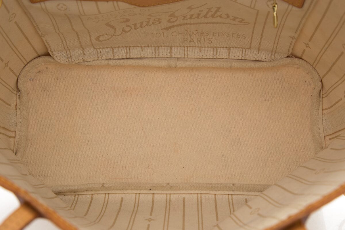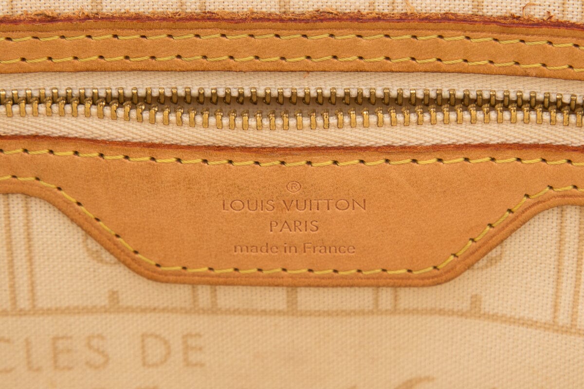Louis Vuitton White Neverfull Damier Tote PM. This item is vintage and in good condition; some discoloring to leather trim as well staining on lining.