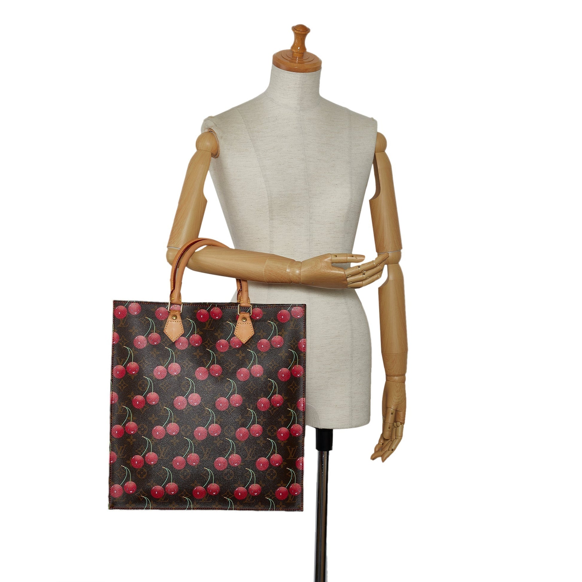 The Sac Plat features a monogram cerises canvas body, rolled vachetta leather handles, an open top, and interior slip pockets. Comes with dust bag