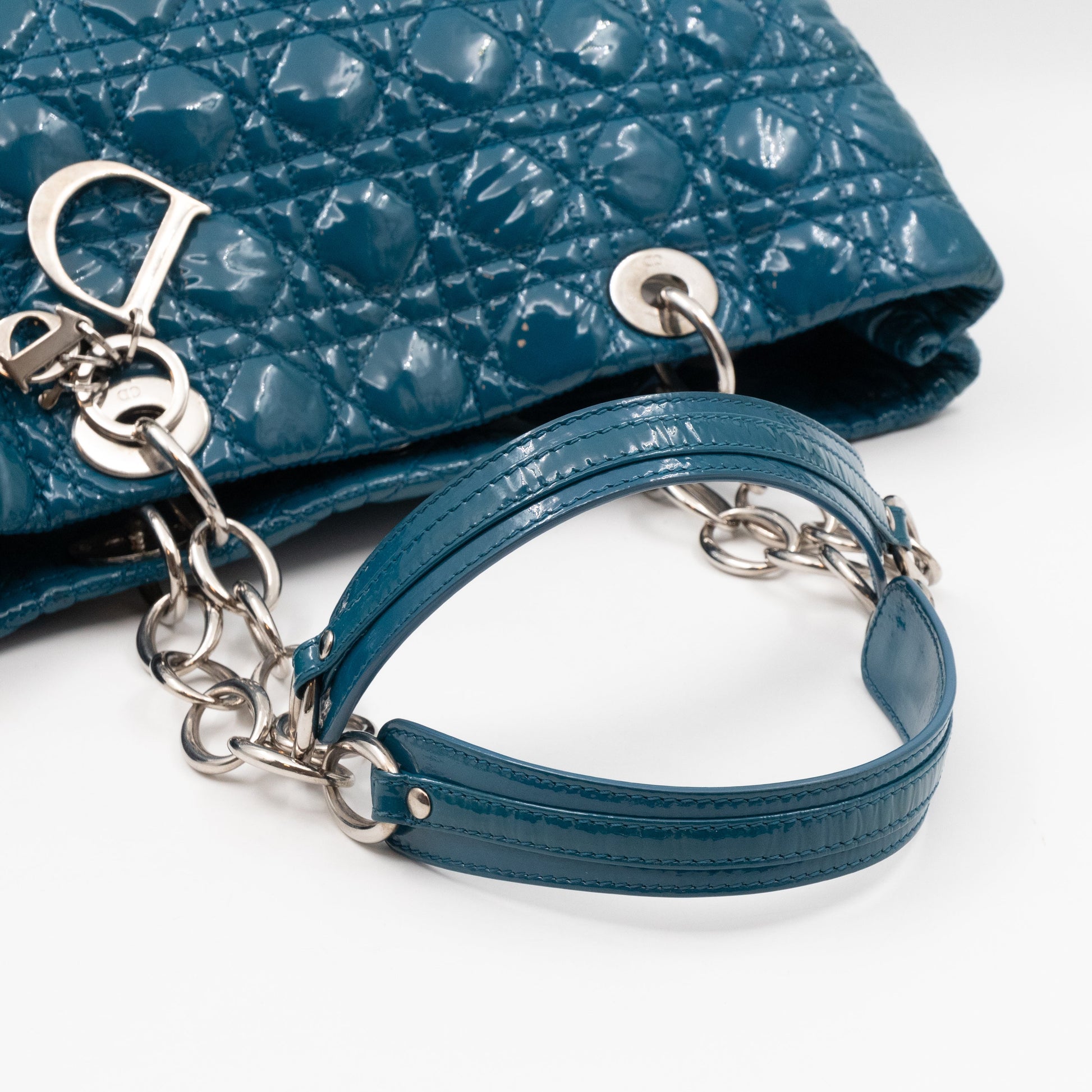Medium Soft Shopping Tote by Christian Dior. Made with colorful blue patent leather and silver toned hardware. Beautiful shoulder bag for everyday use with three large sections, one with a zipper and two with magnet closure. Inside a smaller zipper pocket. Has chain handles with leather pads for comfortable carrying.