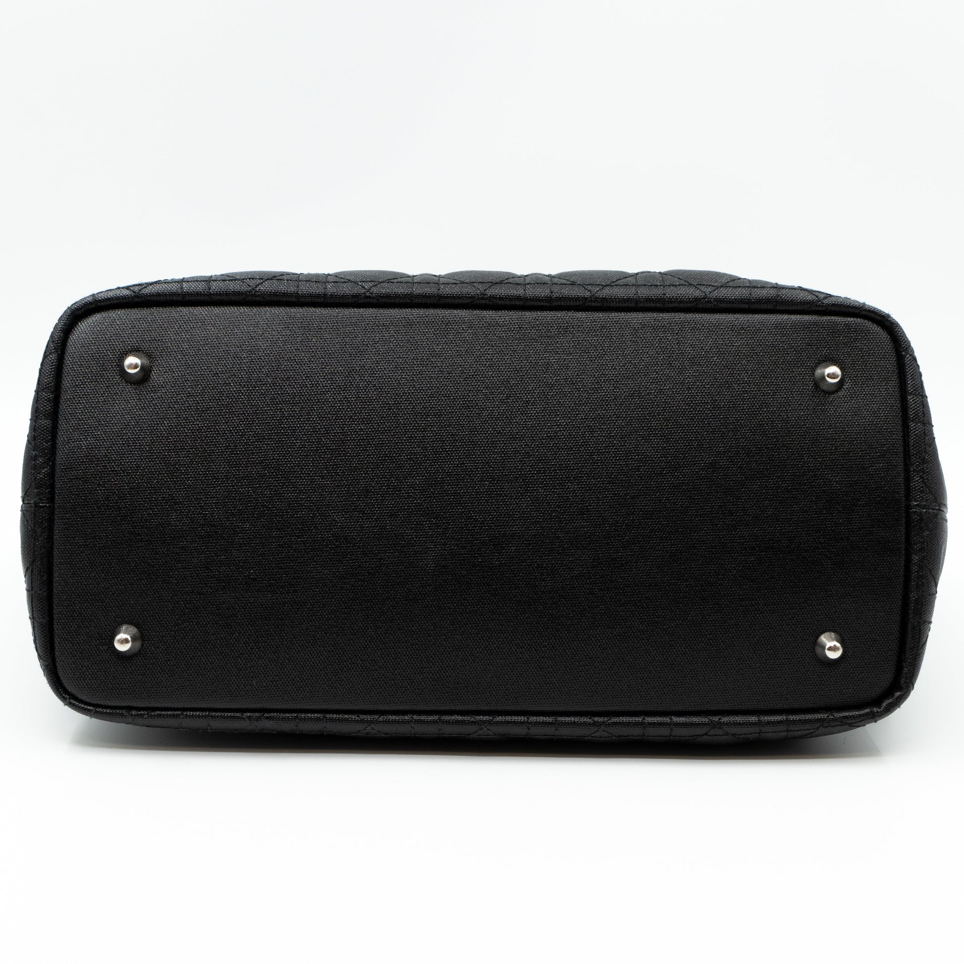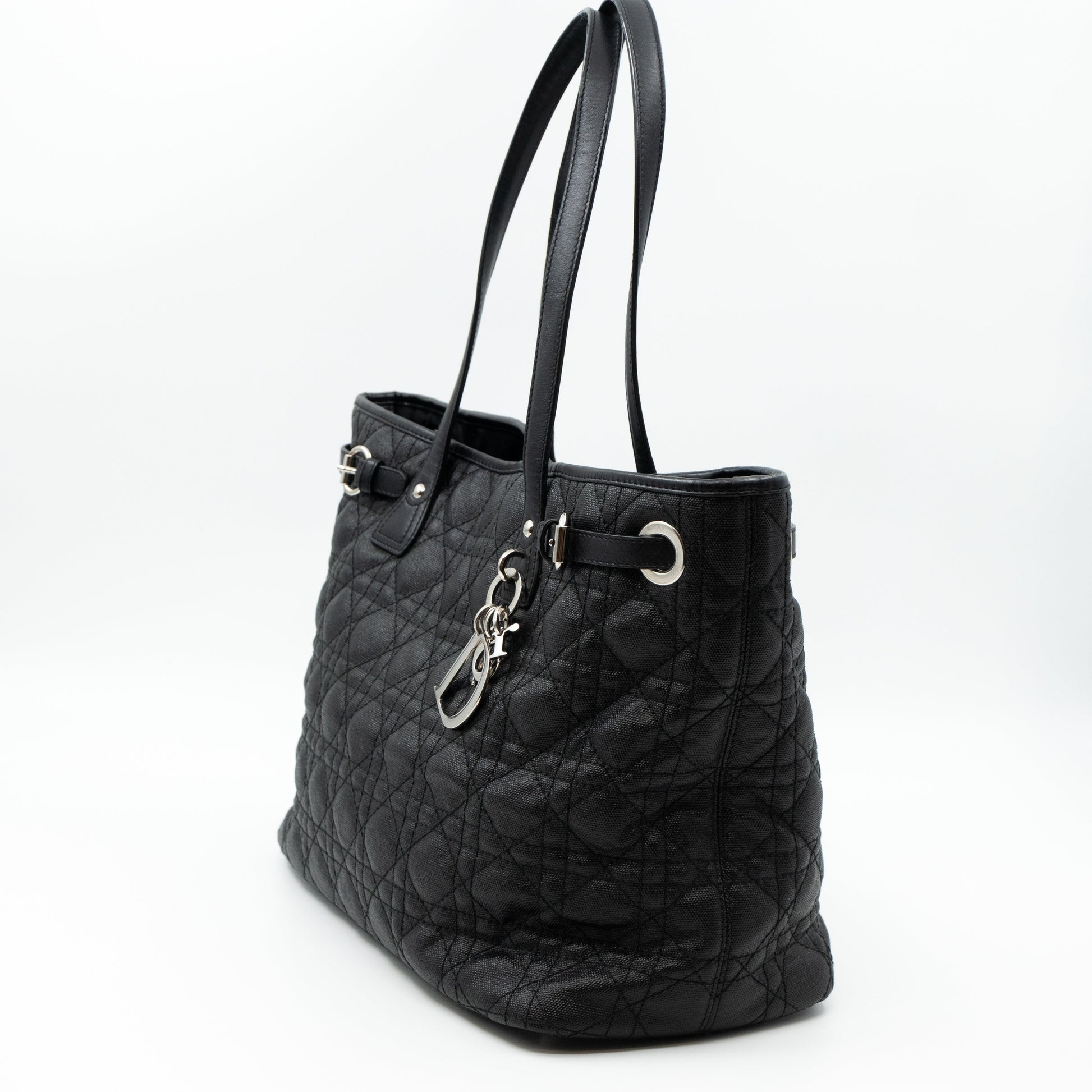 Panarea tote bag in medium size from Christian Dior. Made in black quilted cannage coated canvas that is durable for every season. Medium size and long handles, a great shopper for daily use. In front Dior letter charms. Each side can be turned inwards with the clip lock in the middle for a more compact size.