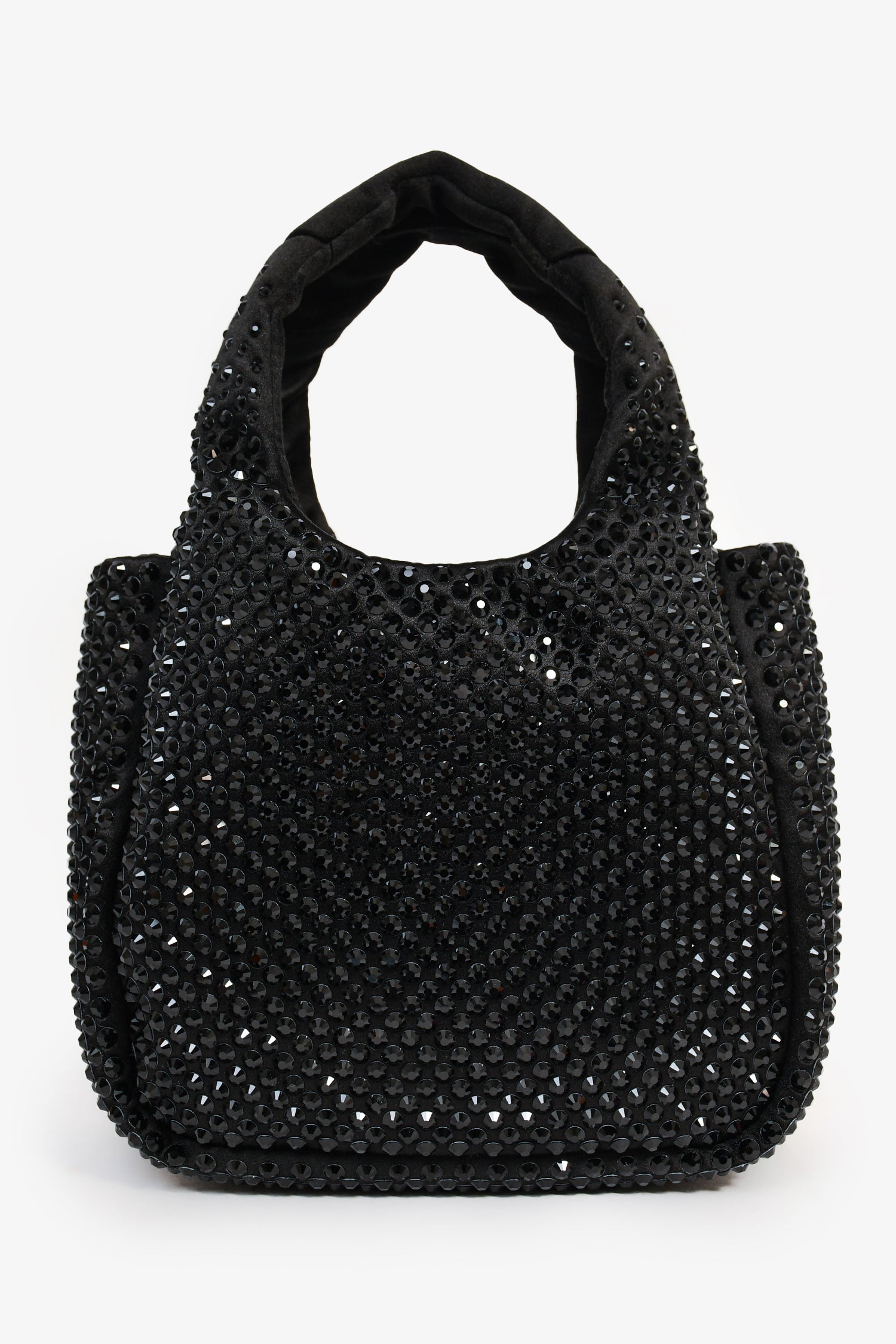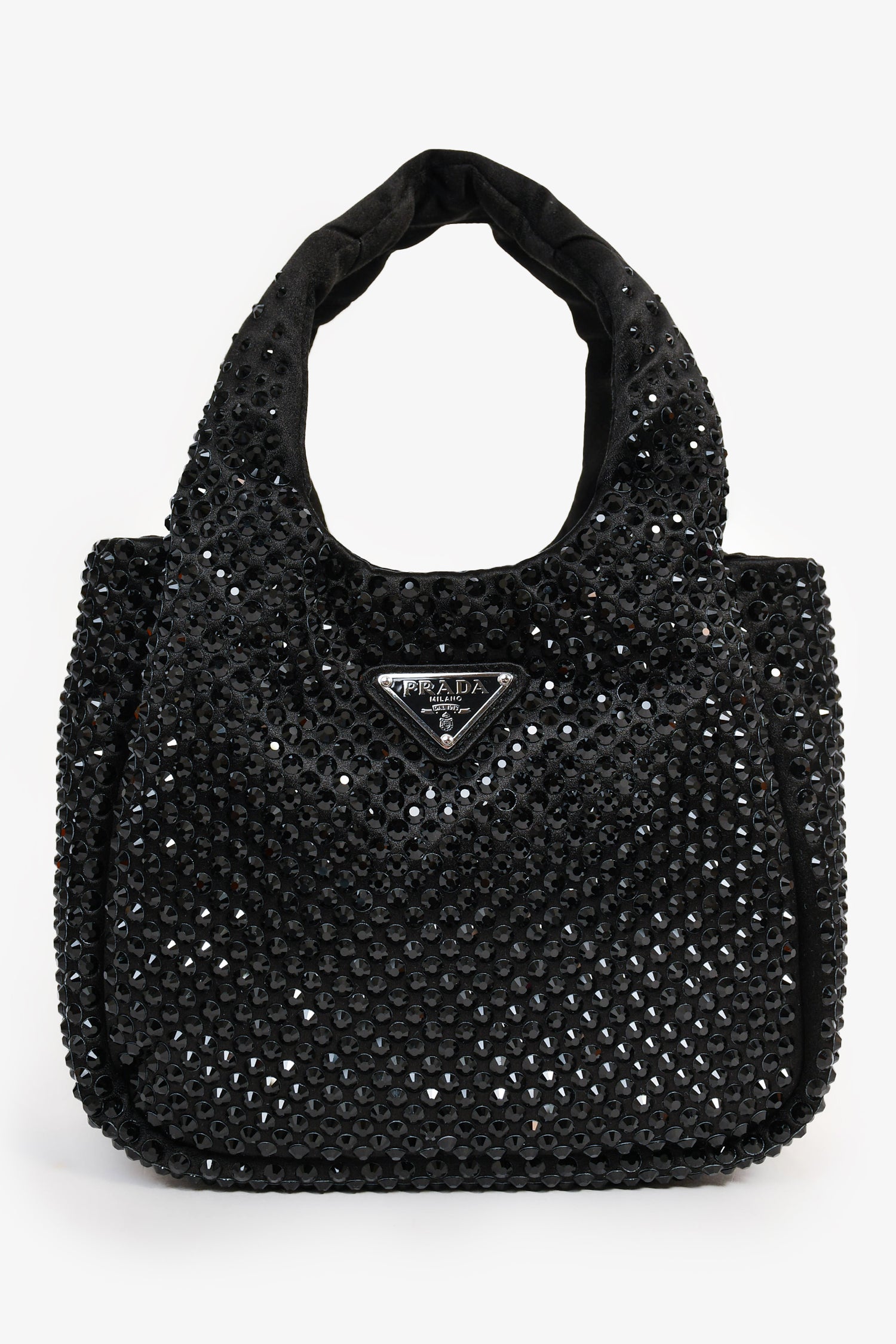 Prada 2024 Holiday Black Satin Crystal Top Handle Mini Tote Bag. Black-tone crystal embellishment. Satin-lined interior. 3 interior compartments. Concealed snap closure. Tonal stitching.