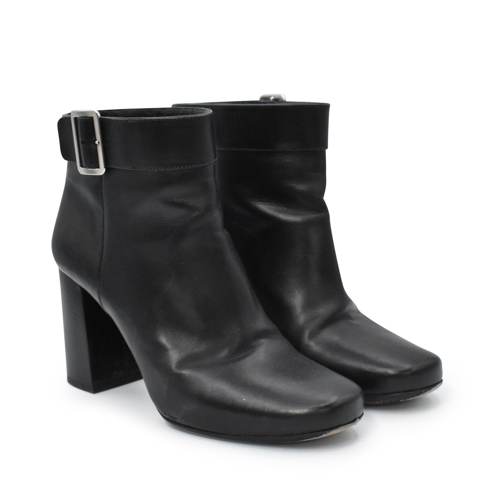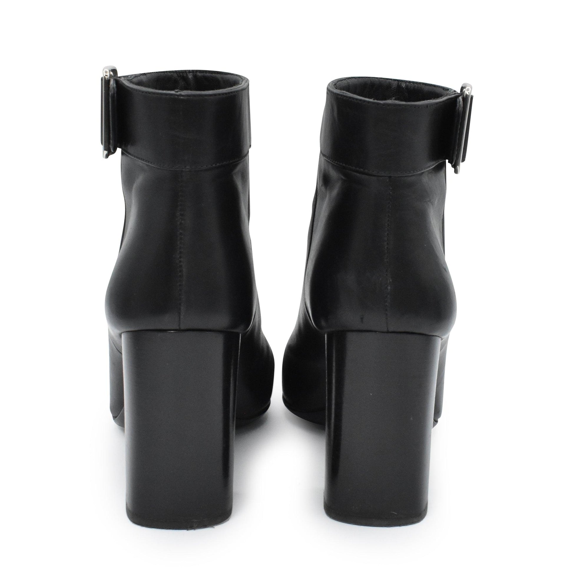 Prada black leather ankle boots with silver rectangular ankle buckle, rounded toes, and a chunky heel.