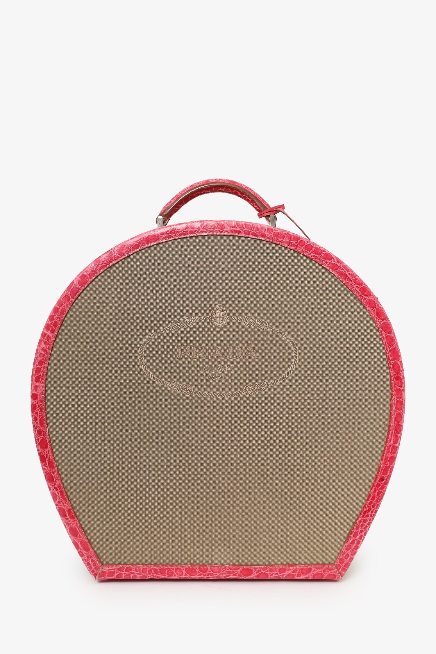 Prada Beige Canvas Pink Crocodile Trim Hat Box