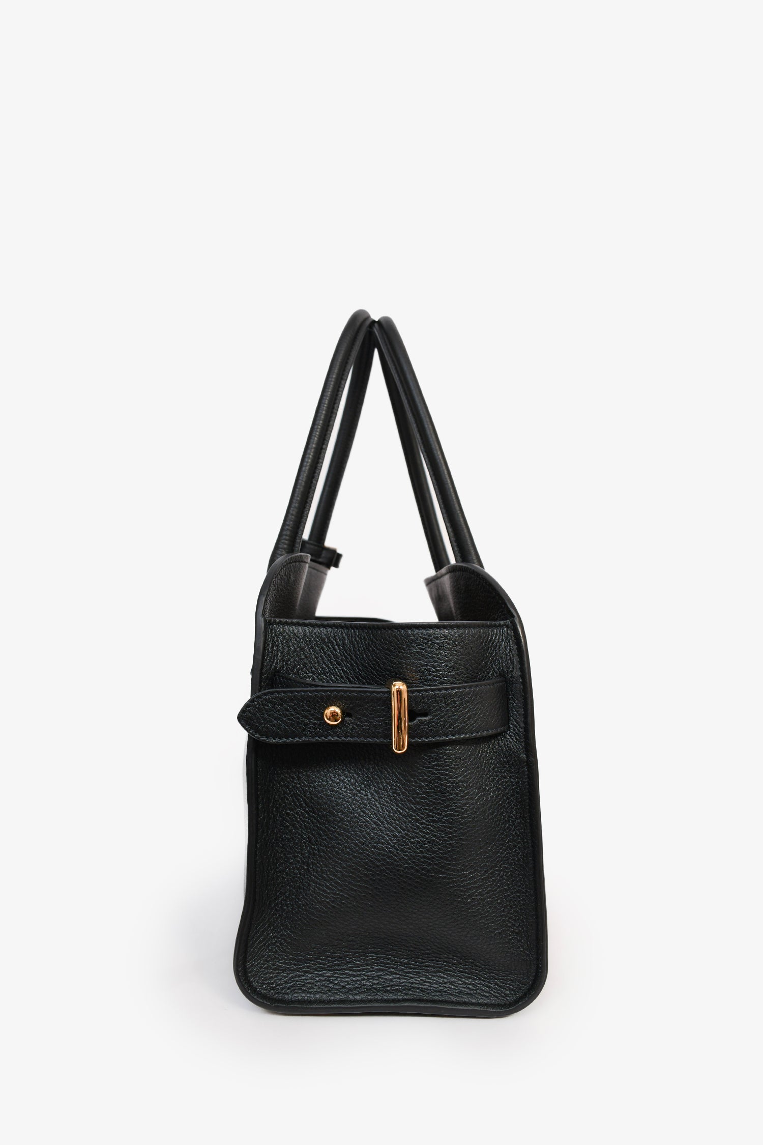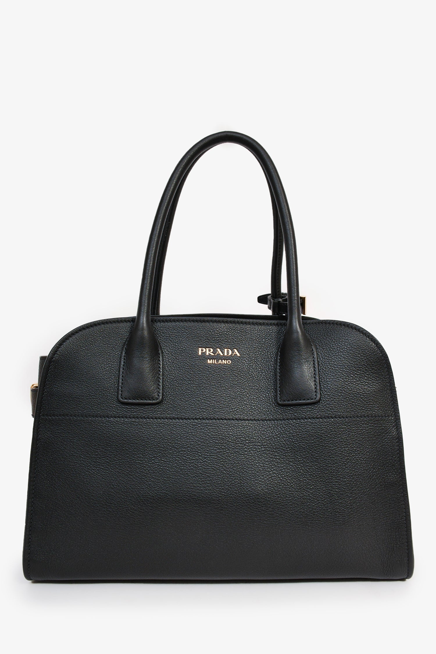 Prada Black Leather Medium Tote Bag. 2 rolled top handles. Gold-tone hardware. Adjustable side closures. Lined interior with a zipped compartment and single pocket. Tonal stitching.
