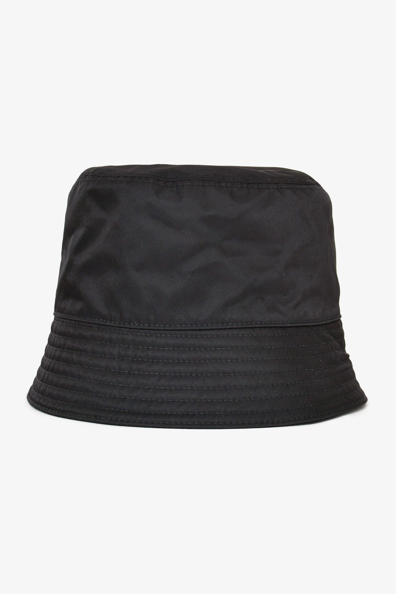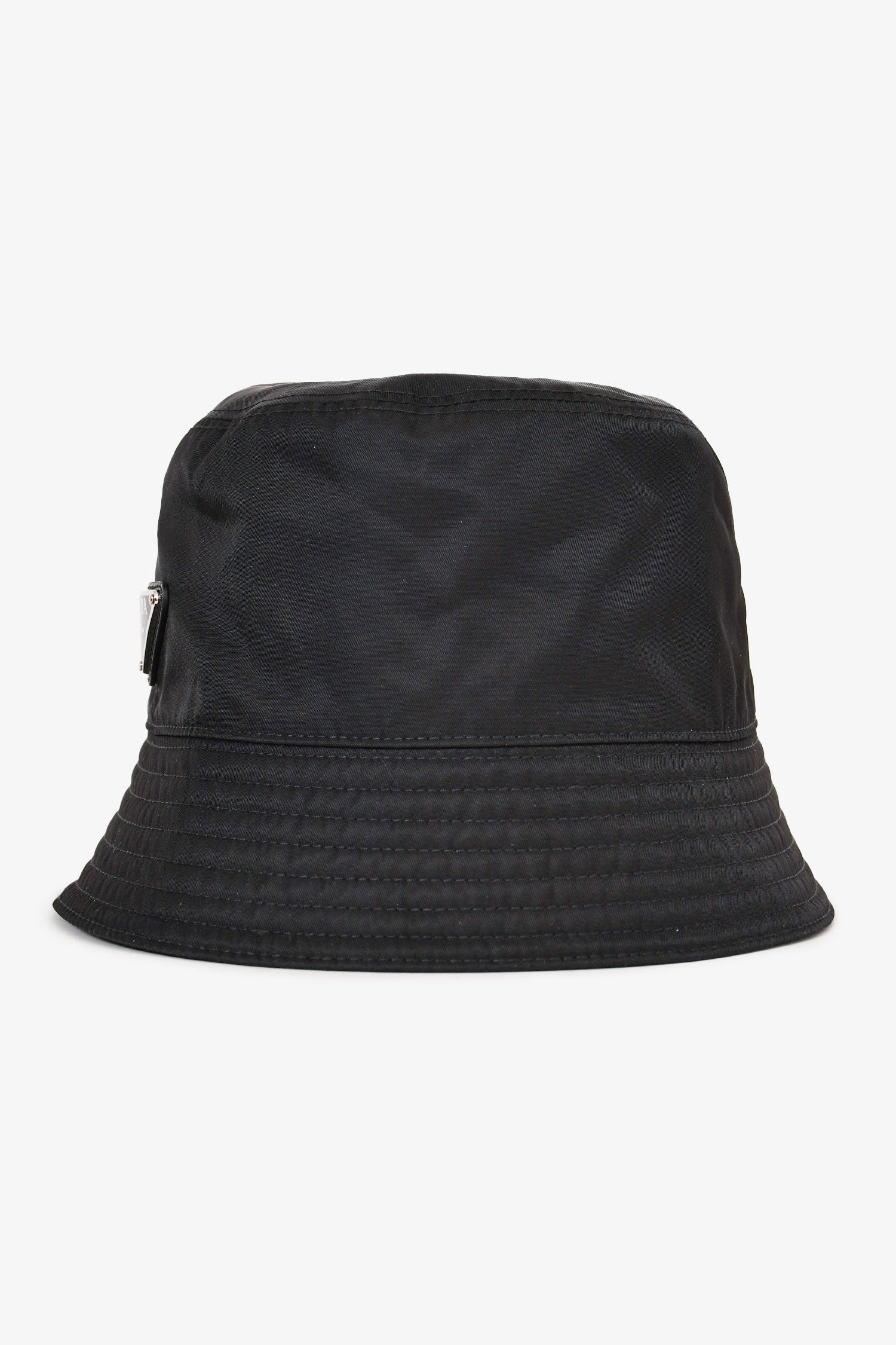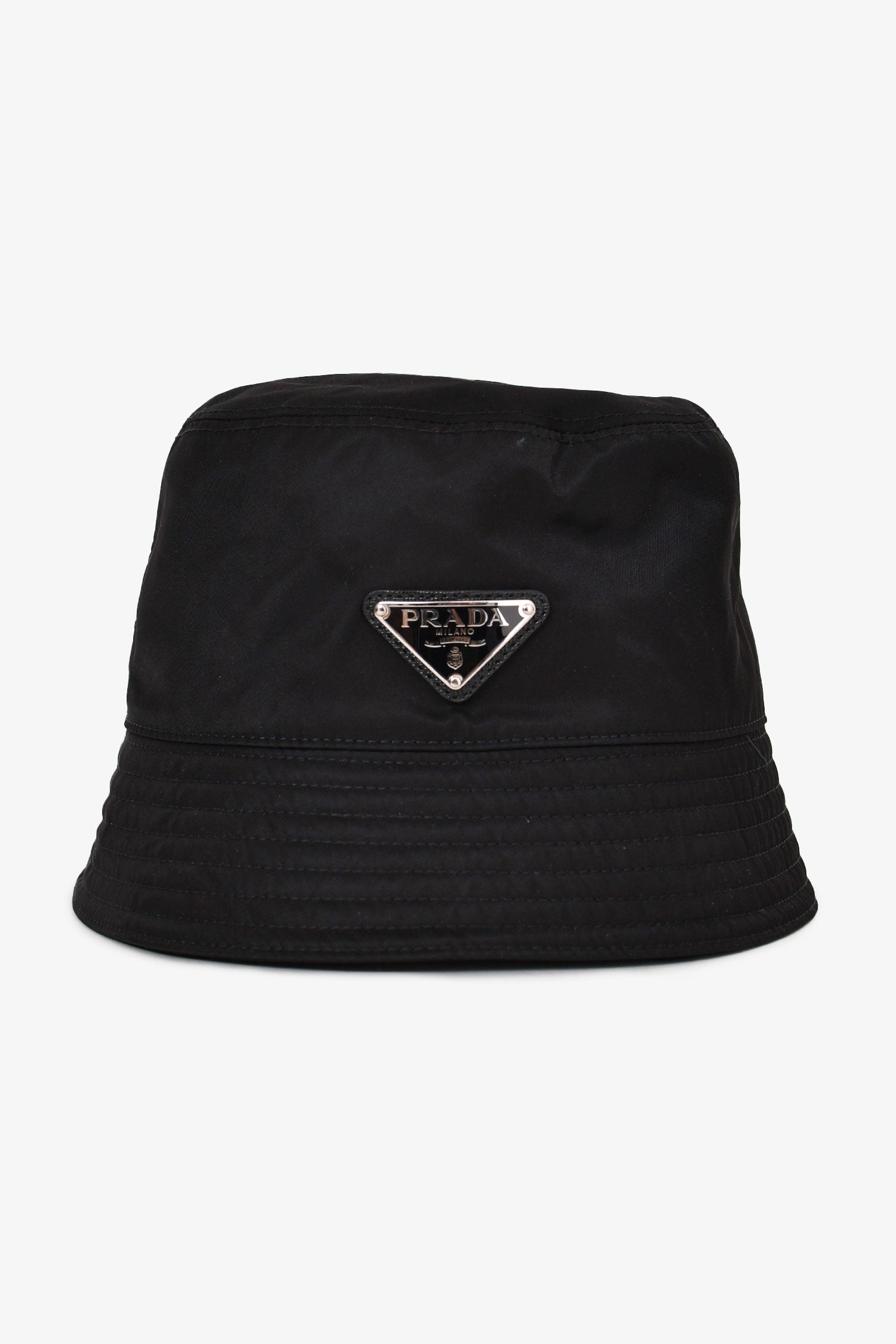 Prada Black Re-Nylon Bucket Hat. Grosgrain interior band. Lined interior. Signature silver and black-tone front plaque. Tonal stitching.