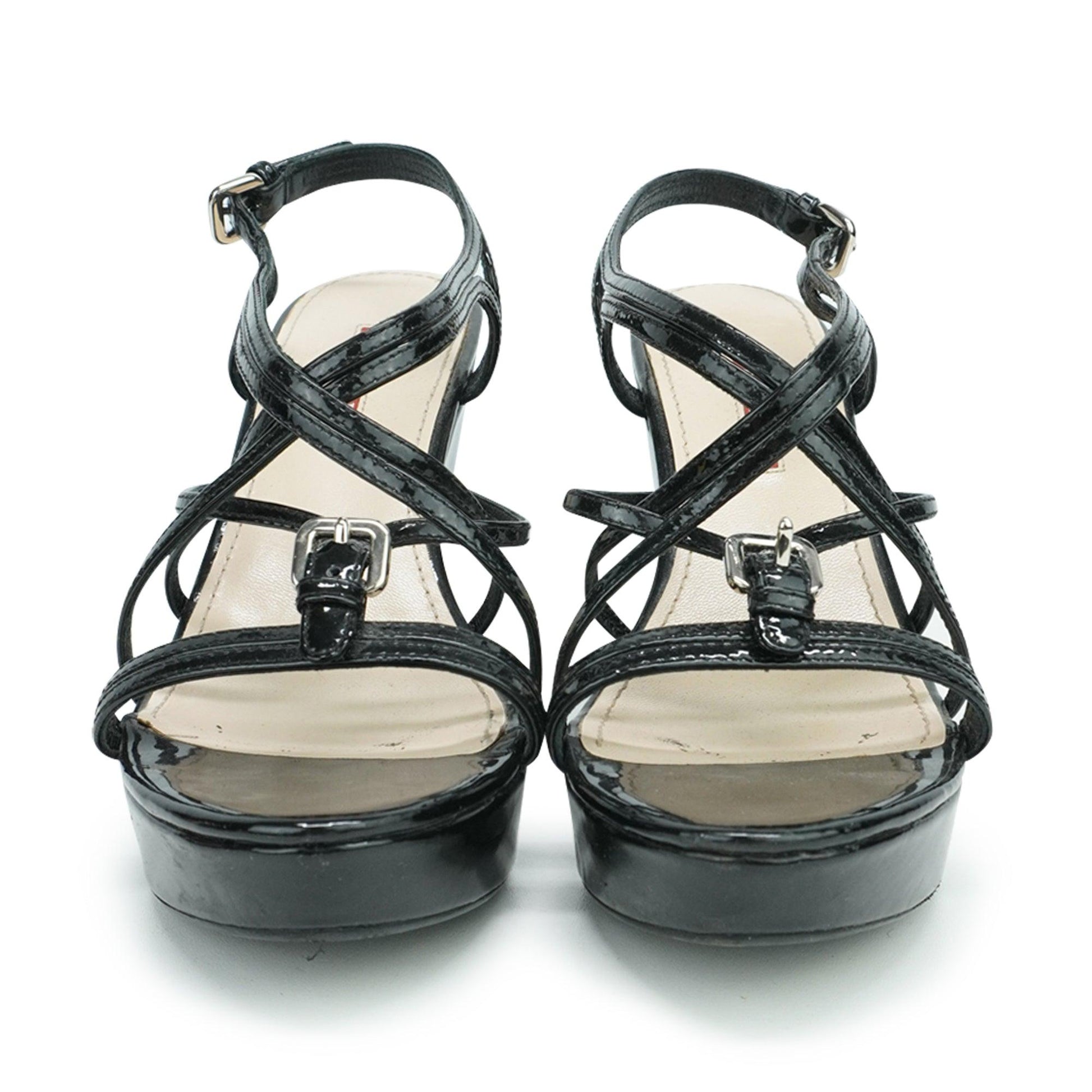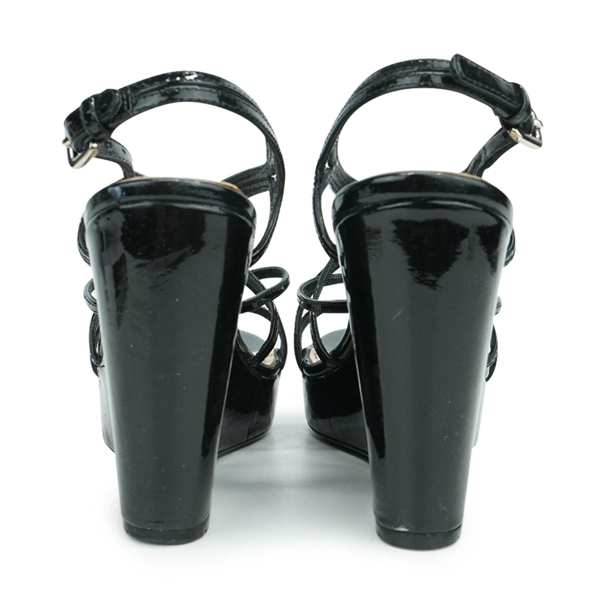 Prada Wedge Heels in black patent leather with a strappy rib cage and ankle closure in silver hardware. Includes box.