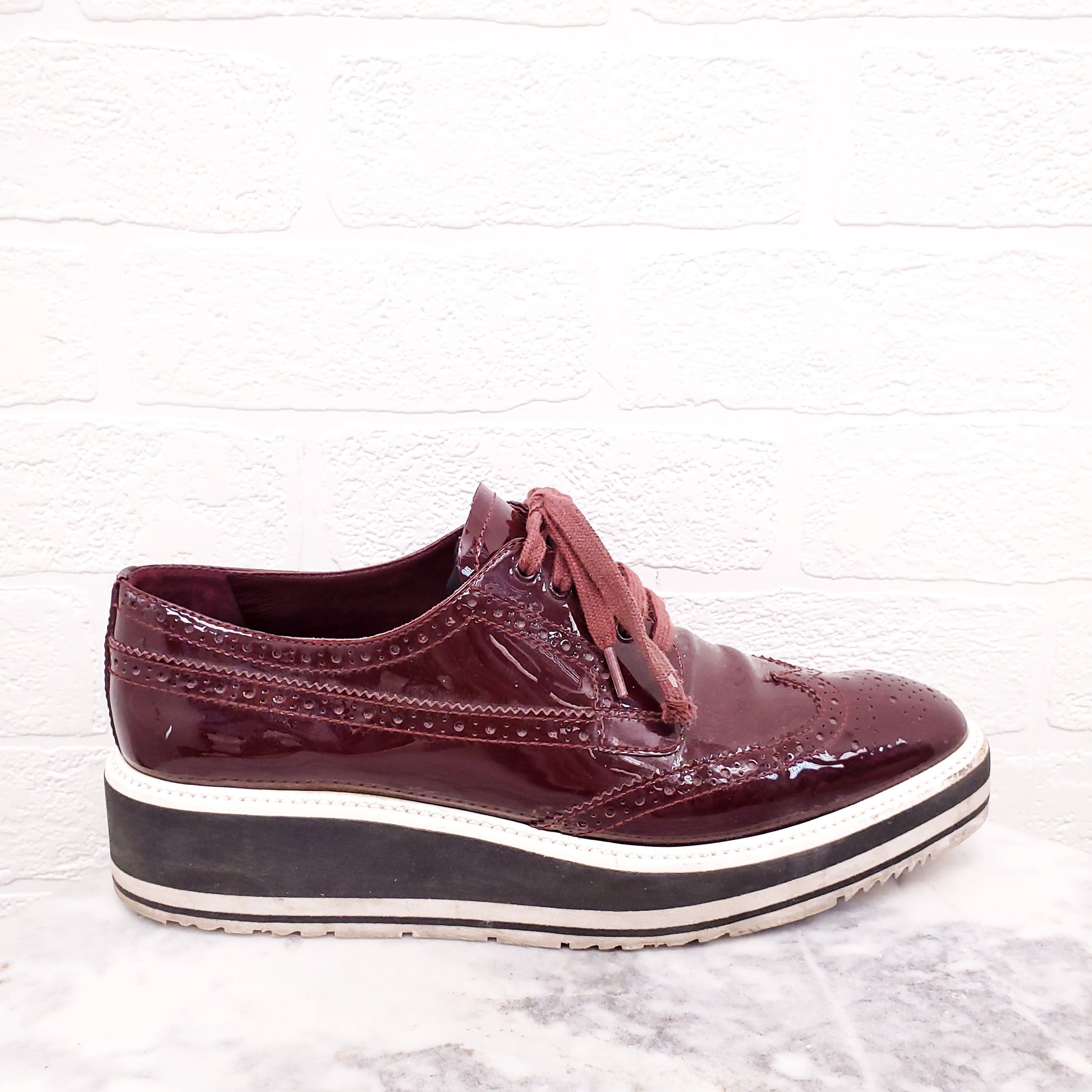 PRADA BURGUNDY PATENT OXFORD SNEAKERS - SIZE 40