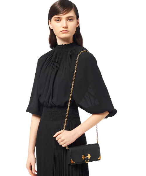 This Saffiano leather flap wallet features a Cahier-inspired strap closure and decorative hardware. Prada lettering adorns the back, while inside there are ample compartments and an extractable badge holder.