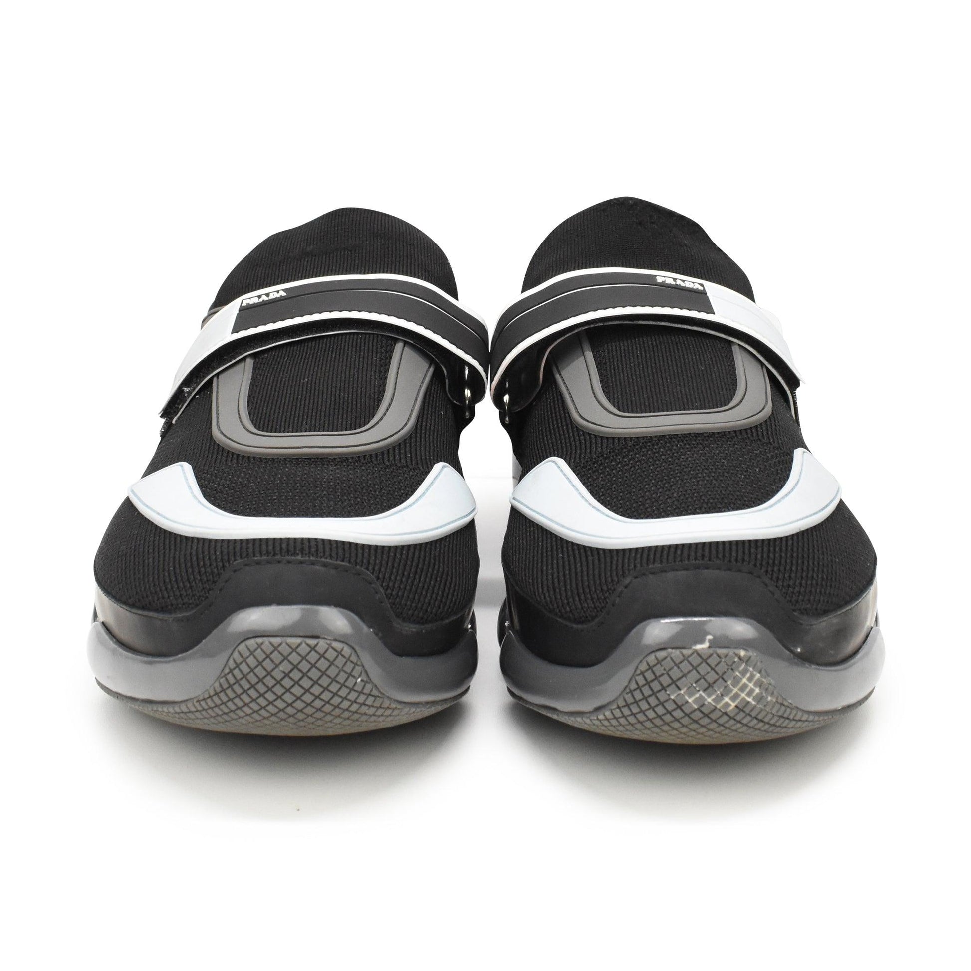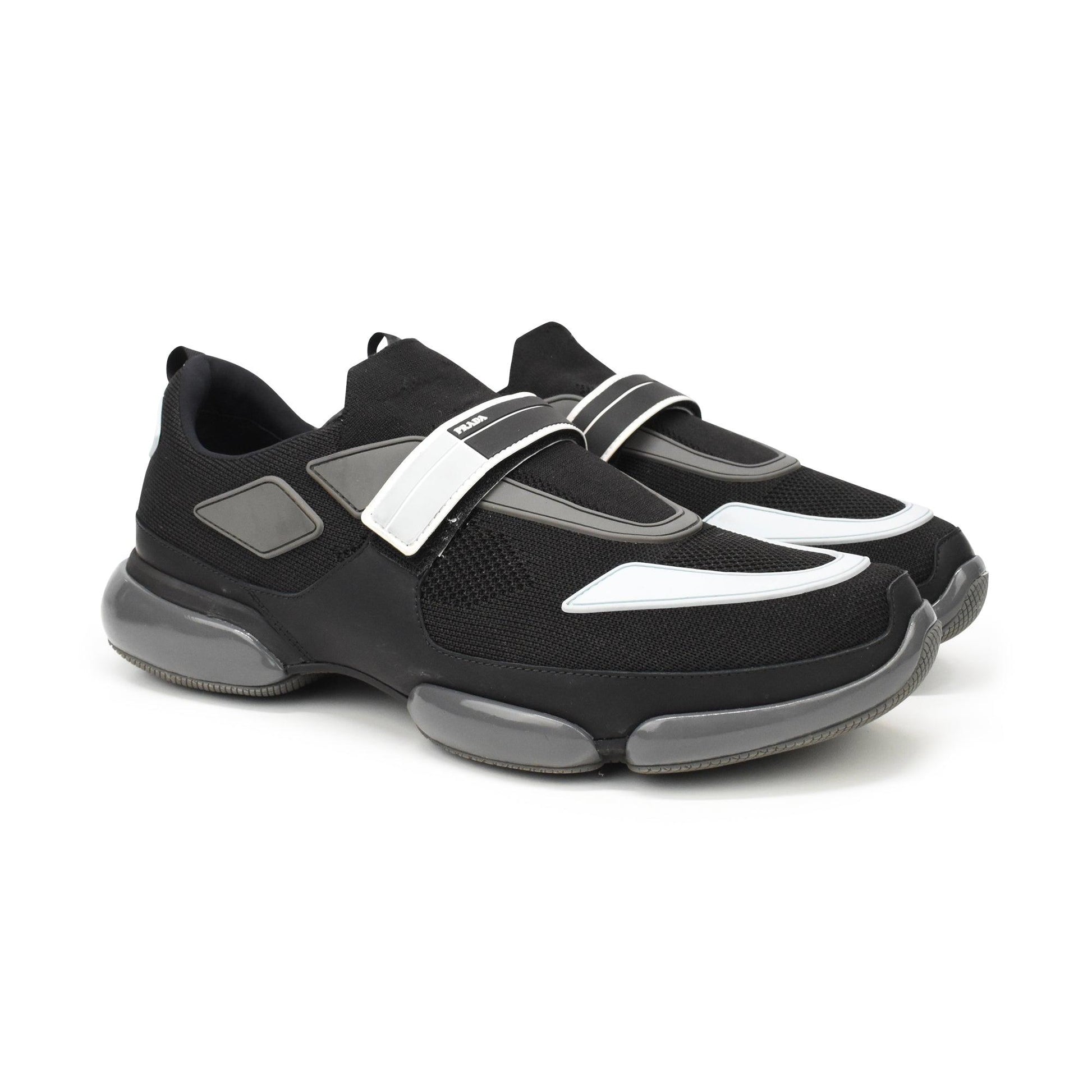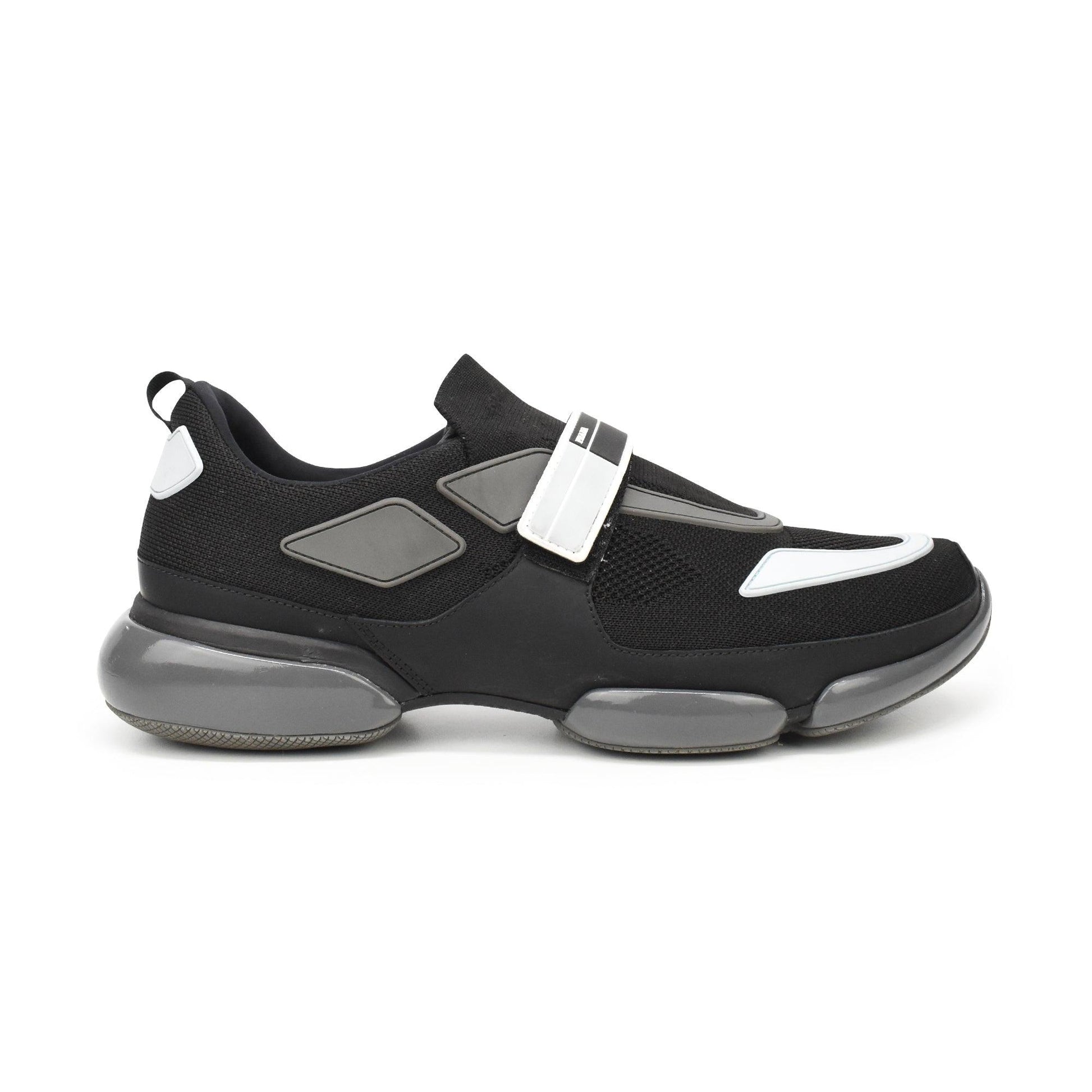Prada 'Cloudbust Trainer' sneakers in black knit mesh with grey and light blue rubber details throughout. Features a velcro strap in white, black, and light blue with logo, and grey rubber sole.