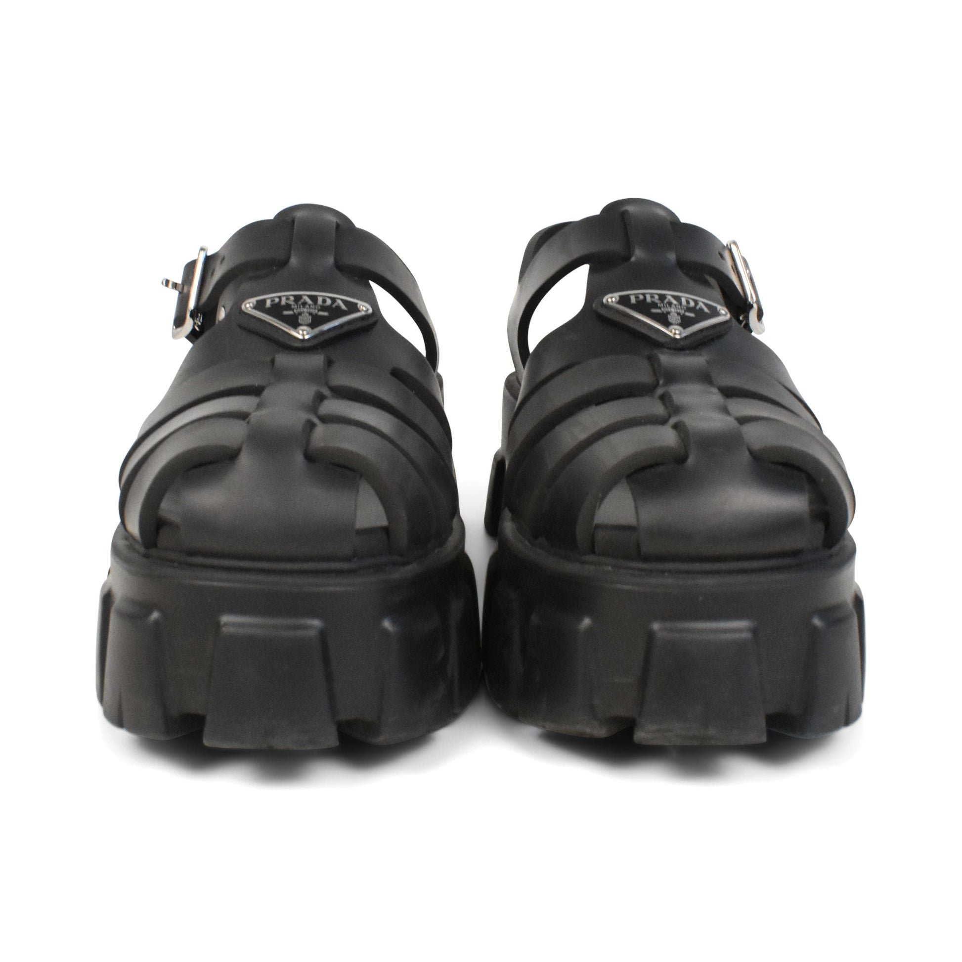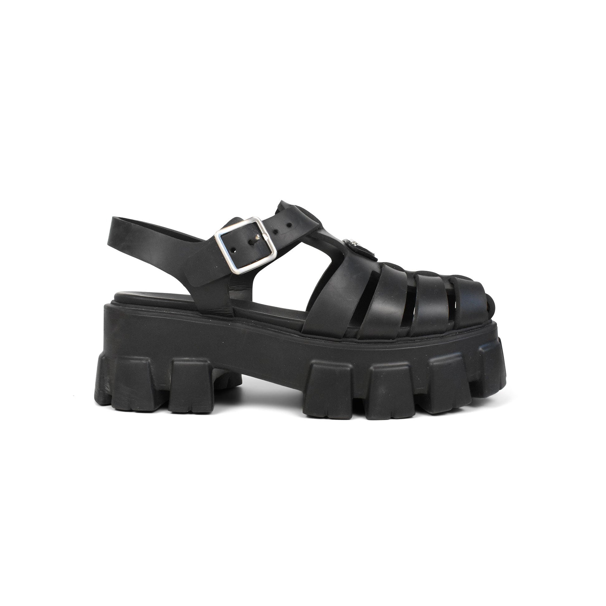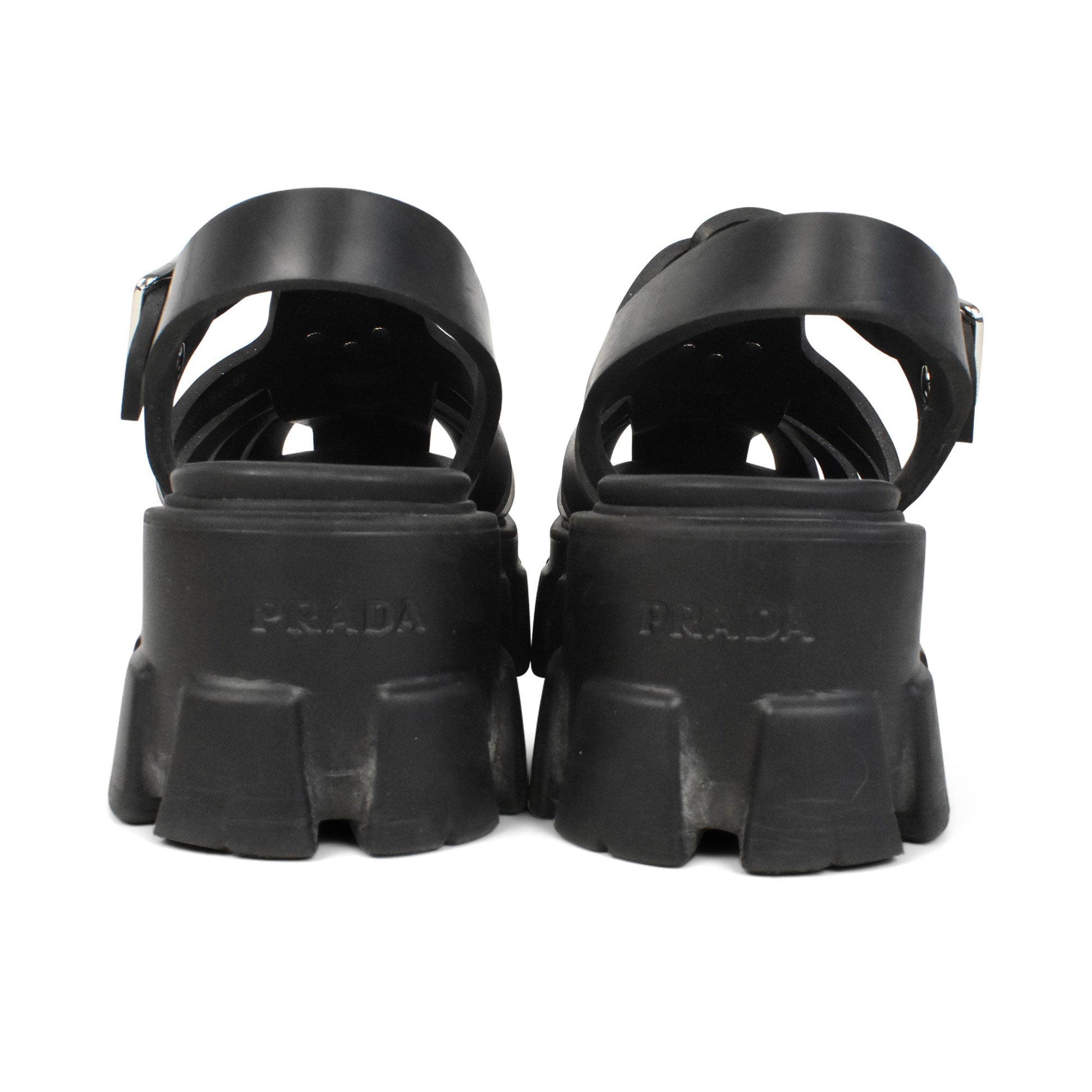 Prada 'Extralight Monolith' platform sandals in black rubber. Featuring cage design, adjustable side buckle strap closure with silver hardware buckle, and silver and black triangle logo plaque on the front.