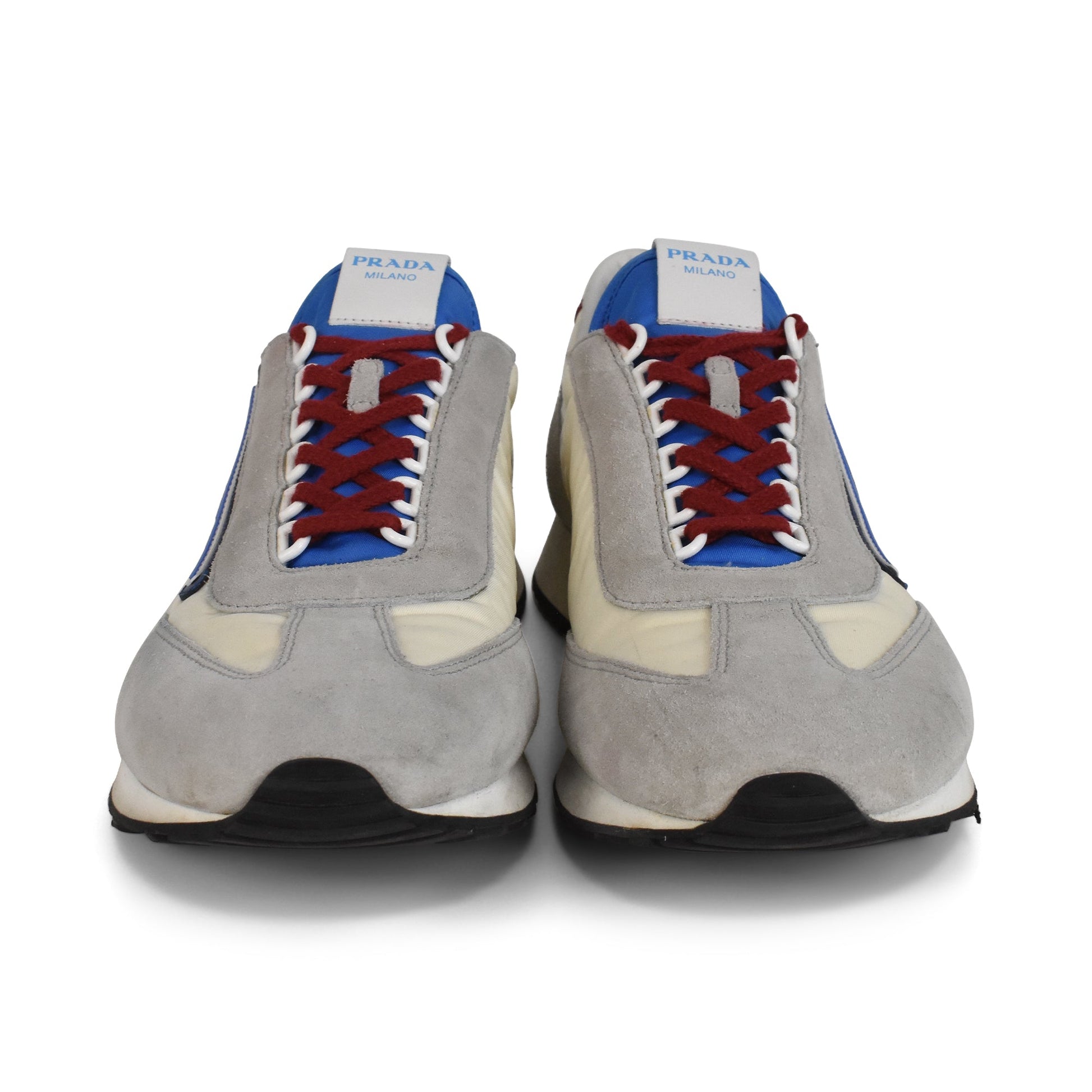 Prada 'Milano 70' sneakers in grey suede and cream nylon with a red lace up closure and blue and red leather trim.