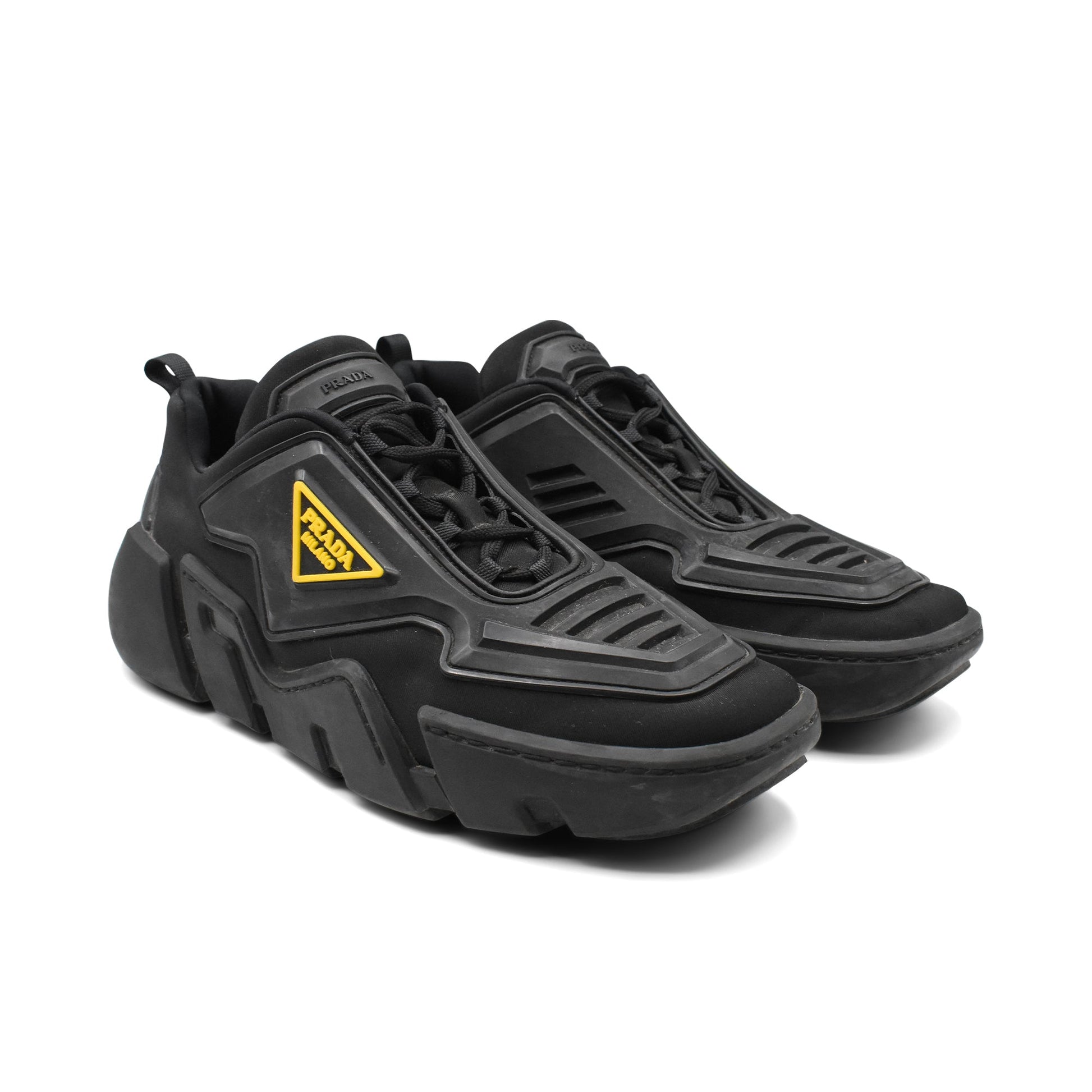 Prada 'Techno Stretch' sneakers in black neoprene and rubber with a chunky sole and a bright yellow rubber triangle logo on the sides.
