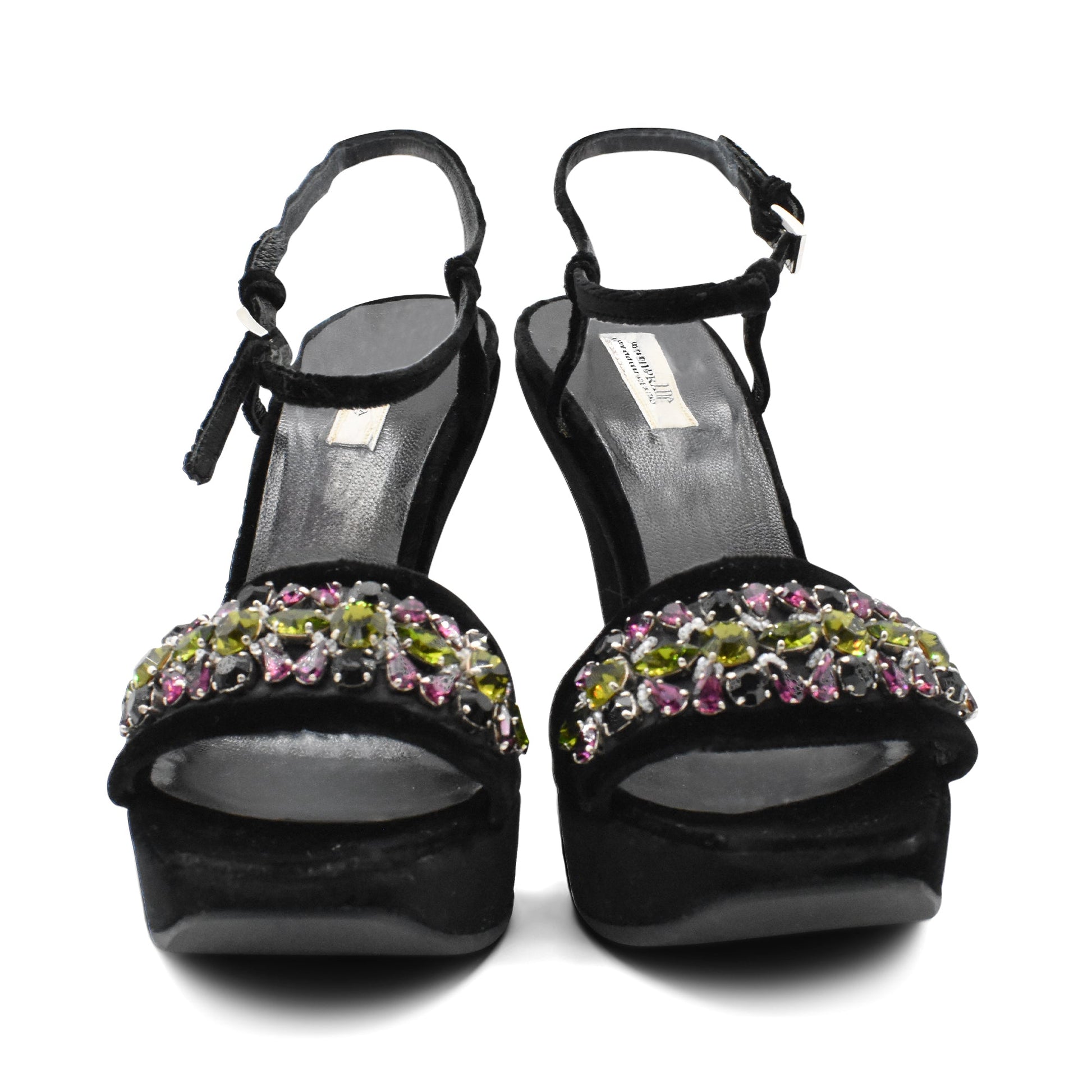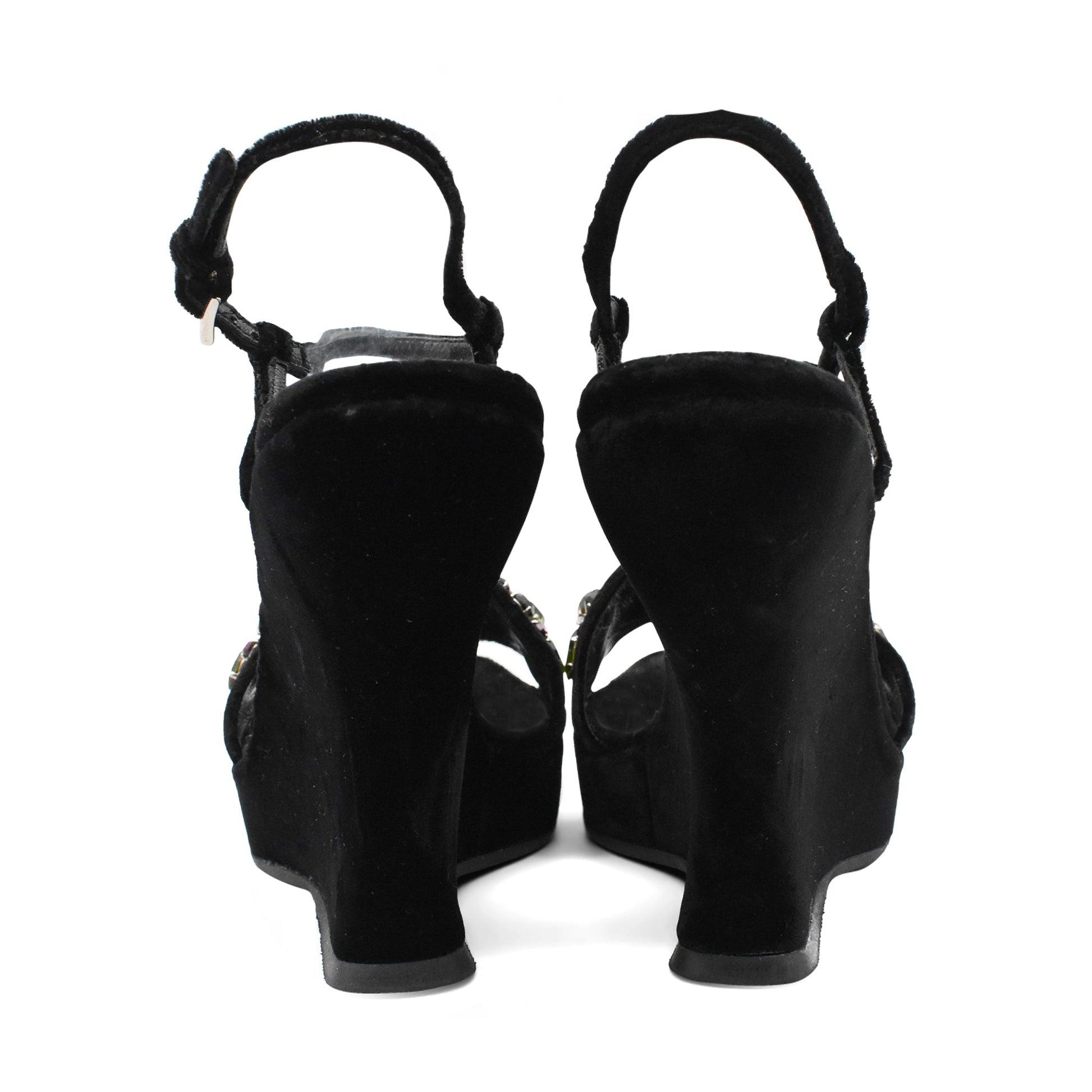 Prada vintage wedges in black velvet with a curved heel, an ankle strap with silver buckle hardware, and purple, green and black gemstones along the toe strap.