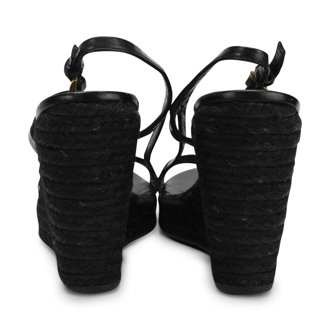 Prada black wedge slingback sandals with a woven raffia sole and gold buckle hardware.