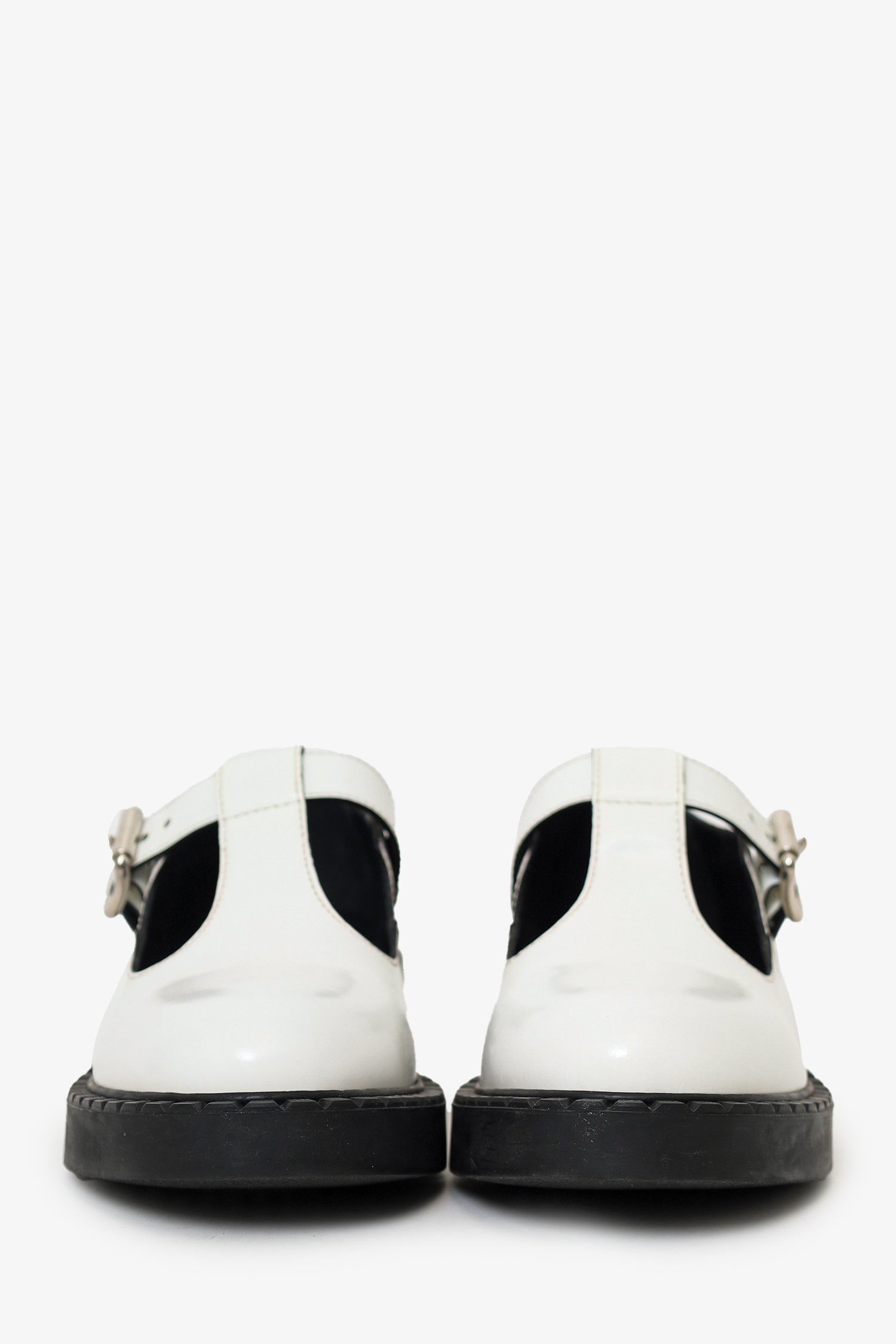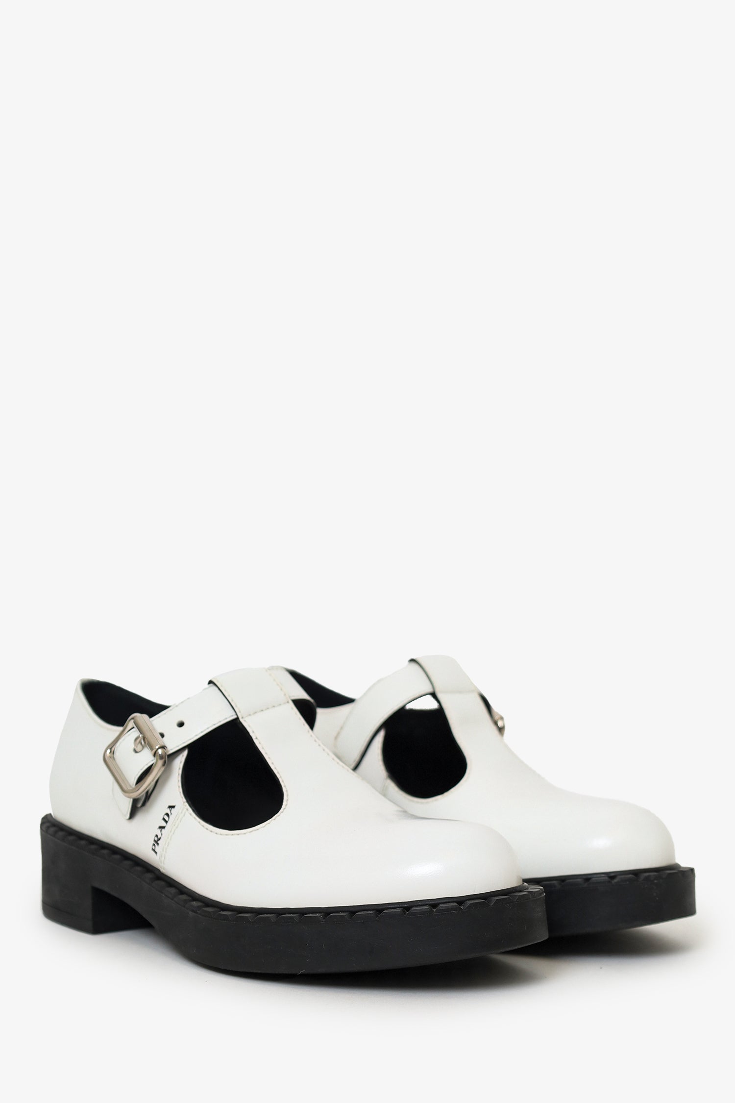 Prada White Leather Mary Jane Shoes. Slip-on. Top strap with adjustable buckle closure. Silver-tone hardware. Tonal stitching.