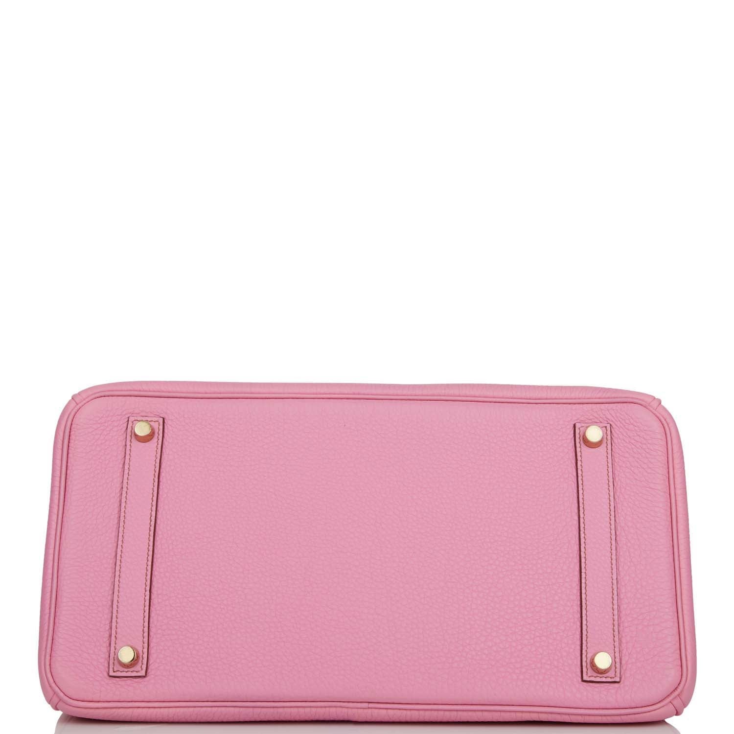 This super collectible Birkin is in Bubblegum togo leather with gold hardware and has contrast stitching, a front toggle closure, a clochette with lock and two keys, and double rolled handles.