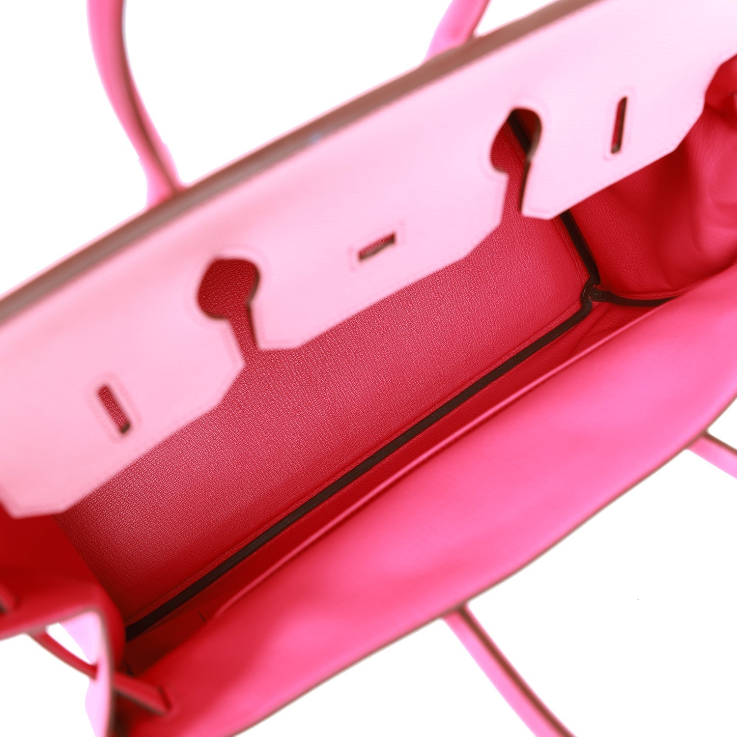 The interior is lined with Rose Tyrien chevre and has one zip pocket with an Hermes engraved pull and an open pocket on the opposite side.