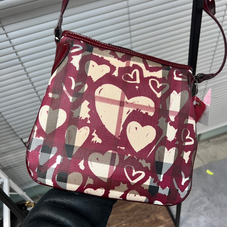 This Burberry Patent Leather Heart Print Crossbody Bag is a striking choice for fashion enthusiasts who value both elegance and playfulness. Crafted in glossy patent leather, the vibrant red bag boasts a charming heart pattern, offering a unique twist to the classic crossbody style. Its practical design ensures effortless wearability with an adjustable strap, while the secure top closure keeps your essentials safe. For collectors and admirers of vintage Burberry bags, this piece is a must-have among designer handbags.