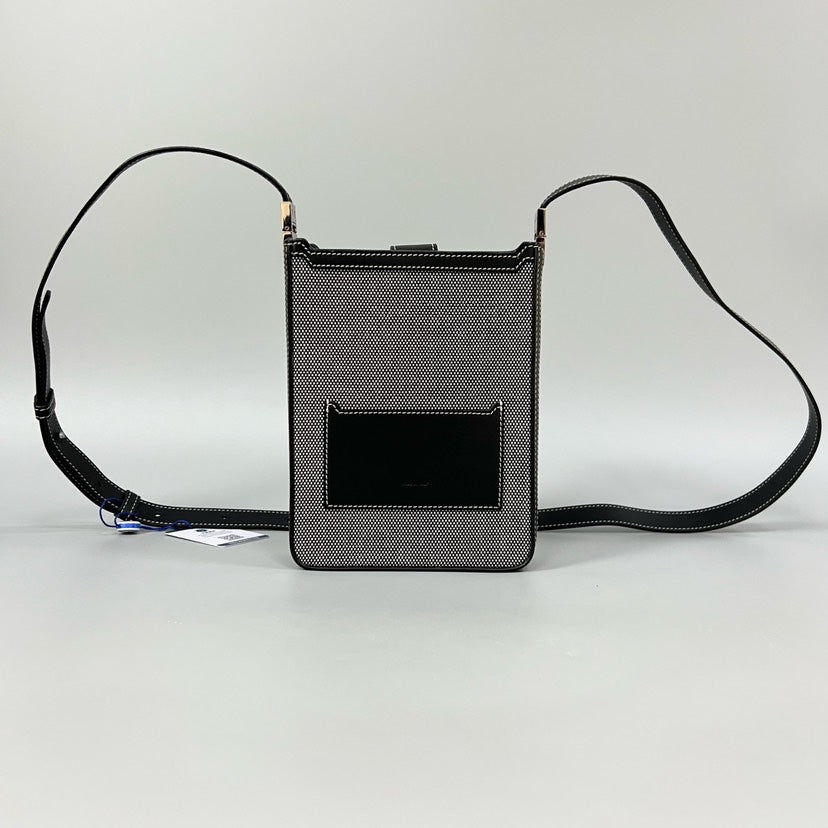 This BURBERRY Phone Bag is a sleek addition to any collection of vintage Burberry bags. Crafted from durable canvas, this mini crossbody bag offers effortless style and functionality, perfect for the fashion-forward individual. With a rich black exterior, leather strap, and secure slot, it makes an ideal accessory for your everyday needs. A perfect choice among designer handbags.