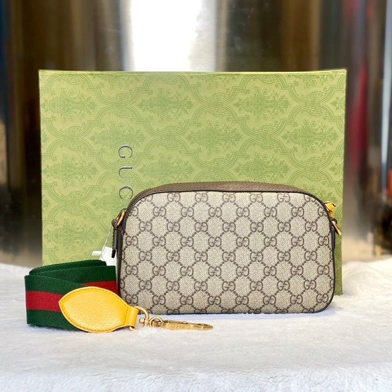 Explore the elegance of vintage Gucci bags with this preloved Gucci Ophidia crossbody bag. Crafted from iconic GG Supreme canvas in beige, this designer handbag showcases Gucci's signature craftsmanship. The distinguished crossbody design features a fabric strap in Gucci’s classic green and red stripe with gold-tone hardware, adding a touch of luxury to any outfit. Perfect for collectors or anyone who appreciates timeless style, this crossbody bag is an outstanding piece among designer handbags.