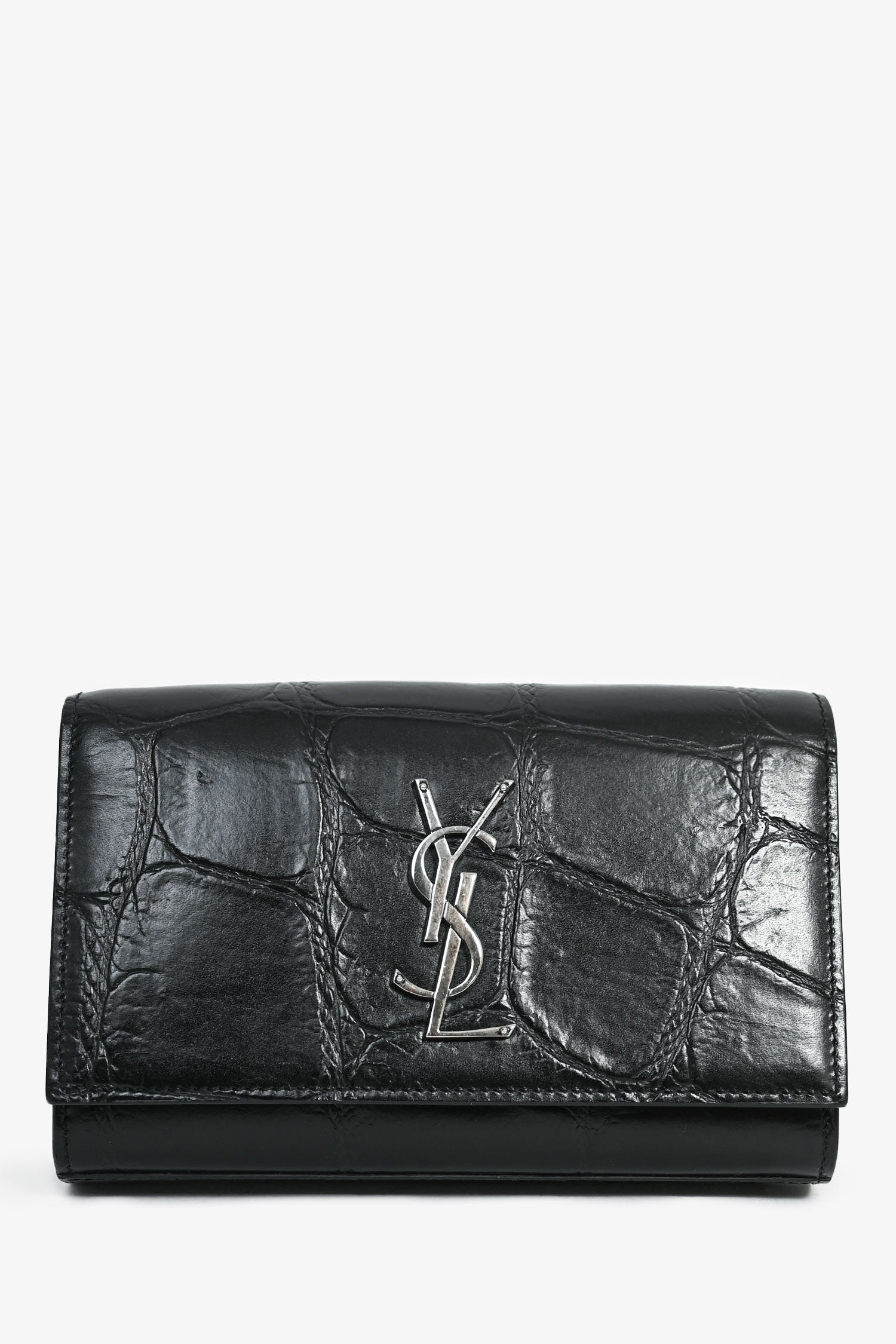 Saint Laurent 2018 Black Animal Embossed Small Kate Belt Bag. Front Fold-over flap with magnetic closure. Detachable and adjustable belt. A top zipper compartment and a compartment with a wall slip pocket. Silver-tone hardware. Tonal textile and leather lining. Tonal stitching.