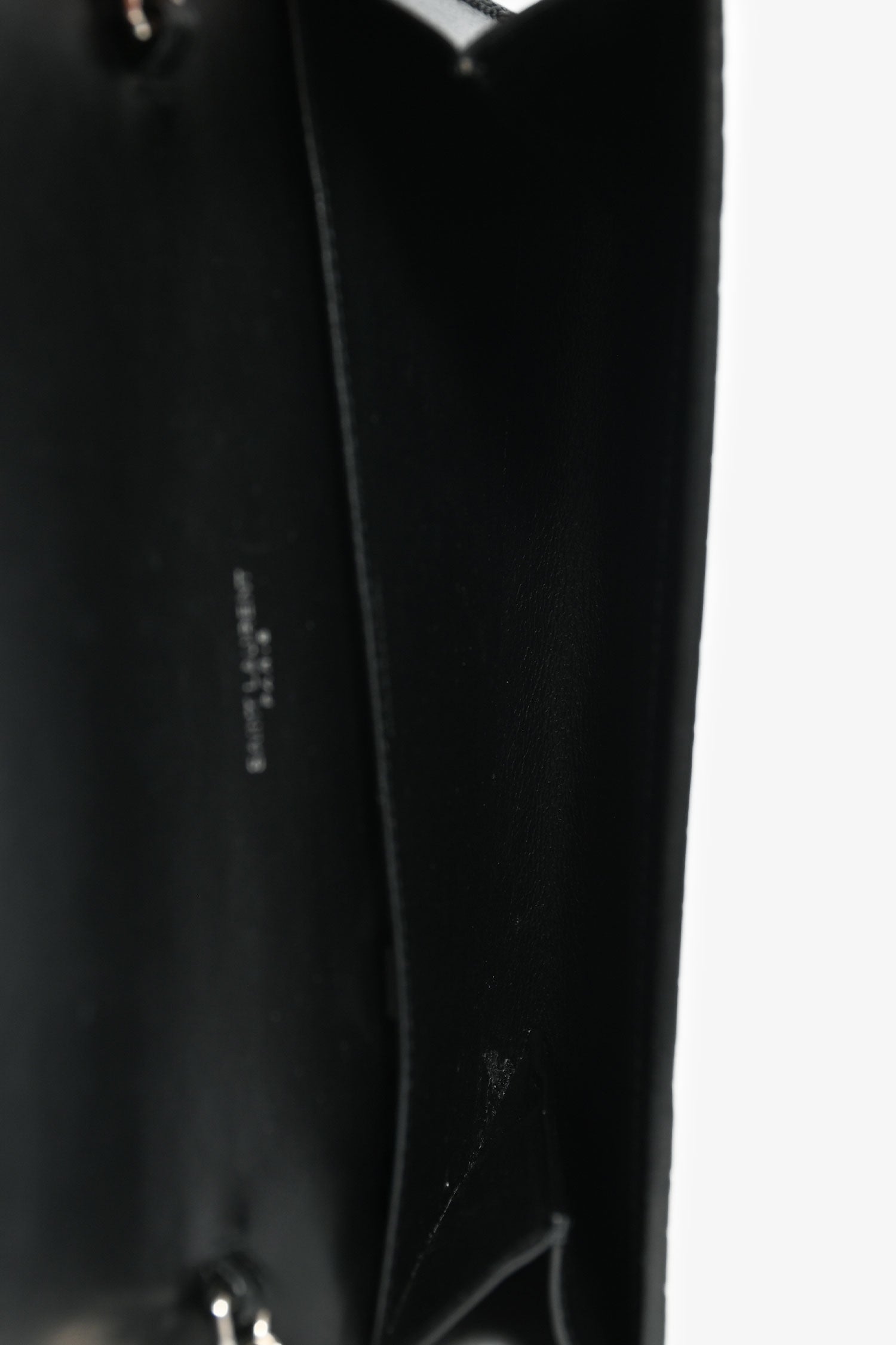 Saint Laurent 2020 Black Croc Embossed Envelope Wallet On Chain. Fold-over flap with a snap closure. Silver-tone hardware. Leather-lined interior. 1 interior slip compartment. Chain-link crossbody strap. Comes with a 4 card holder. Tonal stitching.