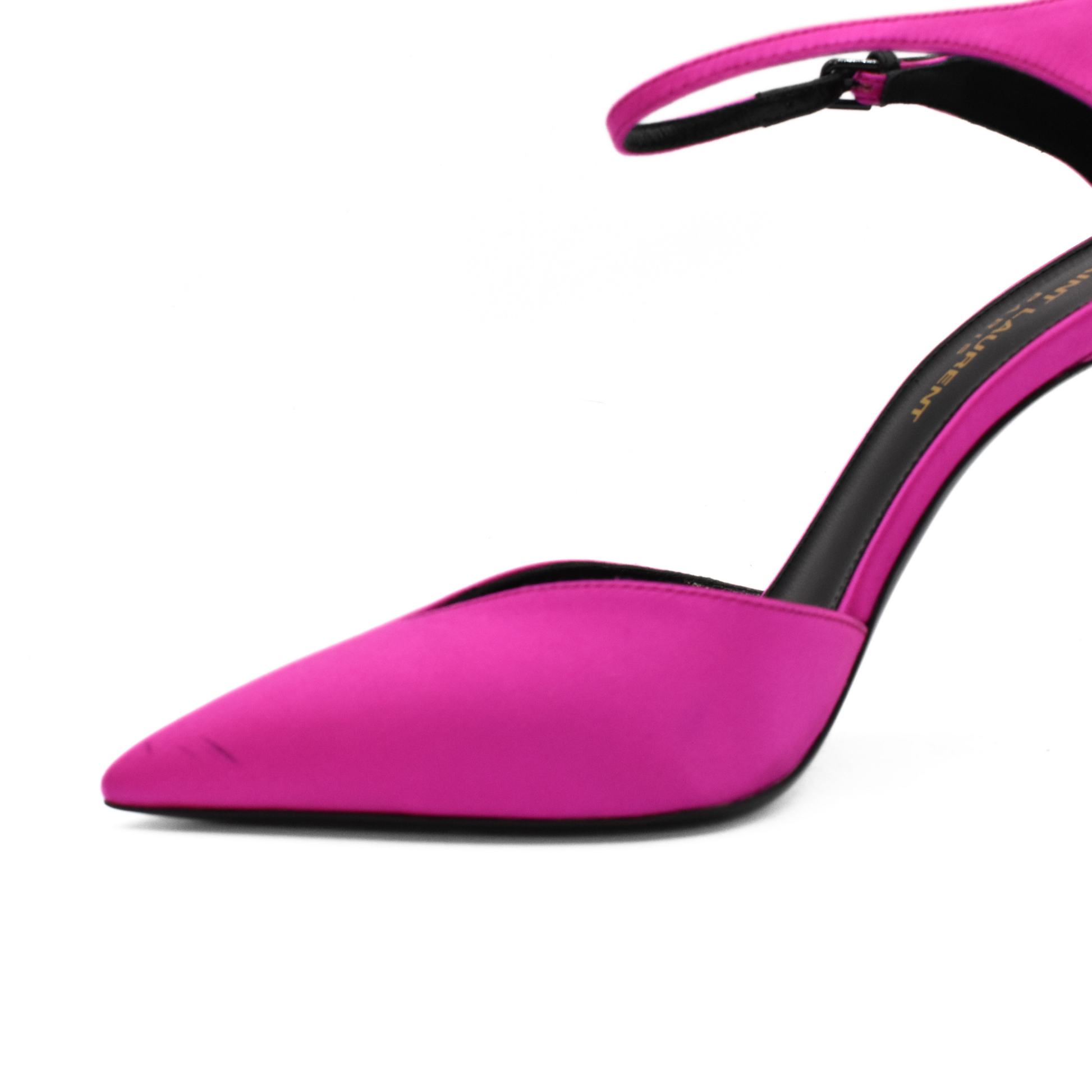 Saint Laurent 'Anja' pointed toe heels in hot pink satin with black buckles on the ankle straps.