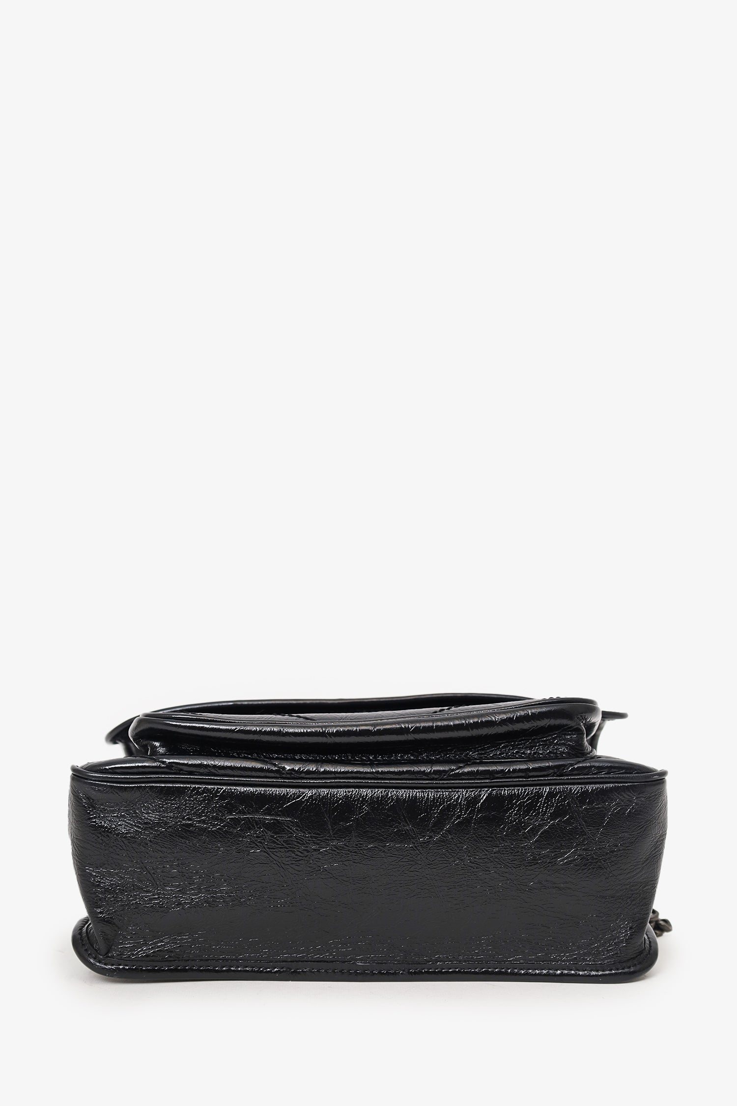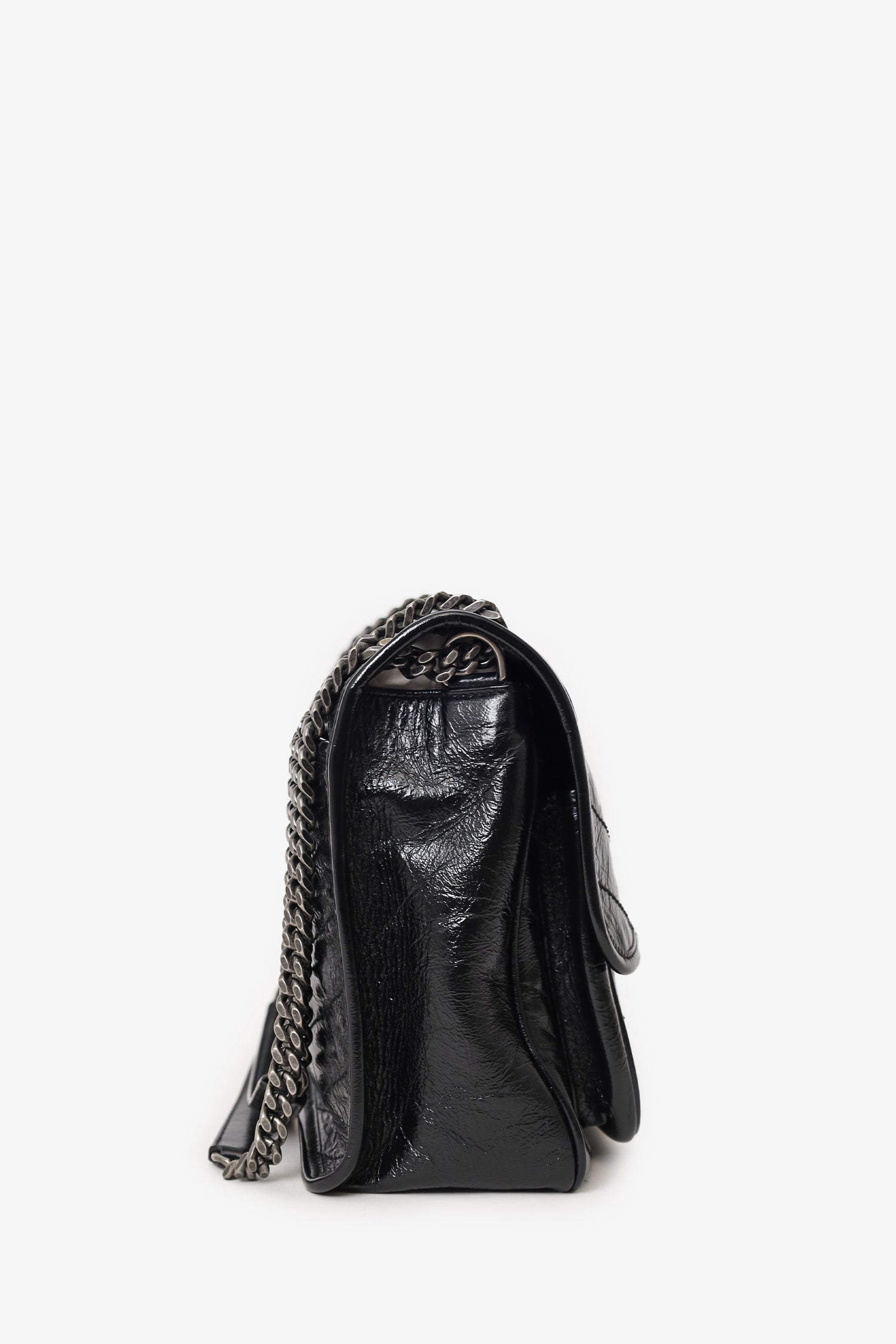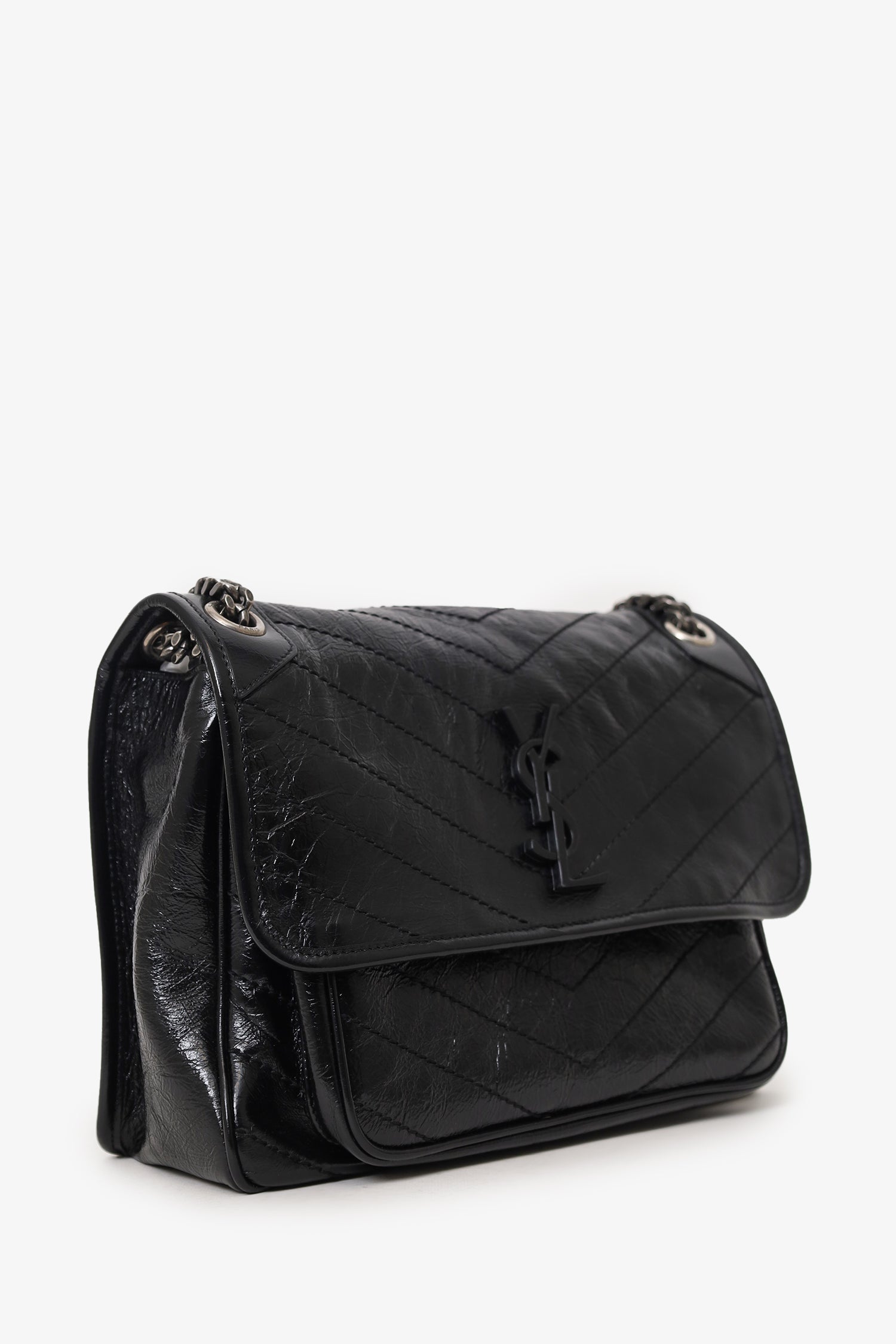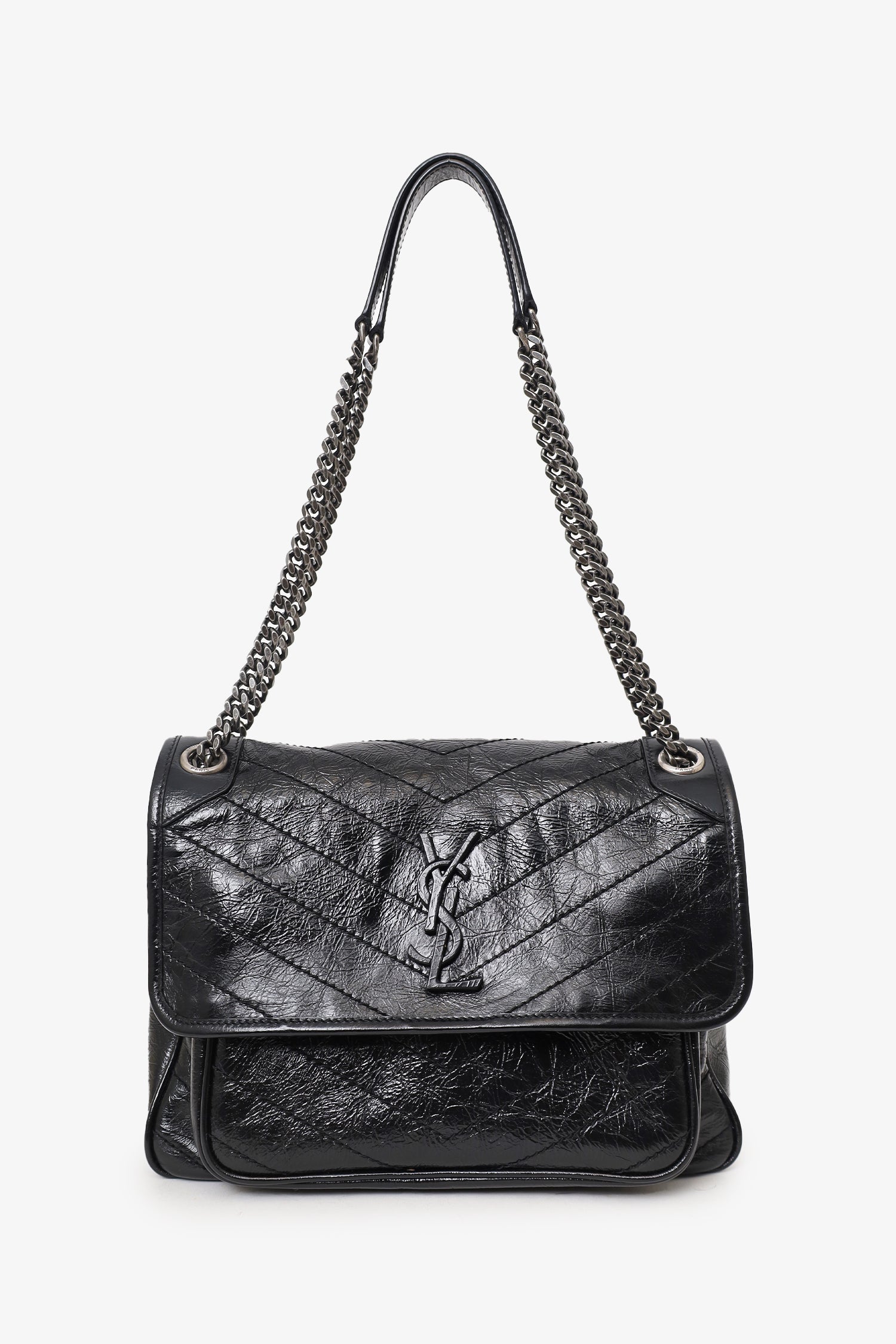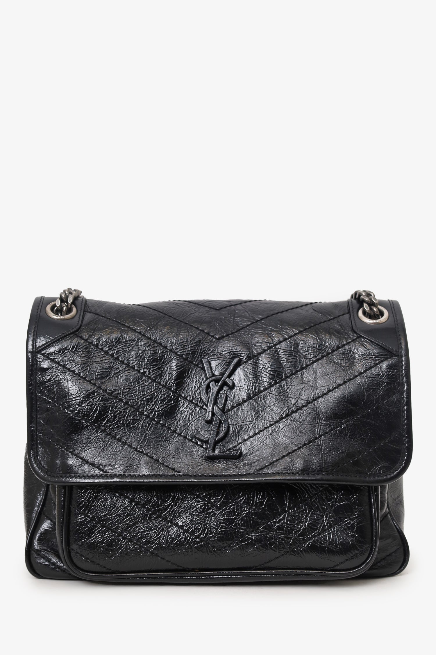 Saint Laurent Black Crinkled Leather 'Niki' Medium Crossbody Bag. Front fold-over flap with snap-button closure. Twin chainlink/leather shoulder straps that can be pulled into one long strap. Rear slip pocket. 2 interior compartments; 1 front open slip and rear main compartment with 1 slip and 1 zip pocket. Lined interior. Silver-tone hardware. Tonal stitching.