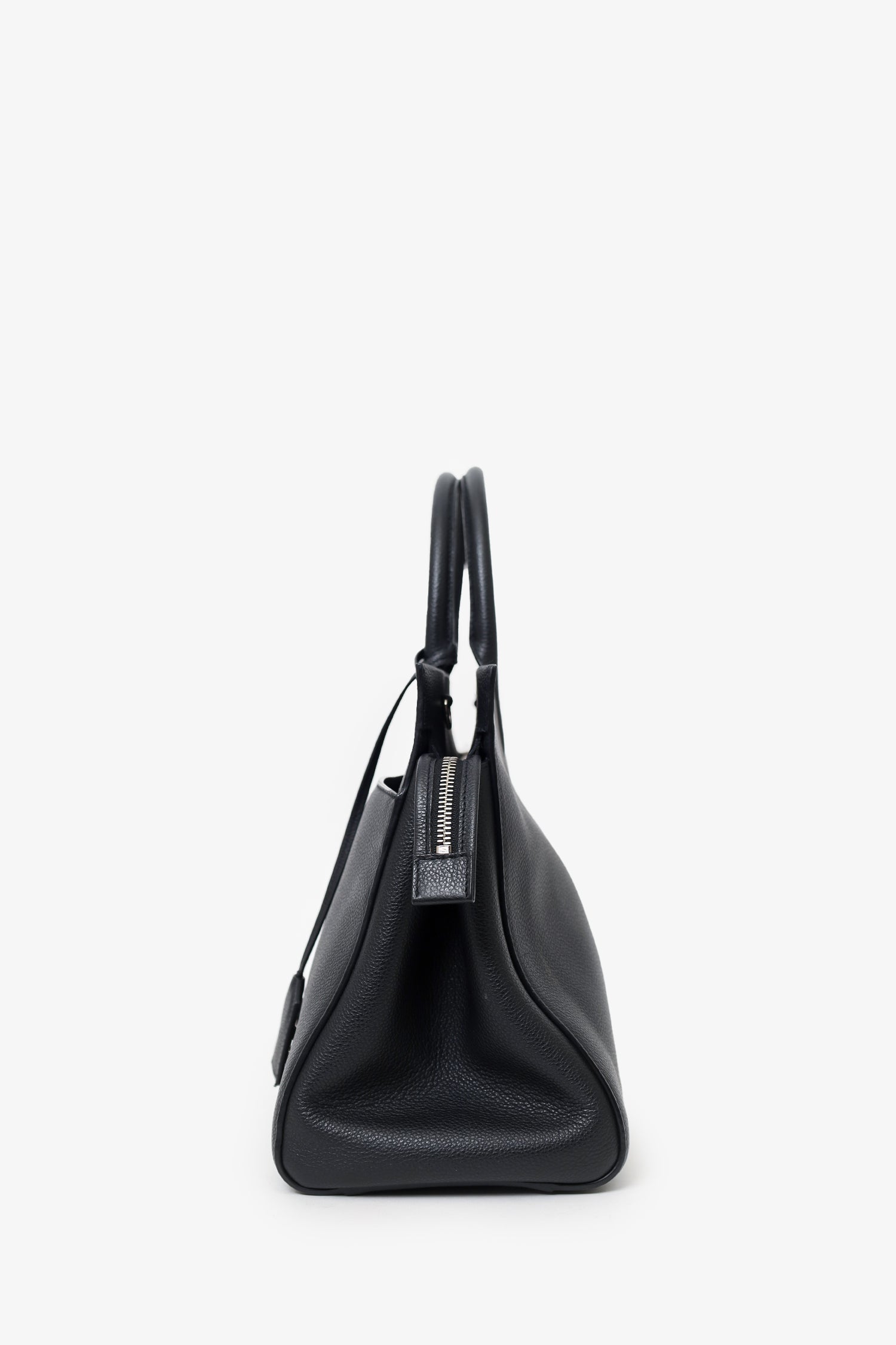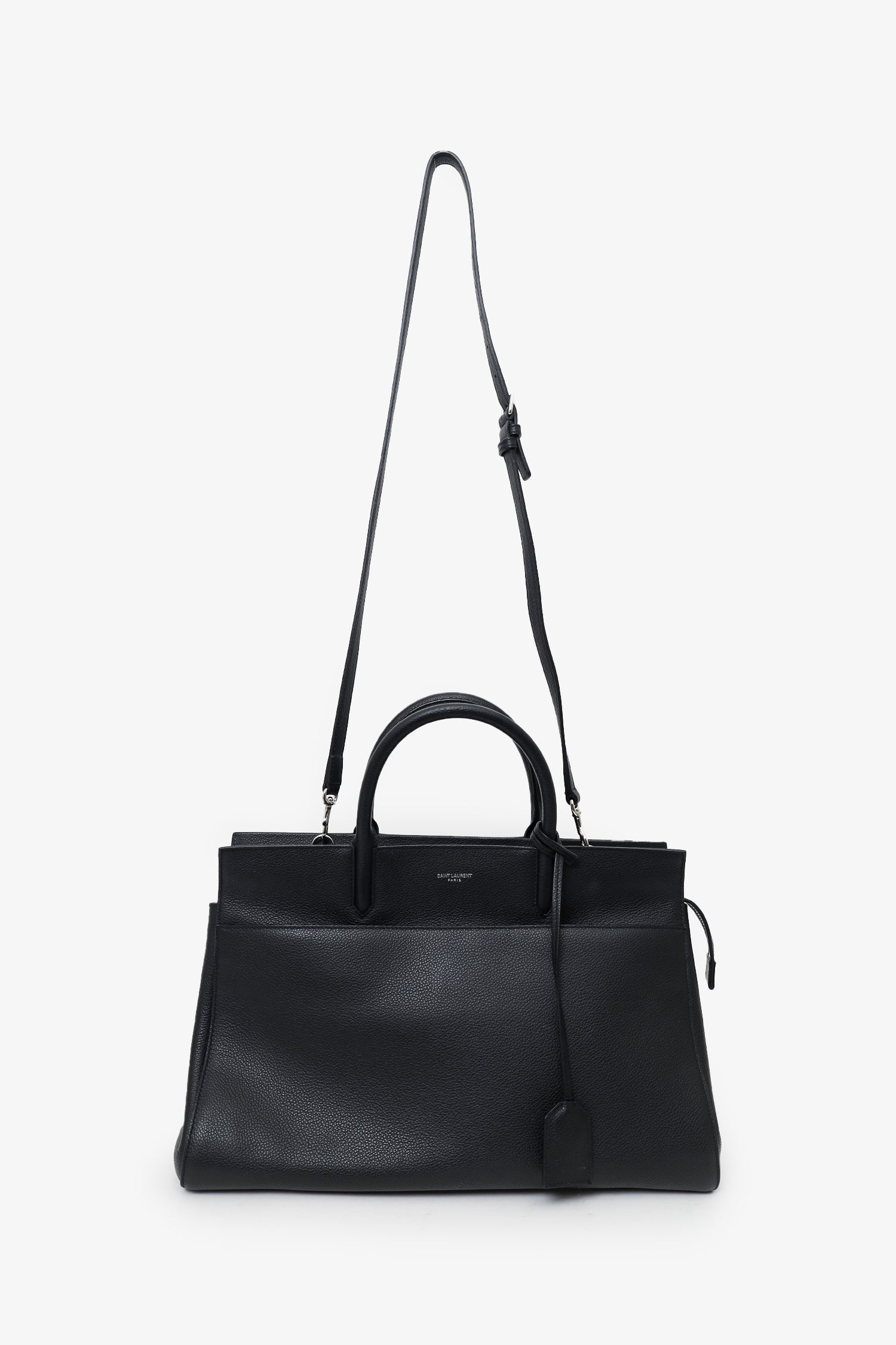 Saint Laurent Black Grained Calfskin Medium Cabas Rive Gauche Tote. Top zip closure. Twin top handles. Removable strap with adjustable buckle closure. Front exterior slip pocket with magnetic snap-button closure. Snap-button closures on side exterior. Protective studs on bottom. Suede-lined interior. 2 interior pockets; 1 slip and 1 zip. Includes removable clochette.