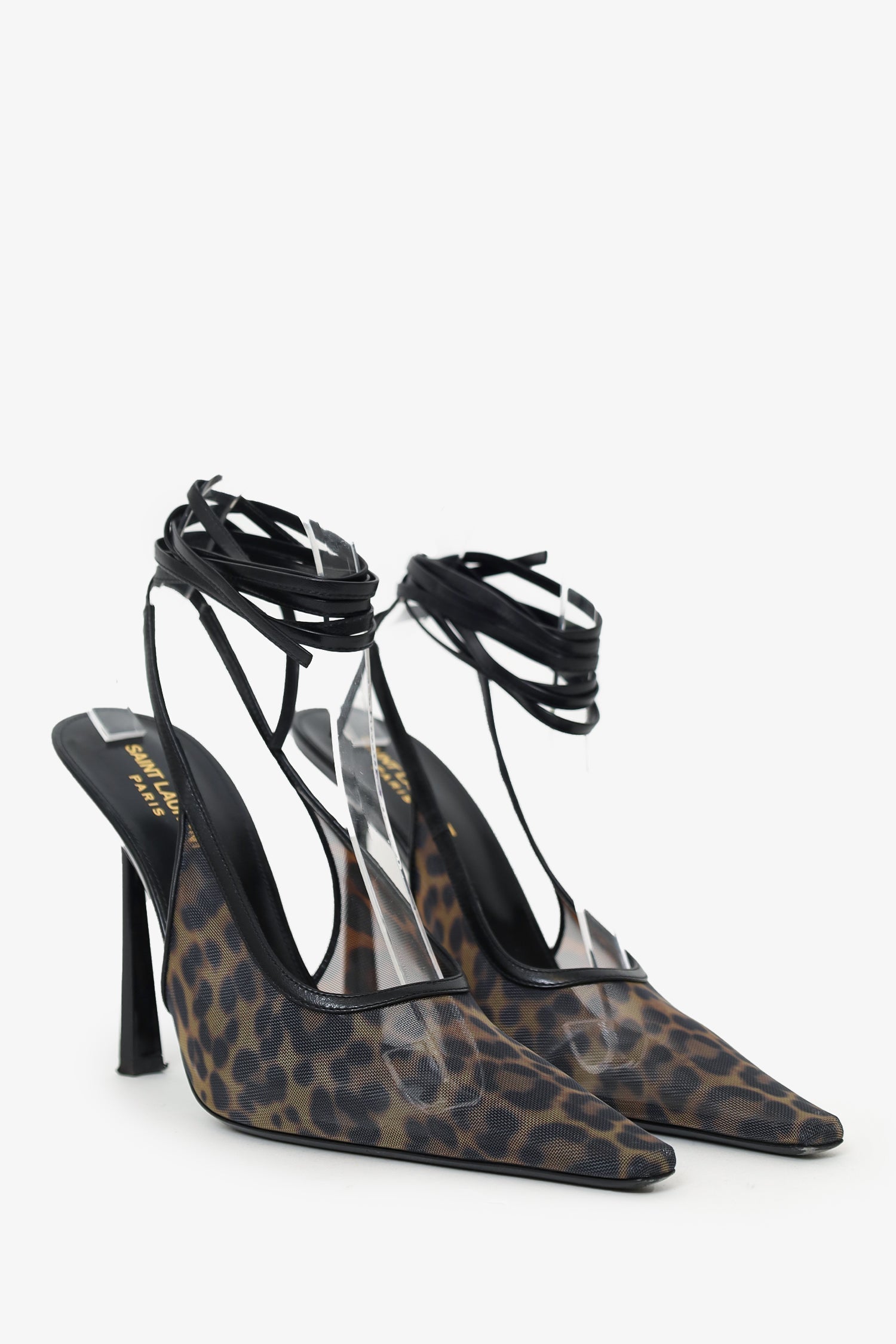 Saint Laurent Black/Leopard Print Leather Mesh Oxalis Slingback Pumps. Slip-on. Pointed-toe. Wrap-around ankle strap with tie-up closure. Sheer vamp and toe box. Tonal stitching.
