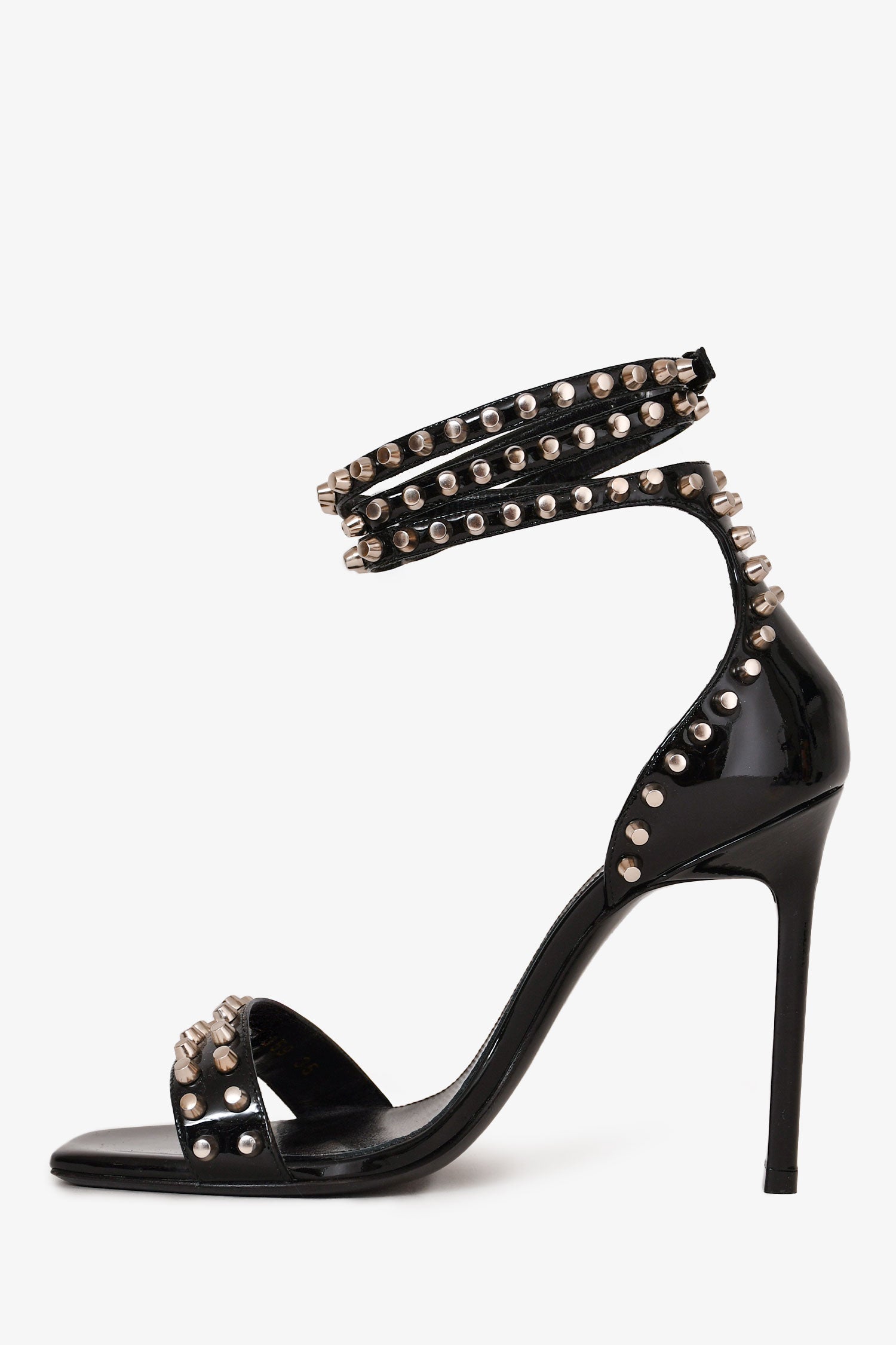 Saint Laurent Black Patent Leather Studded Sandal Heels. Wrap-around patent straps with a pin-buckle. Lined leather interior. Silver-tone studs. Stiletto heel. Tonal stitching.