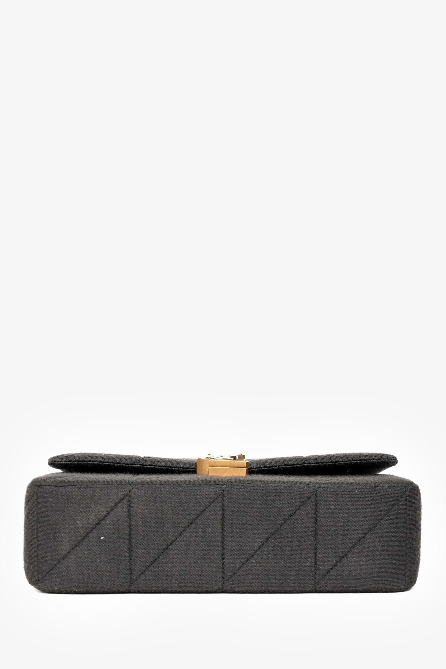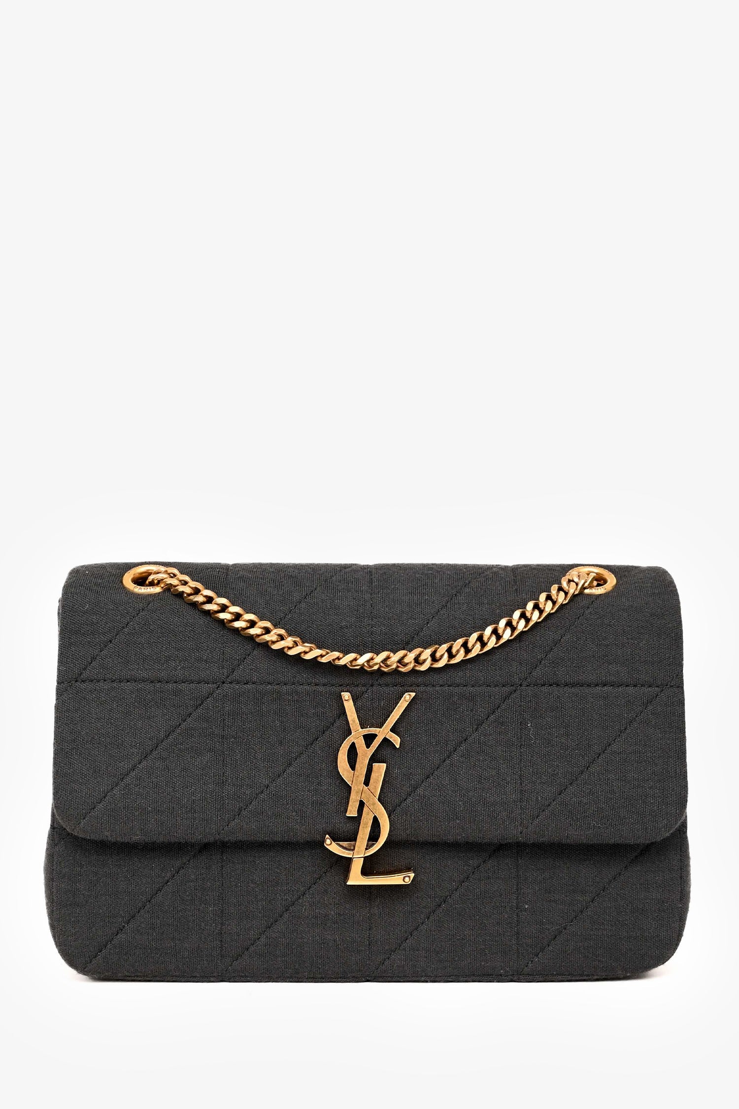 Saint Laurent Black Quilted Fabric 'Jamie' Shoulder Bag. Gold-tone hardware. Fold-over flap with a turn-lock closure on the logo. Quilted, jersey fabric. Lined leather interior with a single card slot. Chain-link shoulder strap. Tonal stitching.