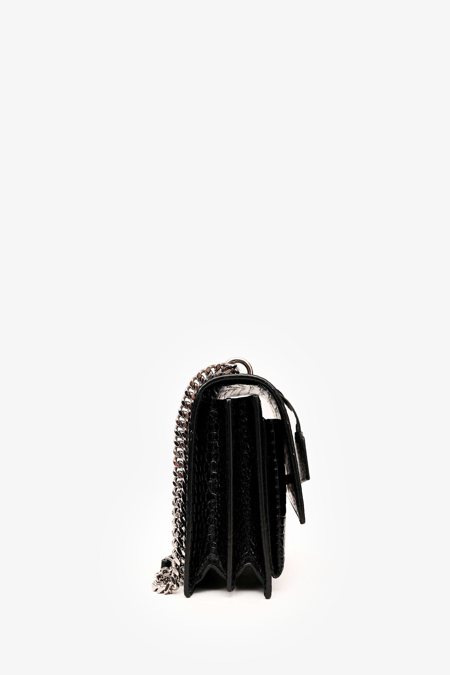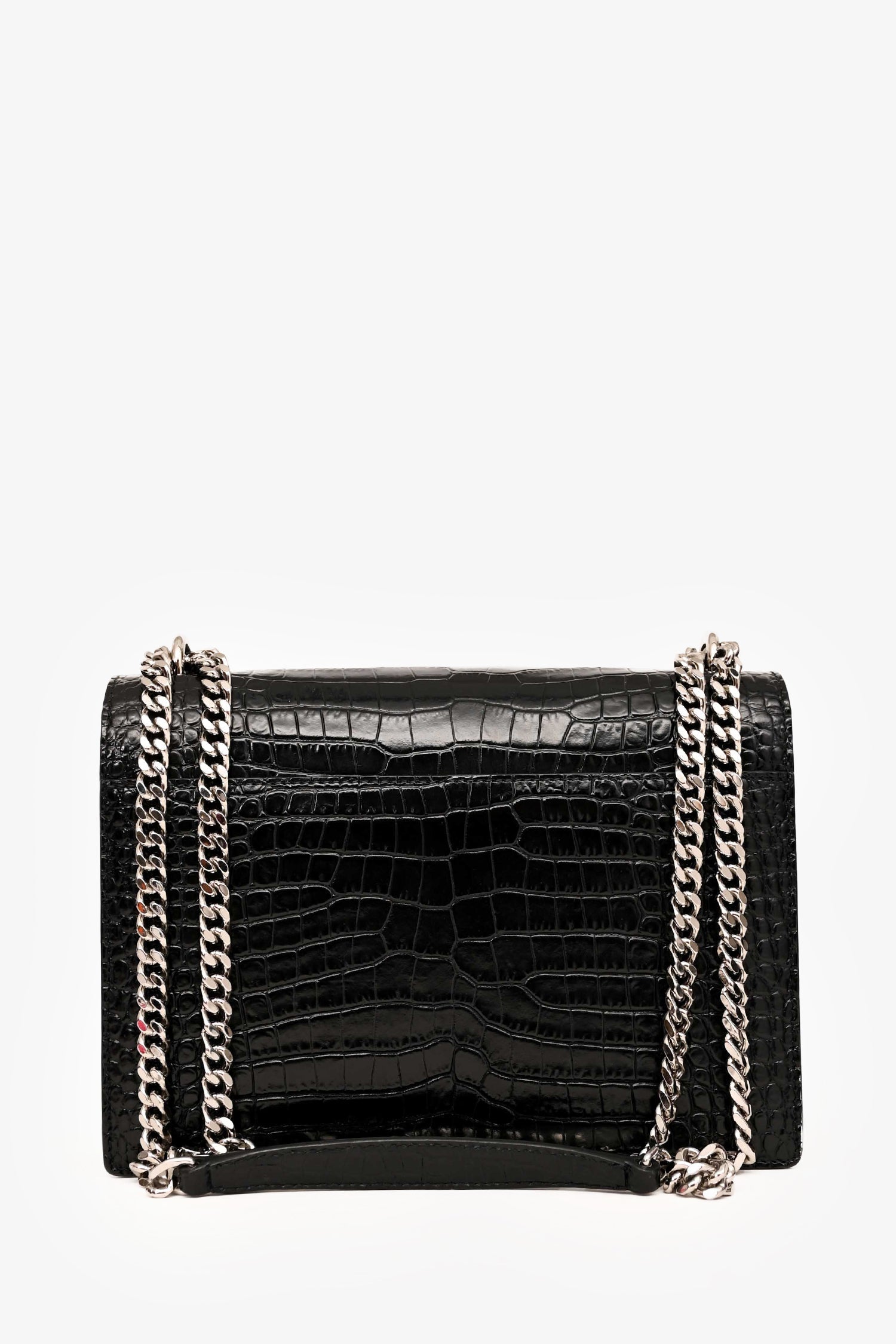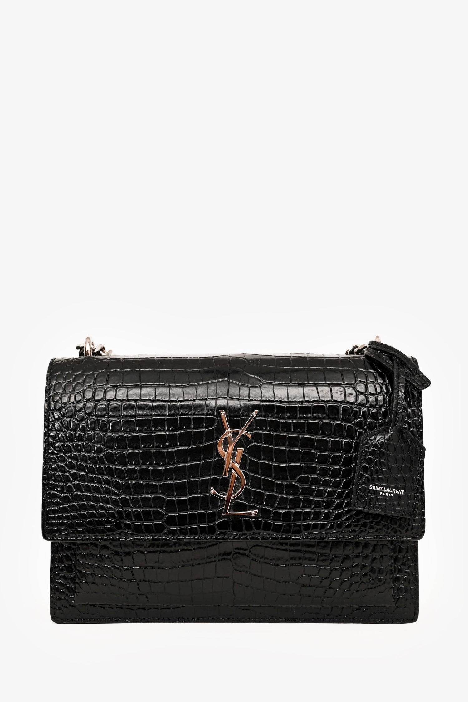 Saint Laurent Black Shiny Croc Embossed Sunset Crossbody SHW. Structured silhouette. Front flap with metal YSL logo and magnetic snap closure. Dual compartment interior with slip pocket. Slip pocket under flap. Single exterior pocket at back. Silver-tone hardware. Chain and leather shoulder strap. Tonal stitching.