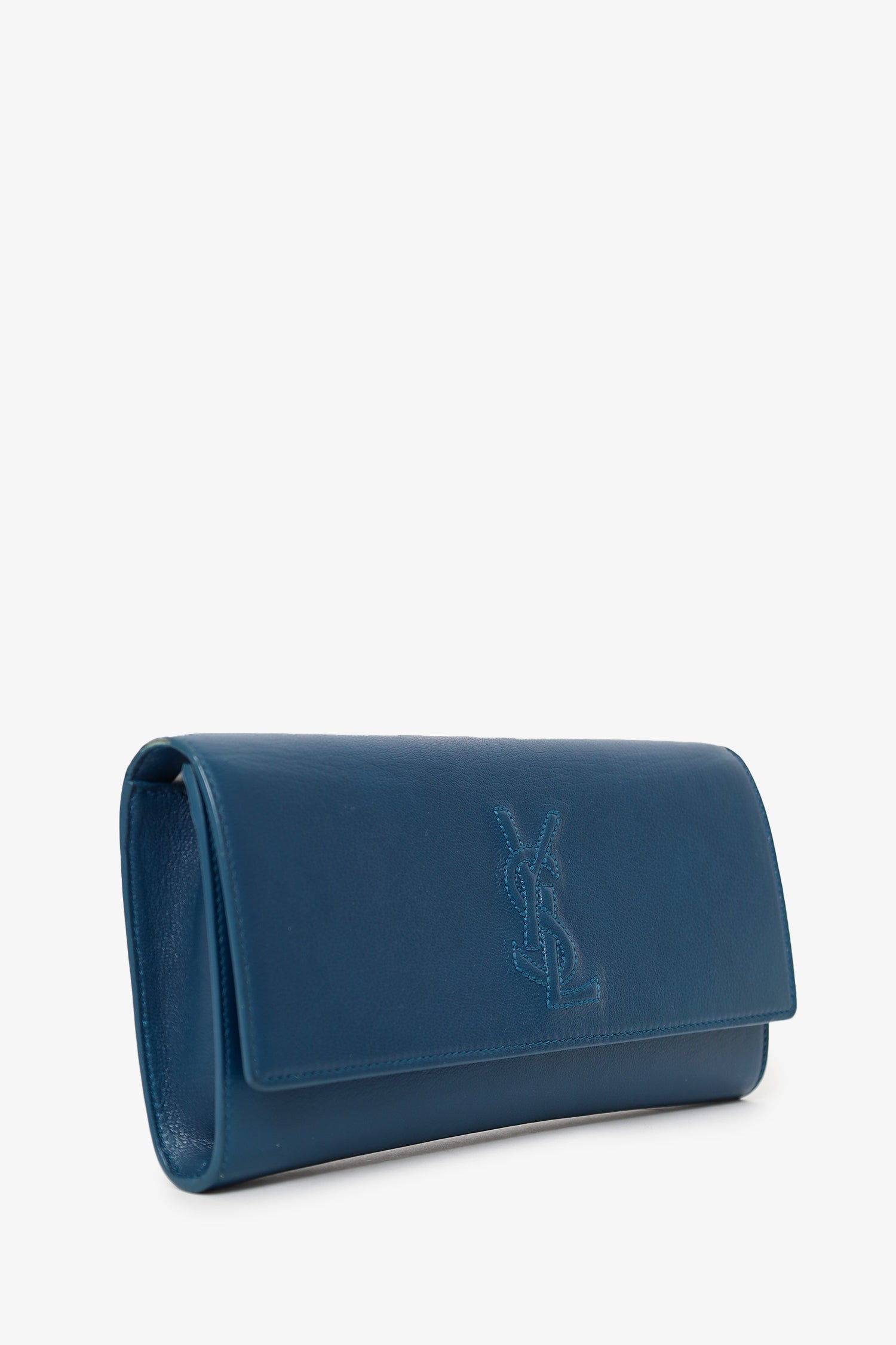 Saint Laurent Blue Leather Navy Blue Glazed Leather Belle De Jour Flap Clutch. Front fold-over flap with snap-button closure. Lined interior. Single interior card slot. Tonal stitching.