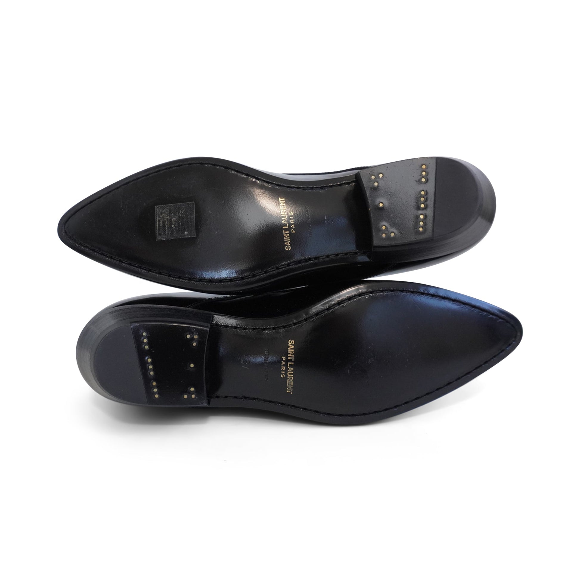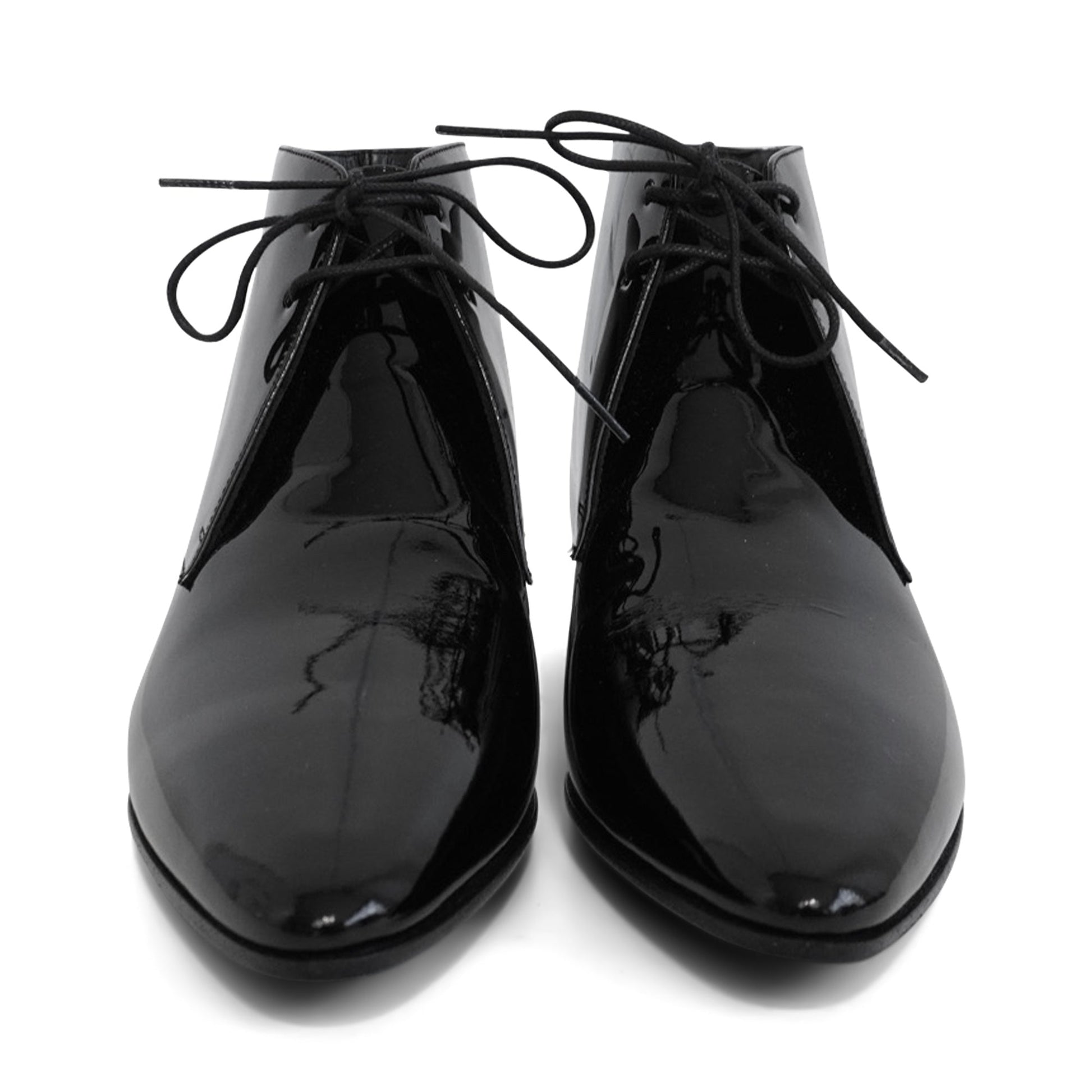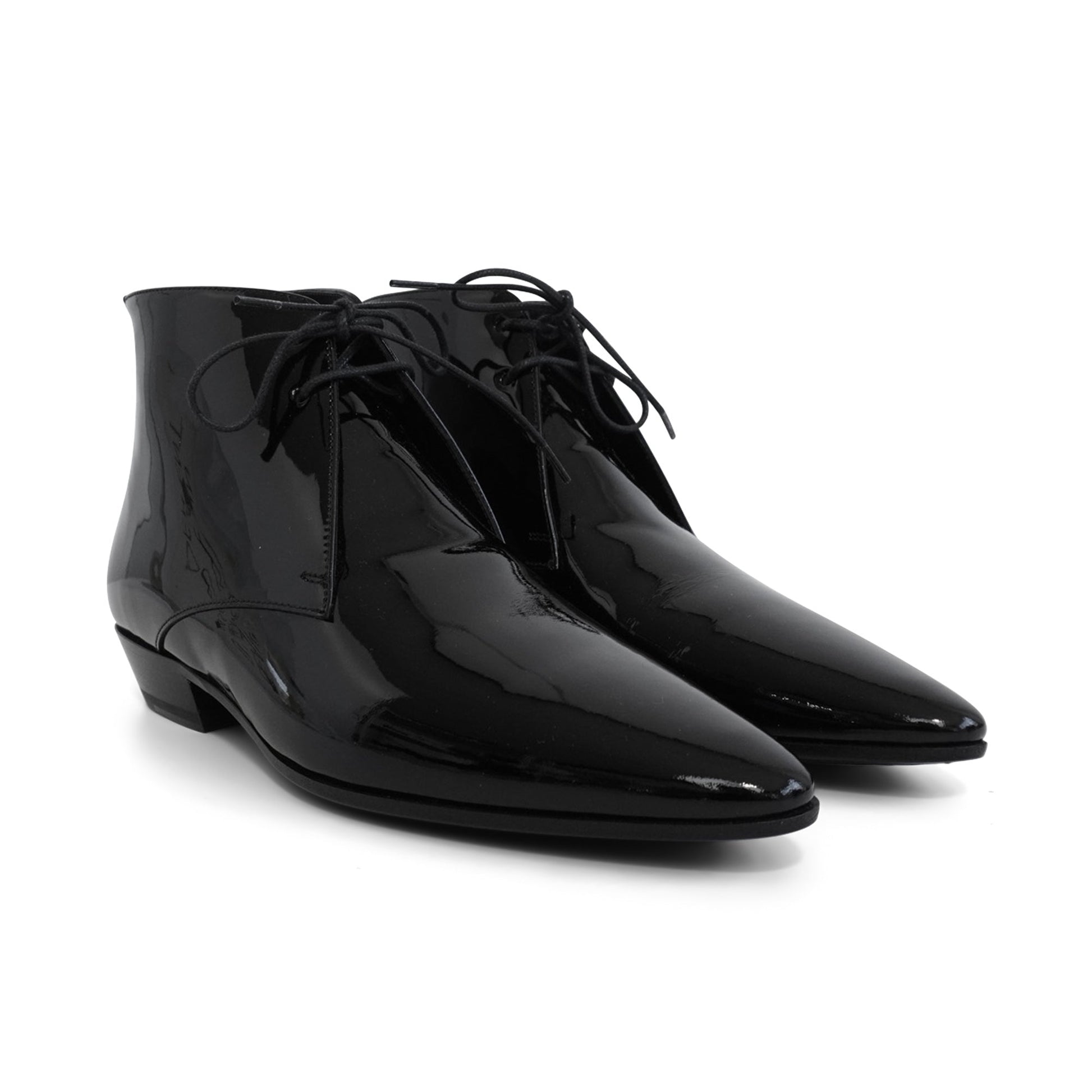 Saint Laurent 'Jonas' pointed toe, lace up ankle boots in black patent leather with stacked Cuban heels.