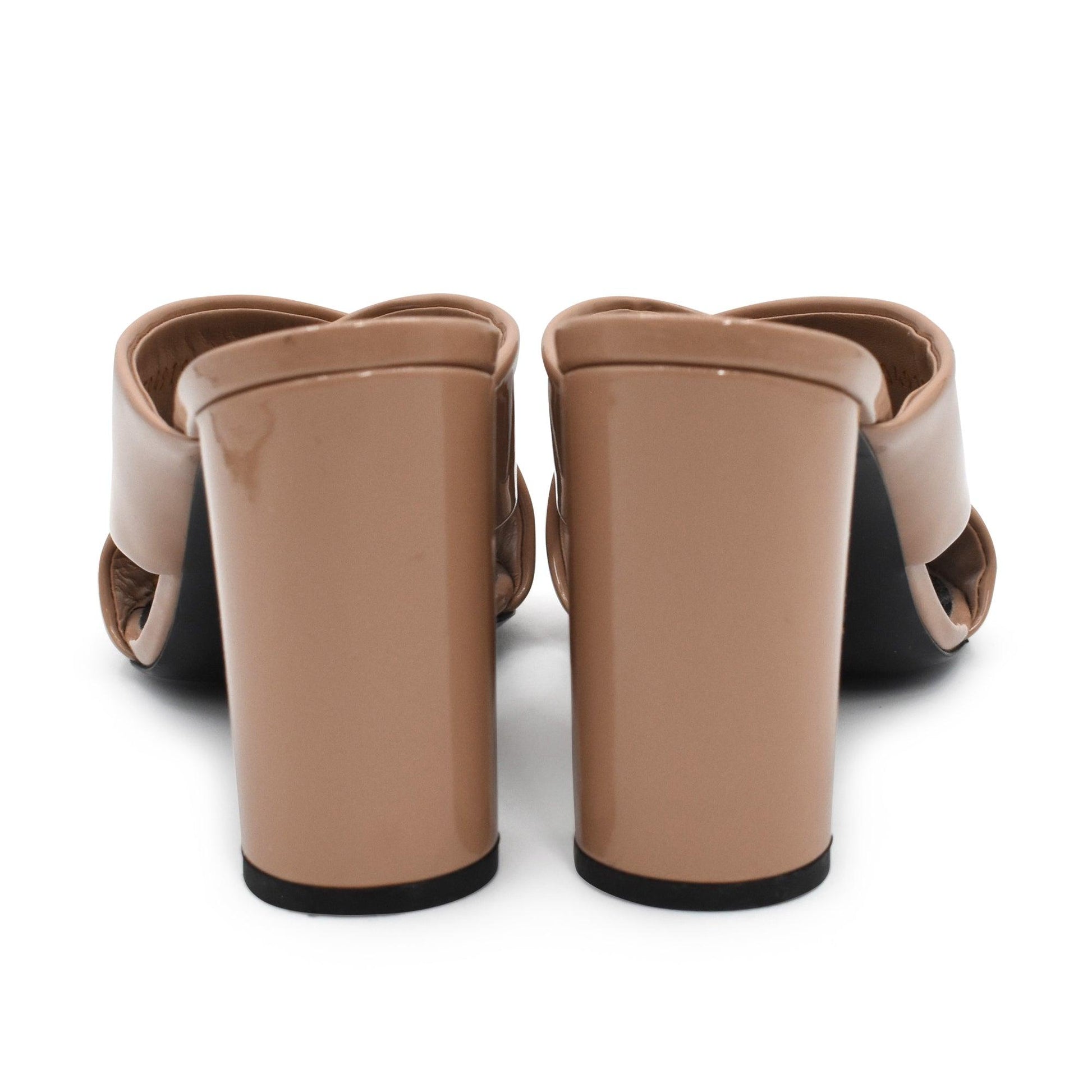 Saint Laurent 'Lou' heeled mules in tan patent leather. Features a crossover band, a chunky heel, and square toe.