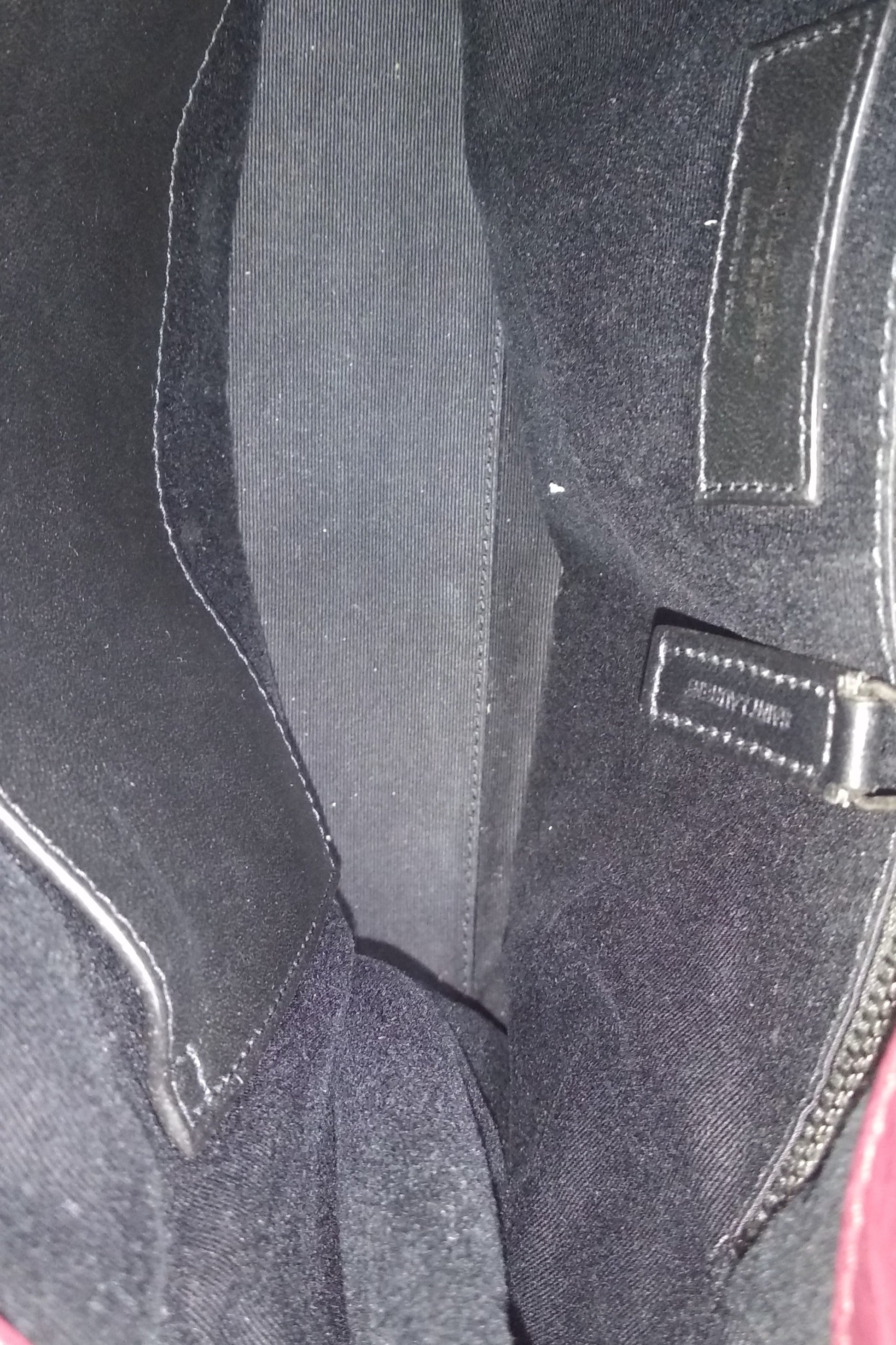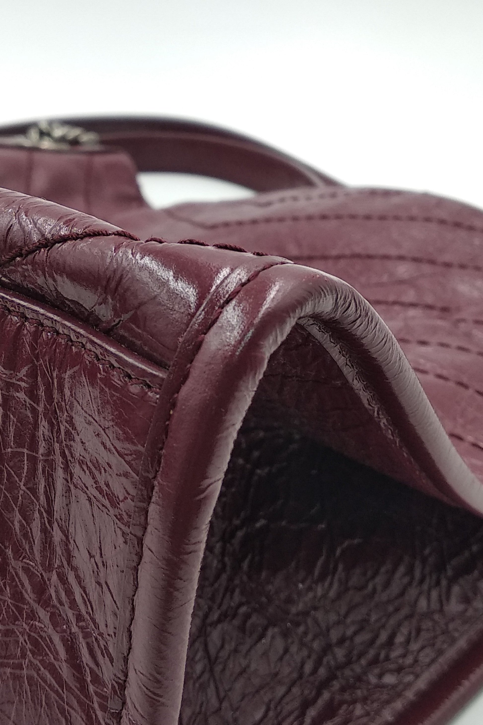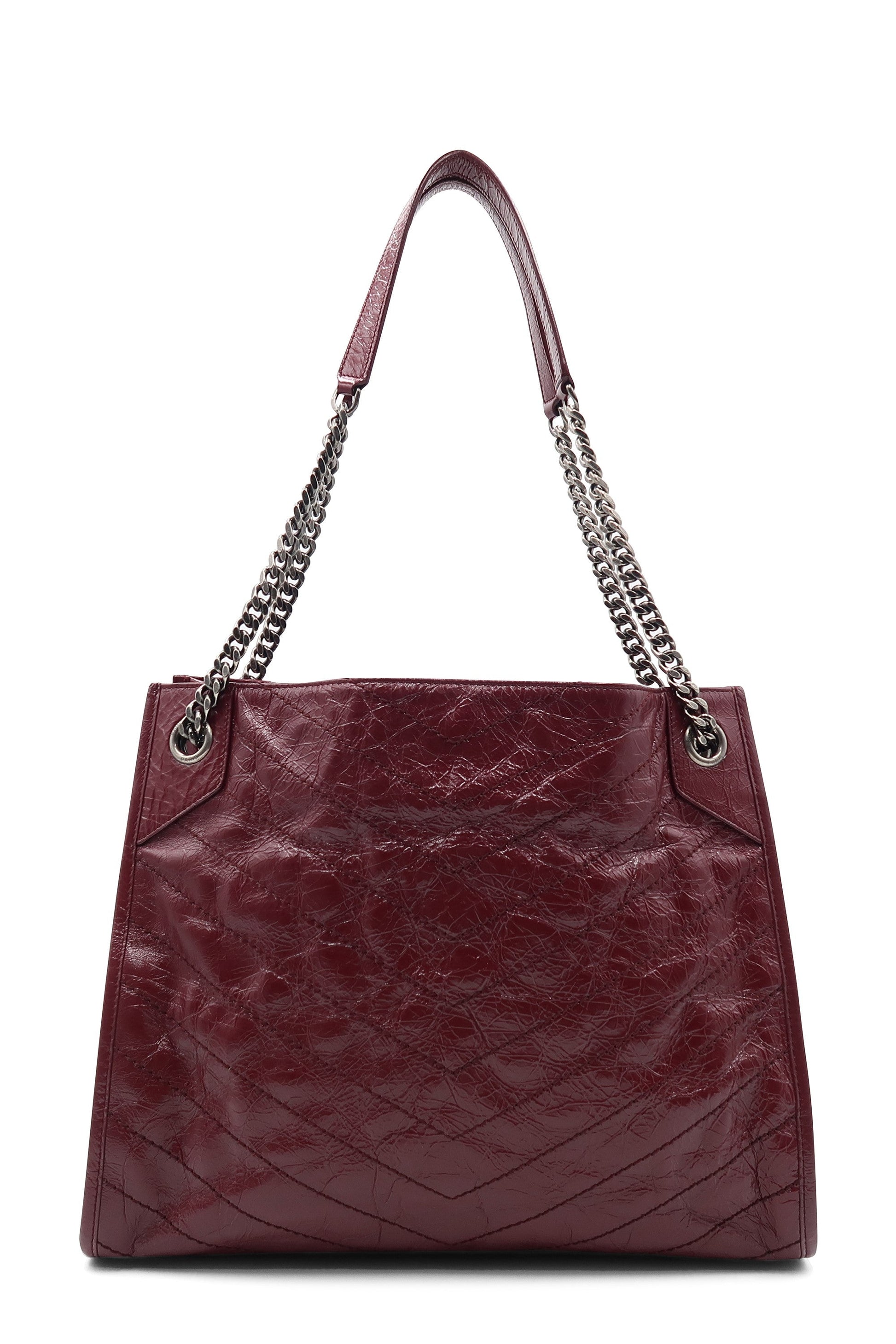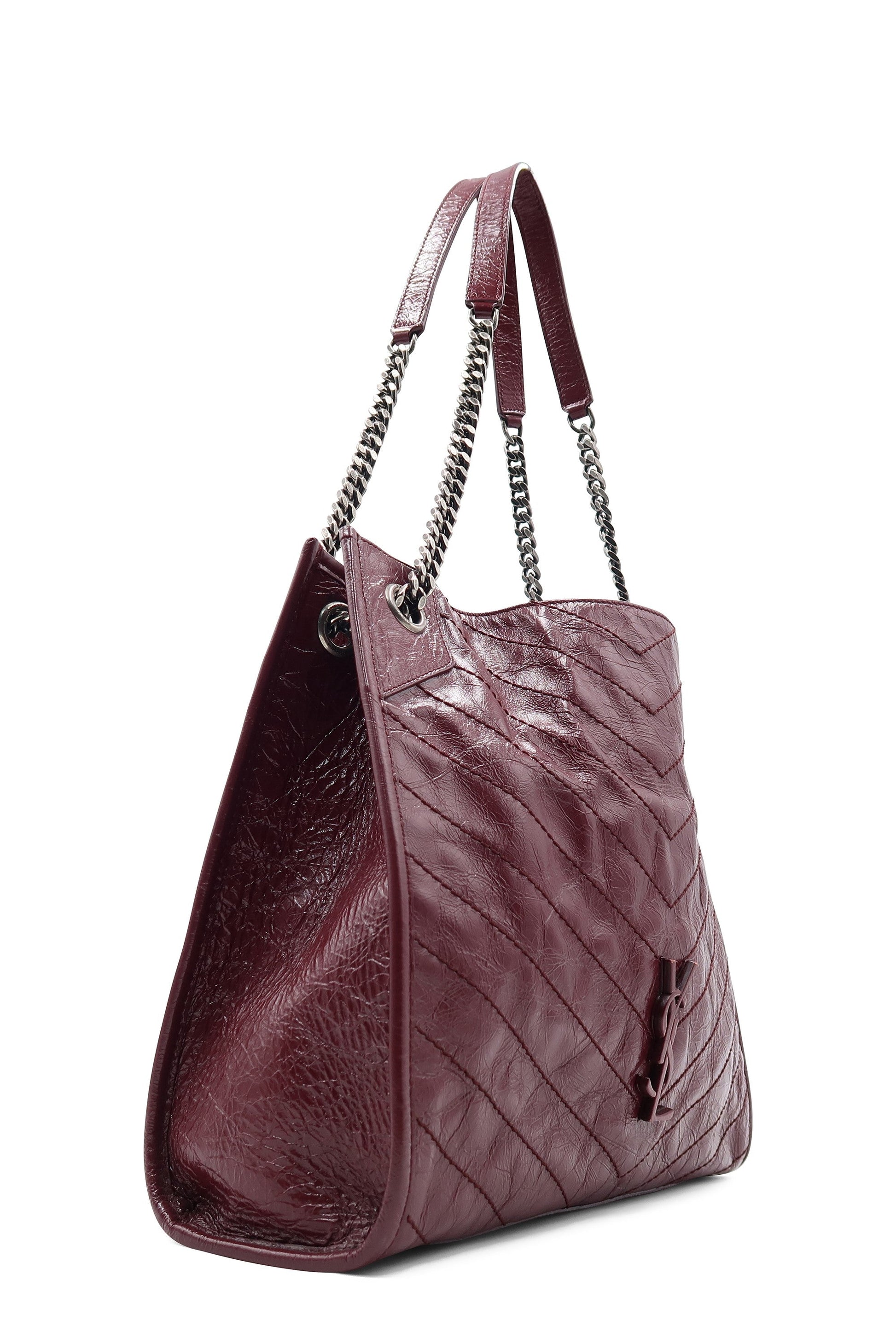 This is an SAINT LAURENT Monogram Medium Niki Shopping Bag in Maroon. The bag features silver chain-link shoulder straps with leather shoulder pads and a prominent maroon leather YSL monogram detail on the front. The top opens with a magnetic snap to a black fabric interior with zipper and patch pockets.