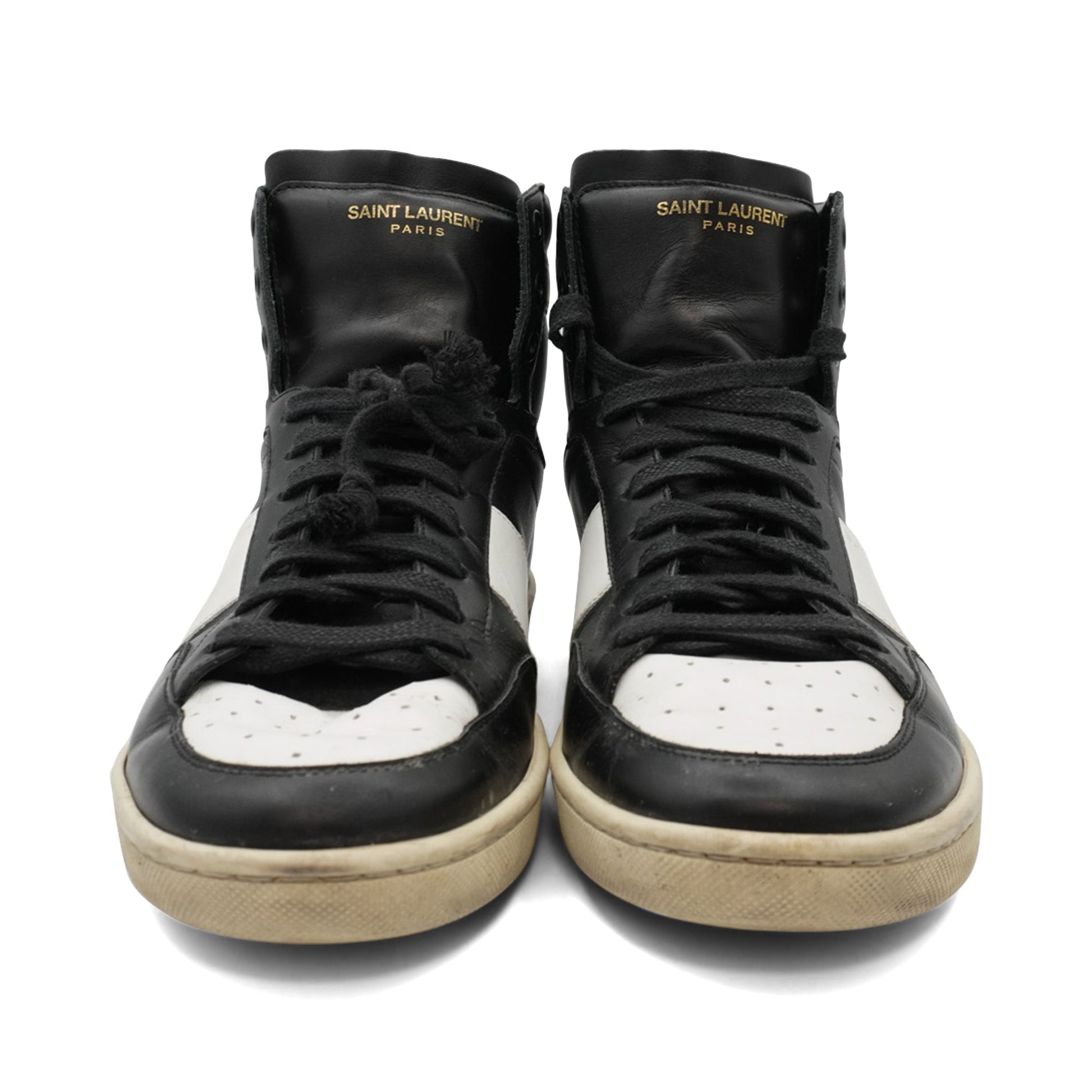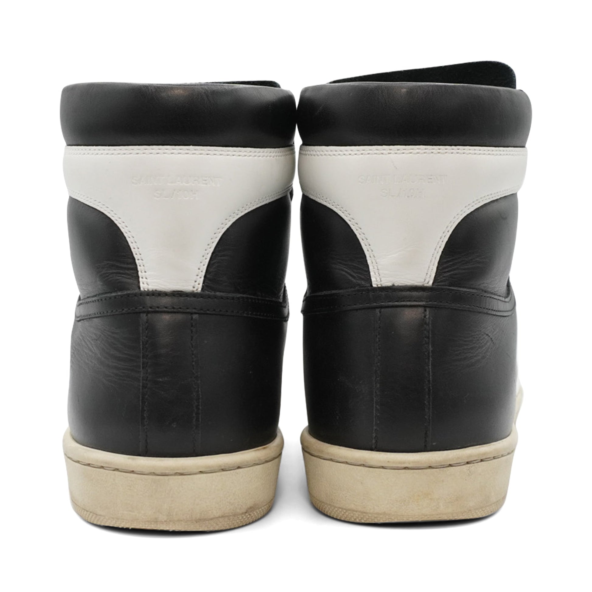 Saint Laurent 'SL10H' high top sneakers in black and white leather panels with gold foil logo stamping on the tongue.
