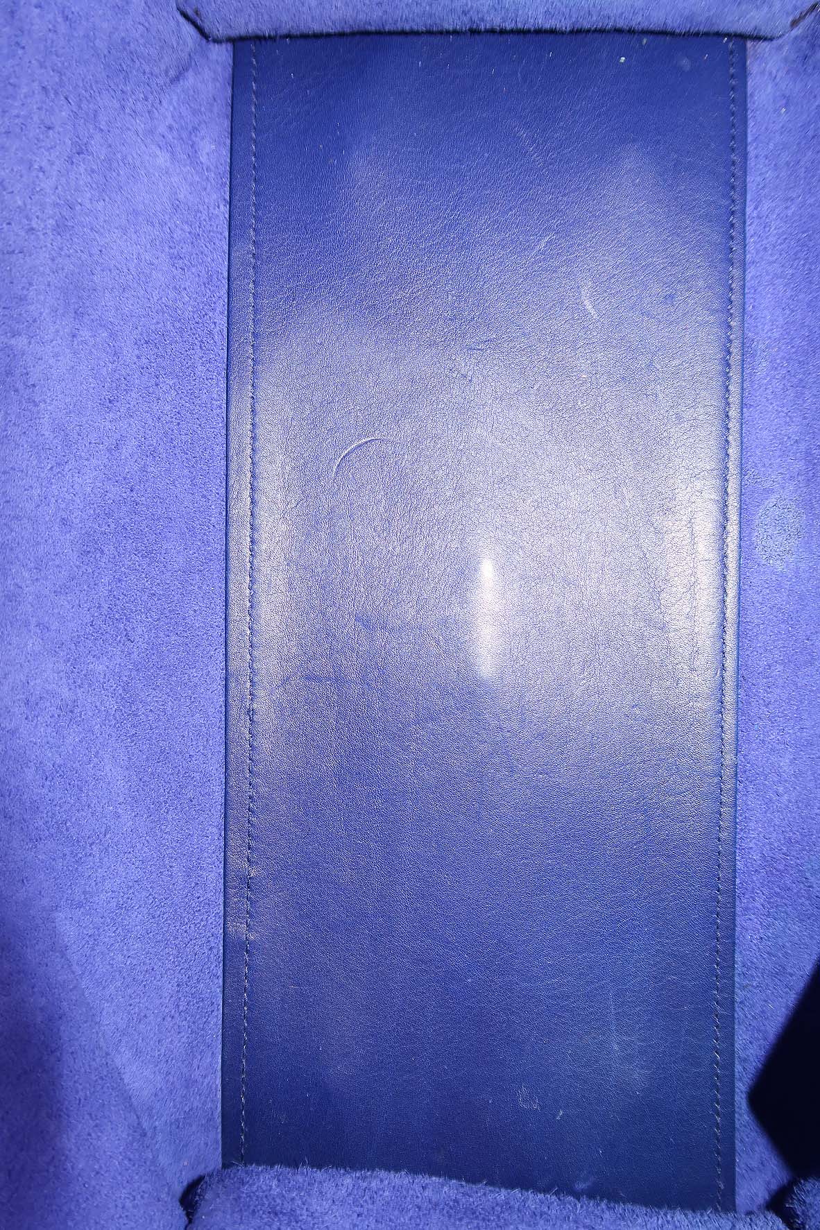 Exterior overall have scratches. Exterior corners bottom and top edge have peeling and cracking. Interior suede and leather have scratch mark and stain. Exterior hardware metal overall have scratches.