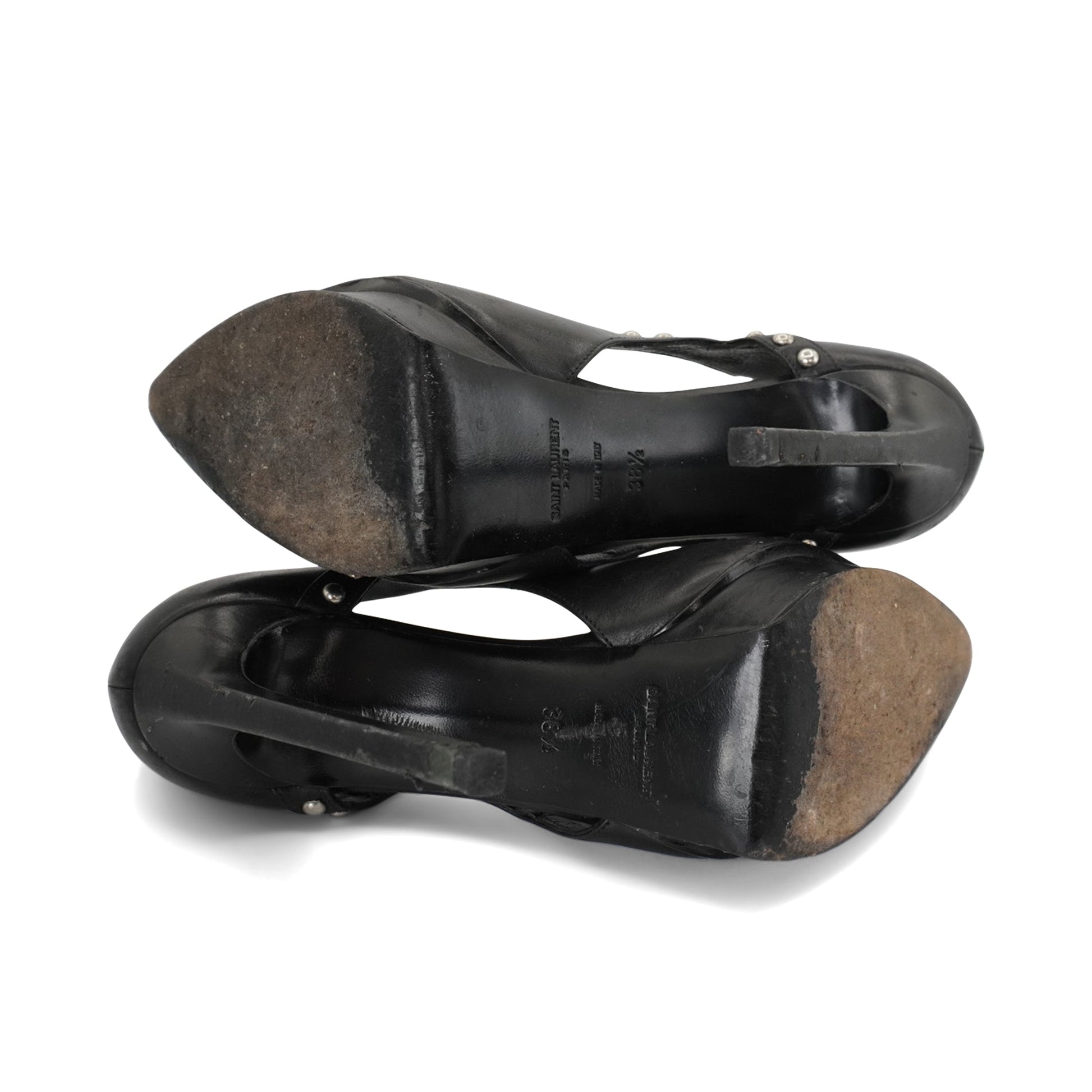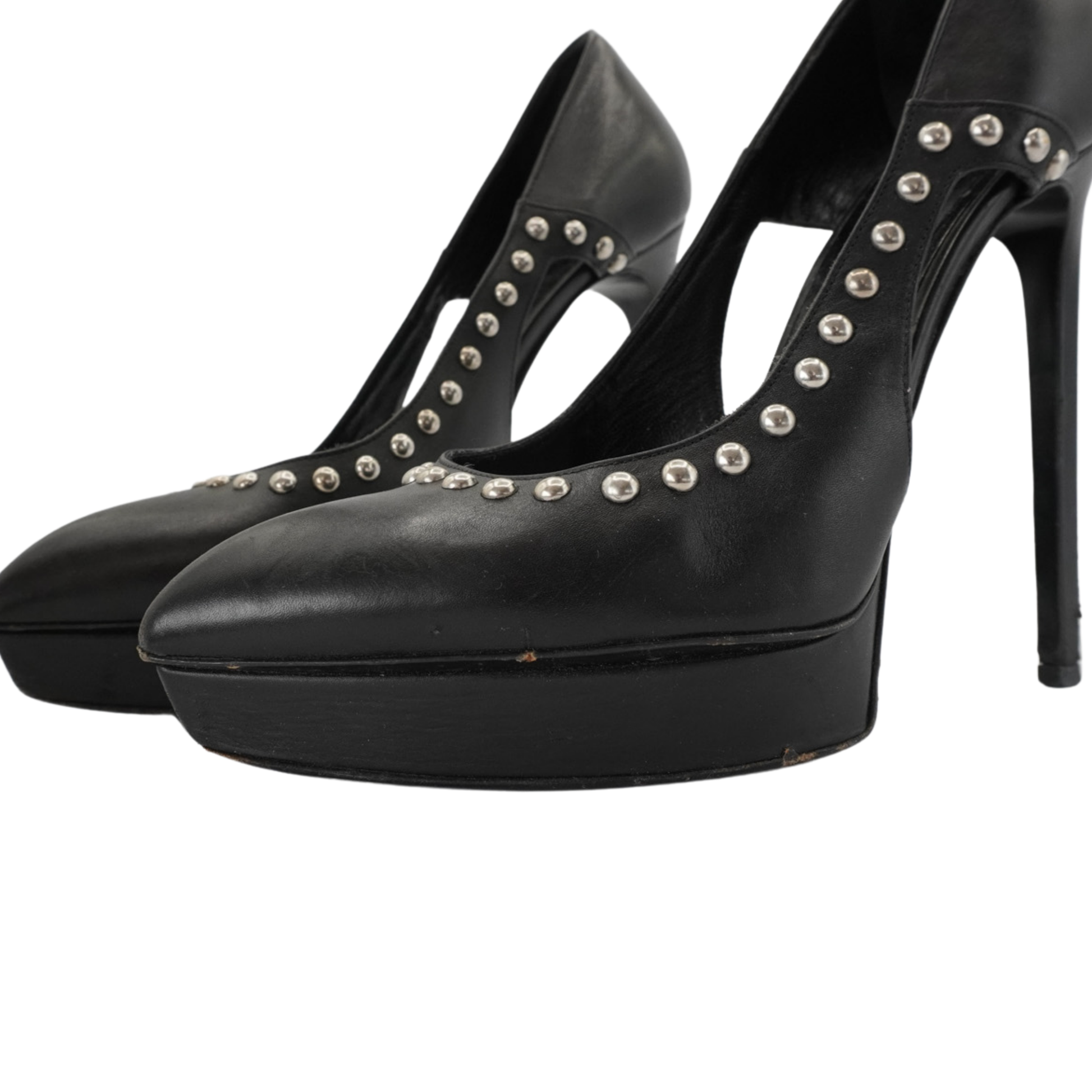 Saint Laurent 'Janis' platform heels in black leather with cutouts on the sides, silver round stud embellishments, a stiletto heel, and a pointed toe.
