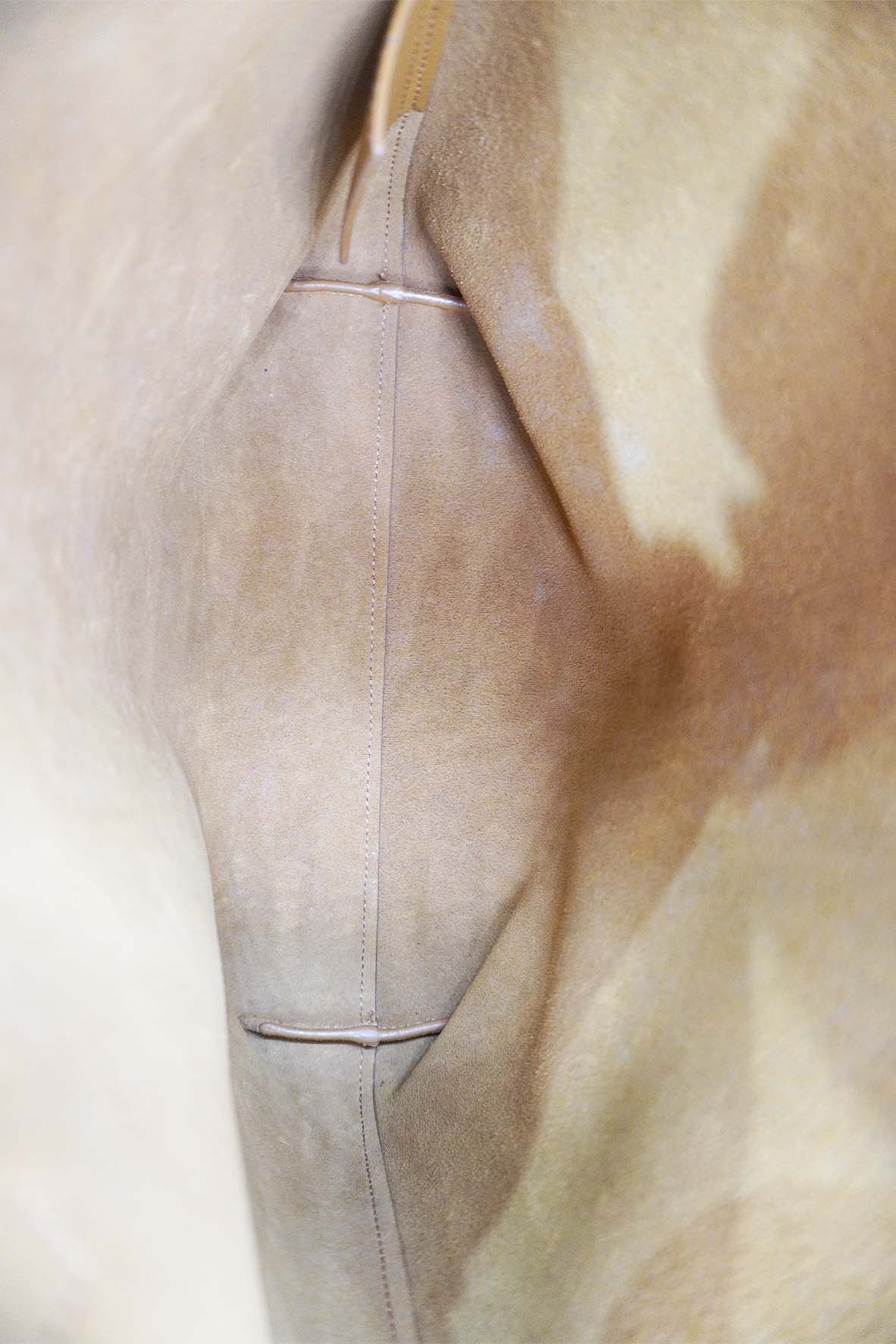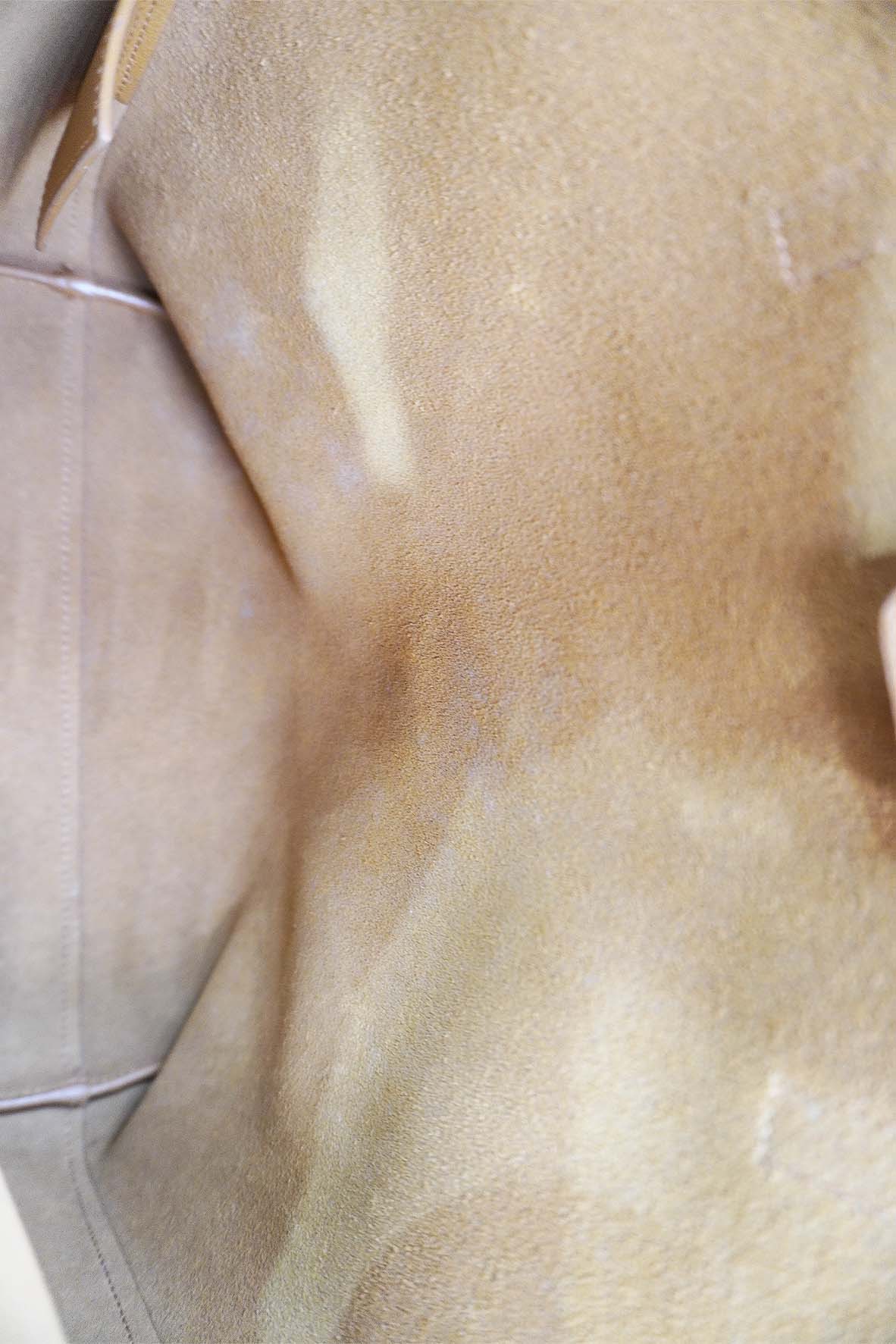 Exterior corners bottom edge have minor peeling. Interior suede have white stains.