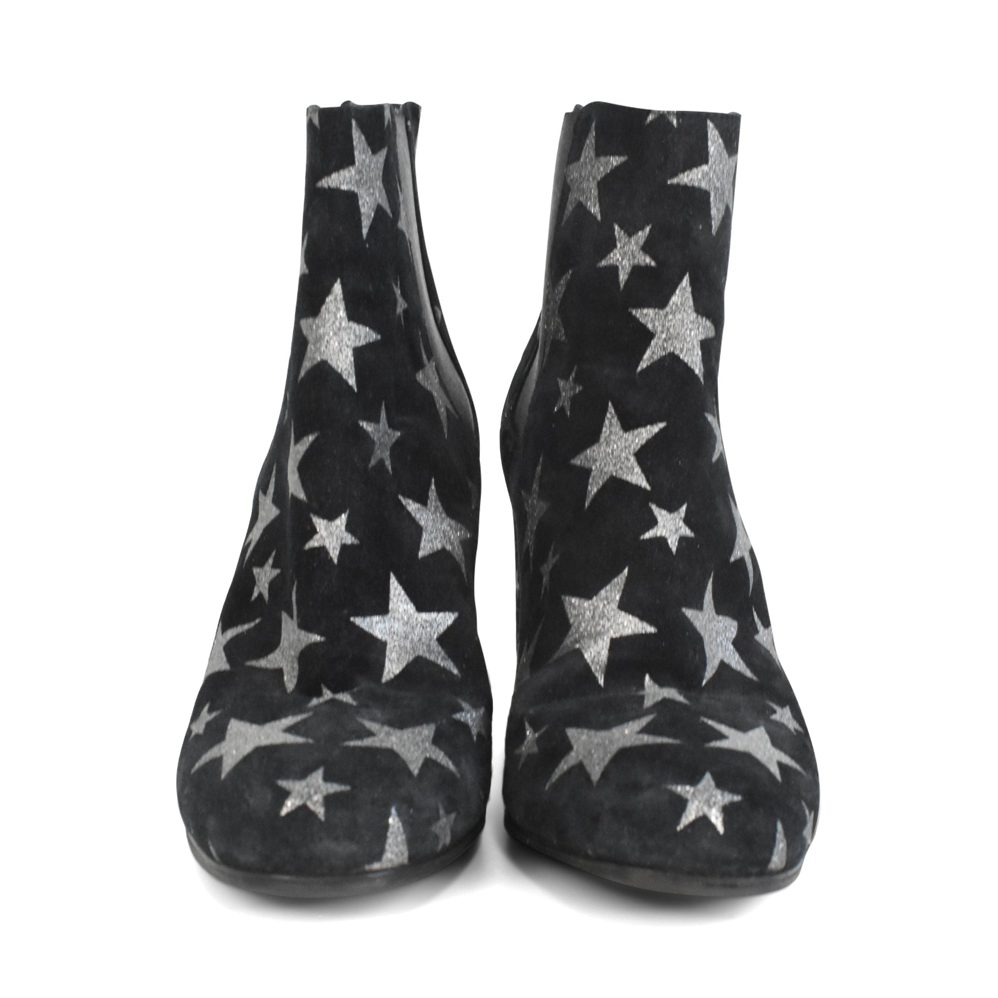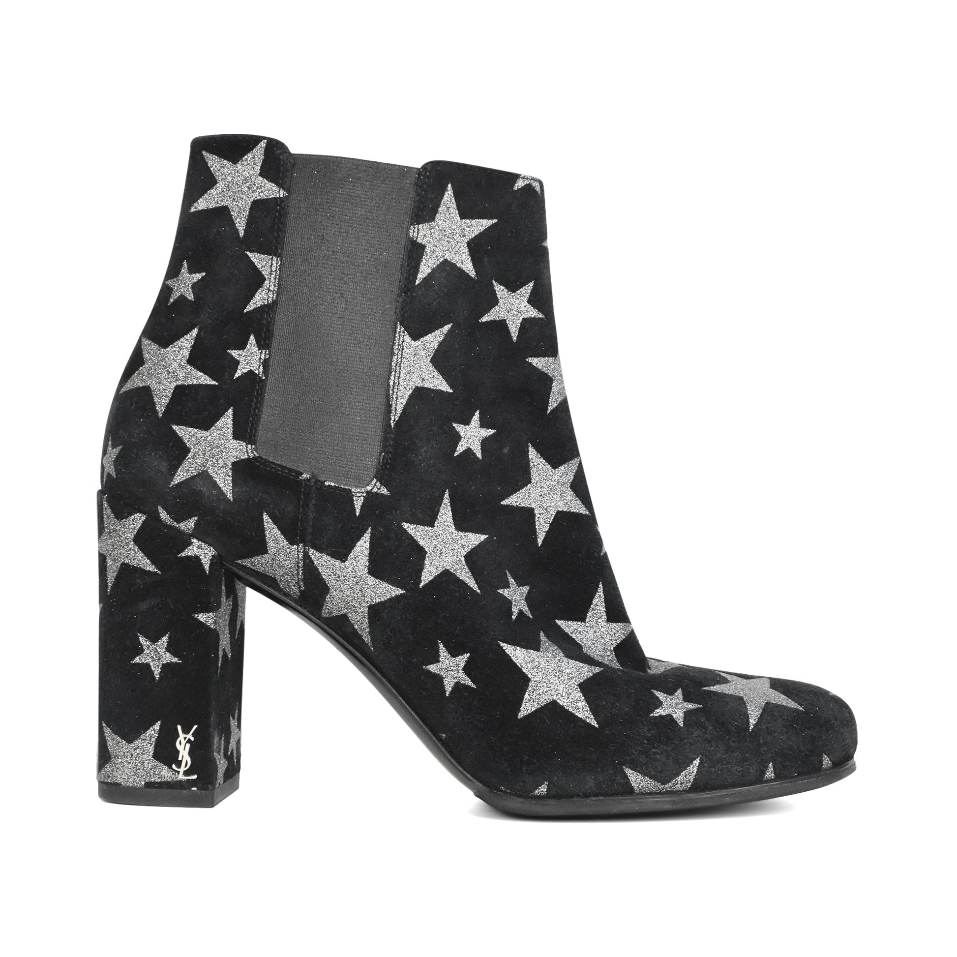 Saint Laurent 'Babies 90' block heel boots in black suede with silver glitter stars throughout, elastic panels, and small YSL logo on the side of the heel.