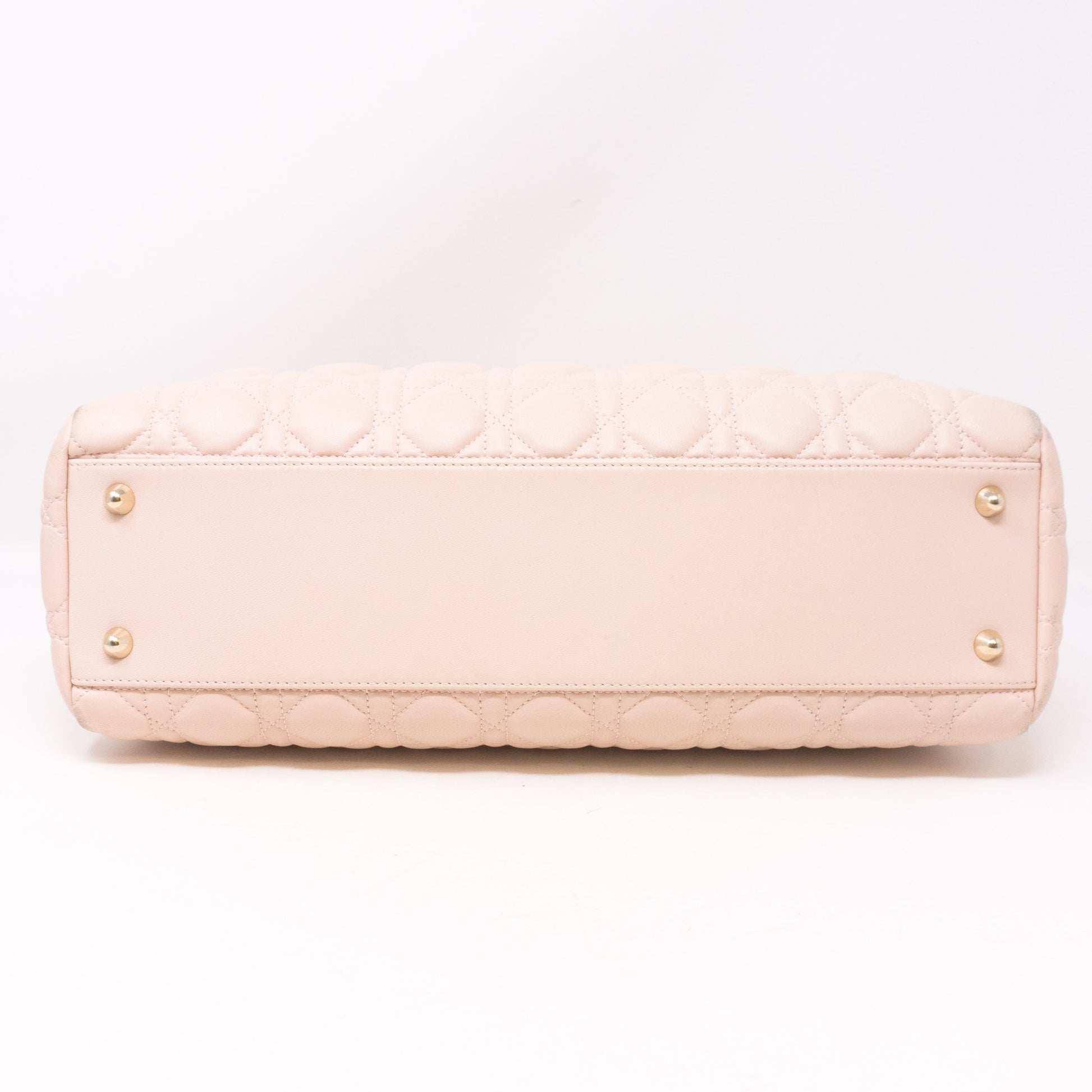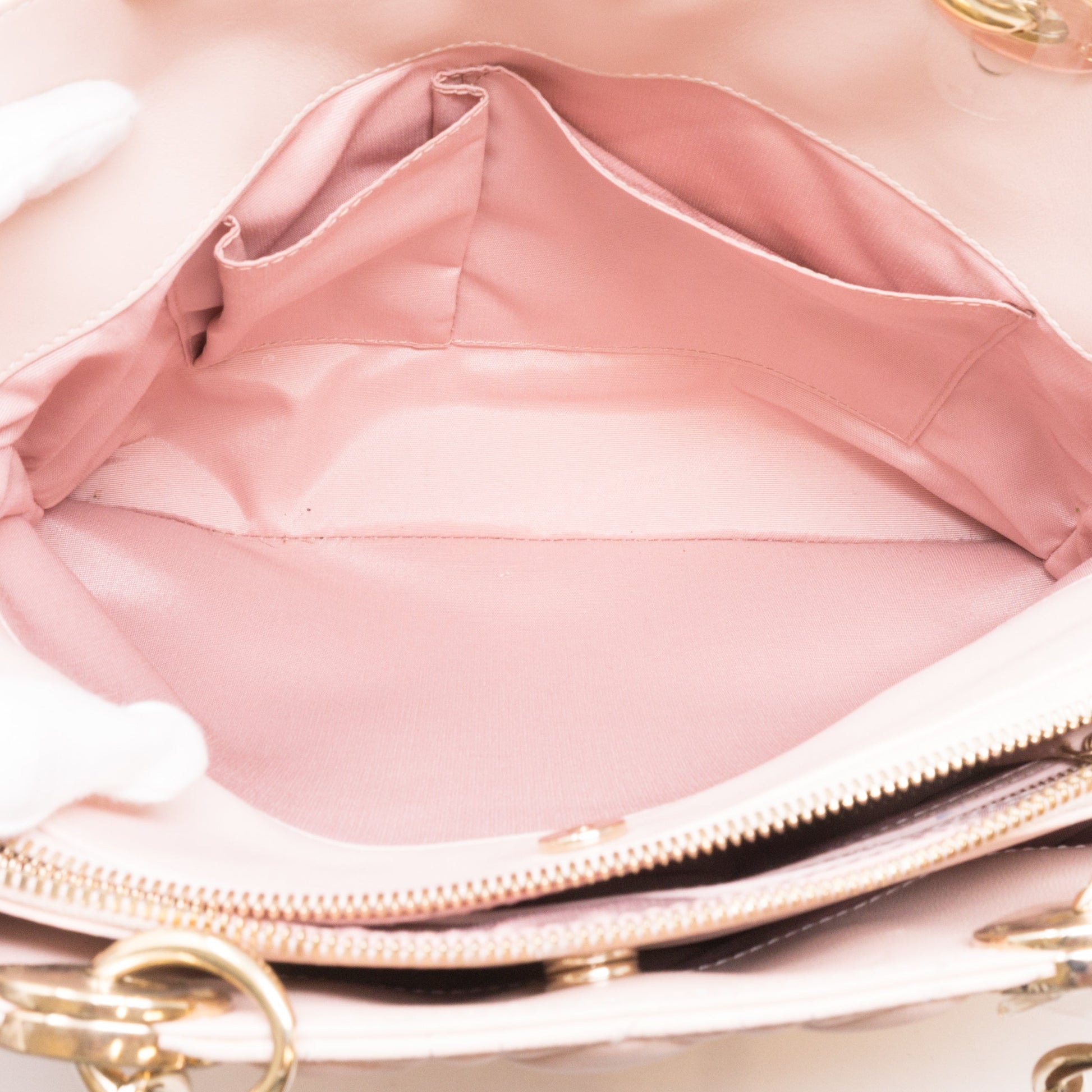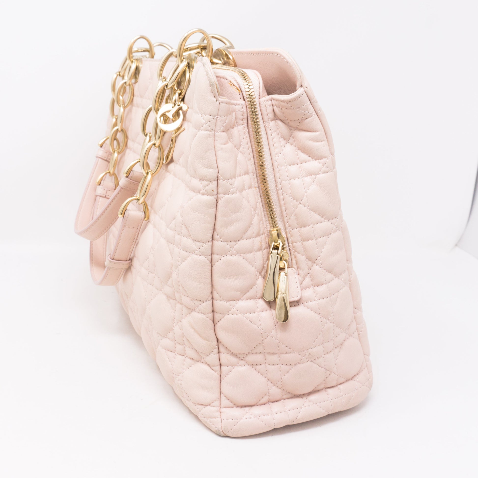 Miss Dior Rendezvous Shopping Tote by Christian Dior. Made with light pink lambskin leather and cold-tone hardware. Beautiful shoulder bag for everyday use with three large sections, one with a zipper and two with magnet closure. Inside a smaller zipper pocket. Has gold-tone chain handles with leather pads for comfortable carrying.