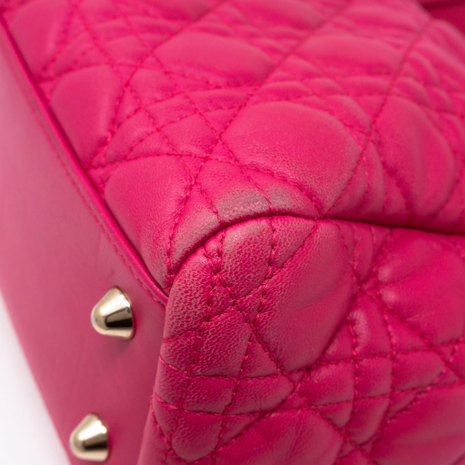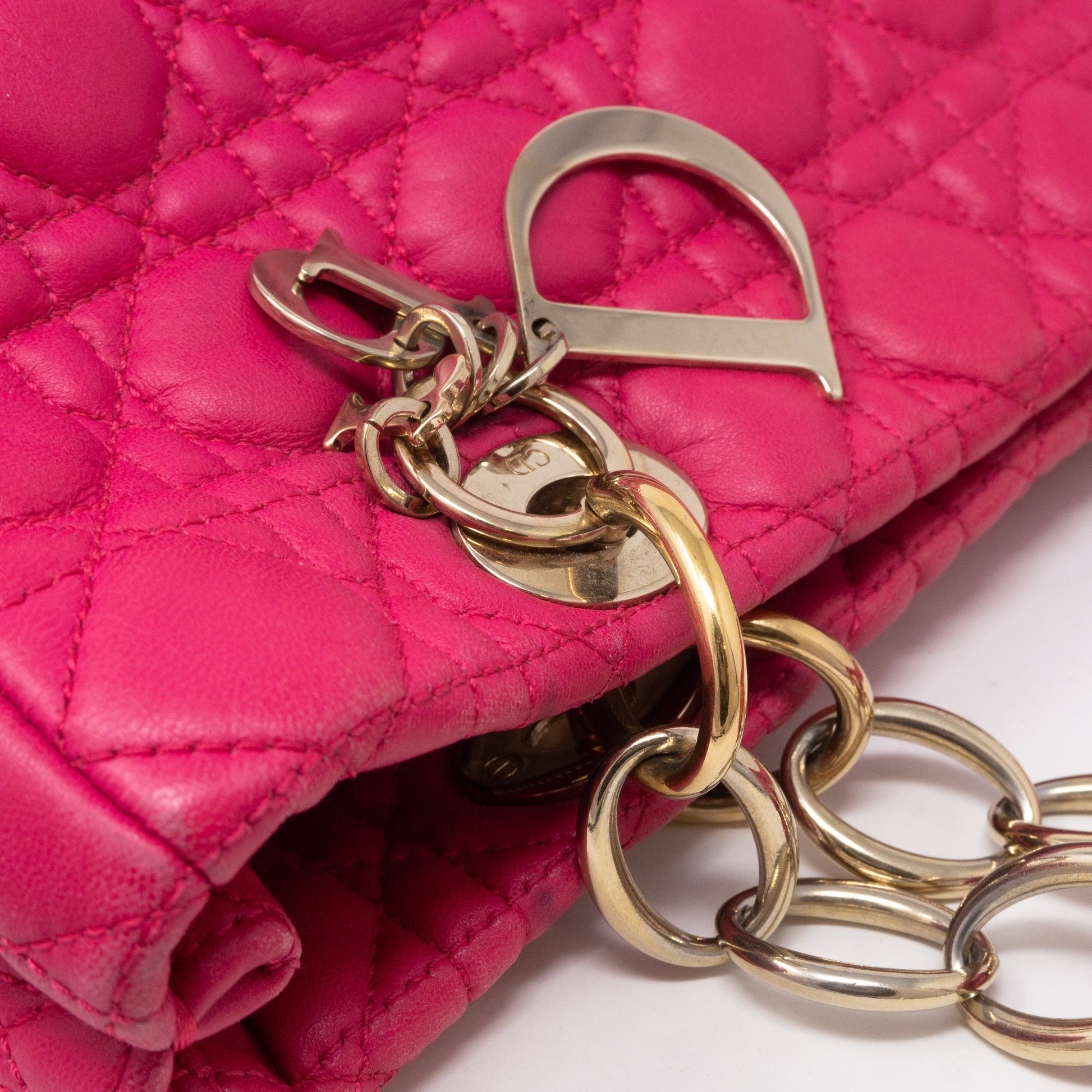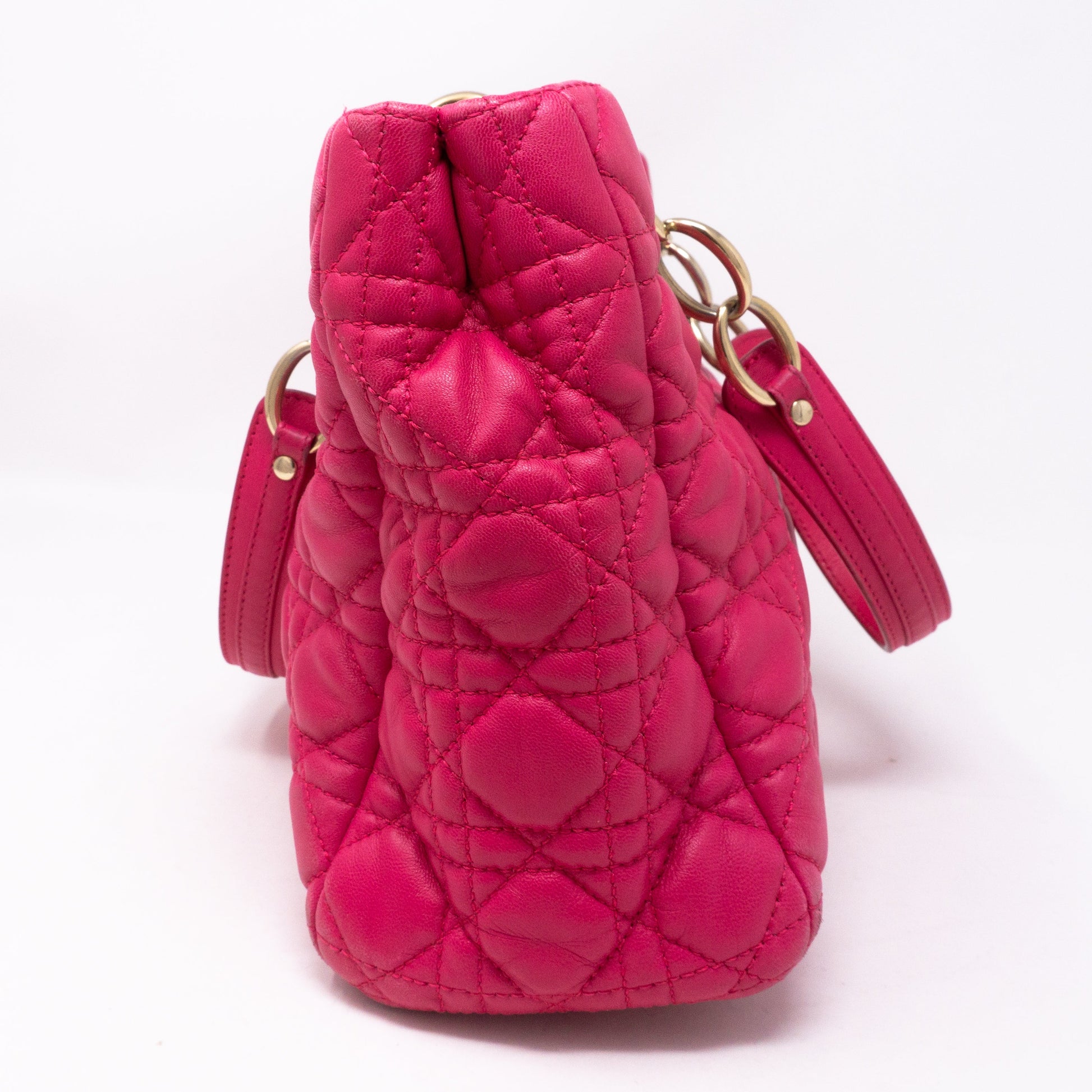 Small Soft Shopping Tote by Christian Dior. Made with colorful pink lambskin leather and light-gold toned hardware. Beautiful shoulder bag for everyday use with three large sections, one with a zipper and two with magnet closure. Inside a smaller zipper pocket. Has chain handles with leather pads for comfortable carrying.